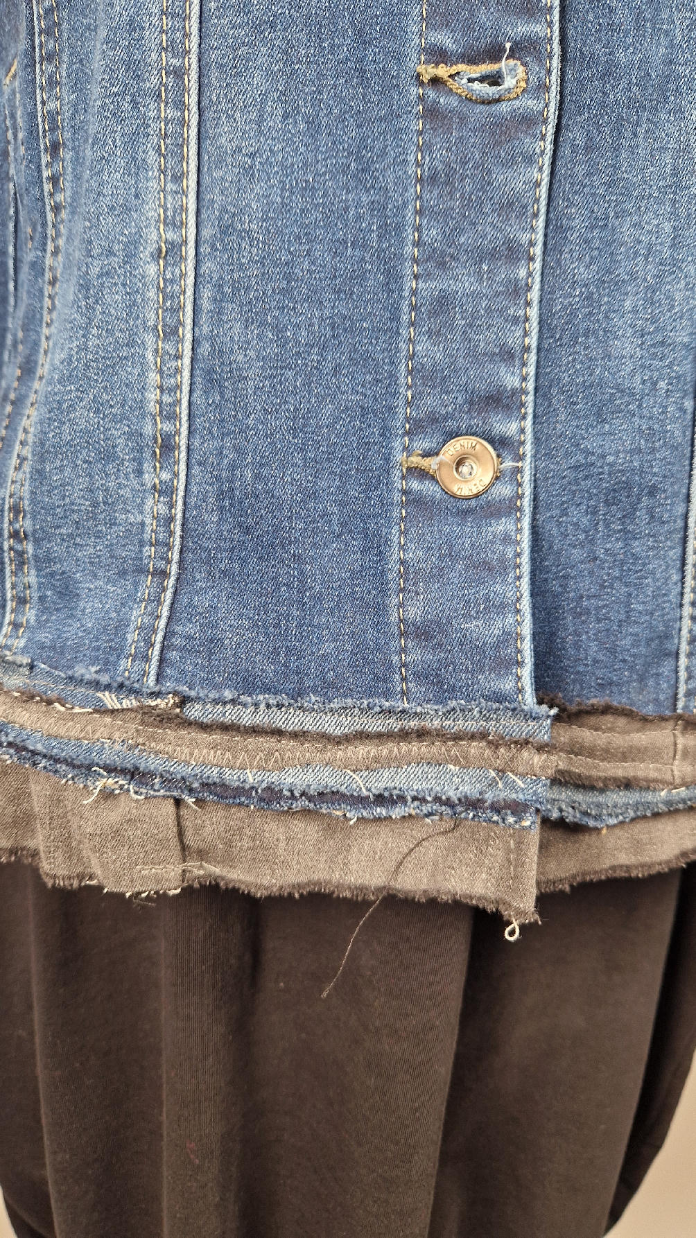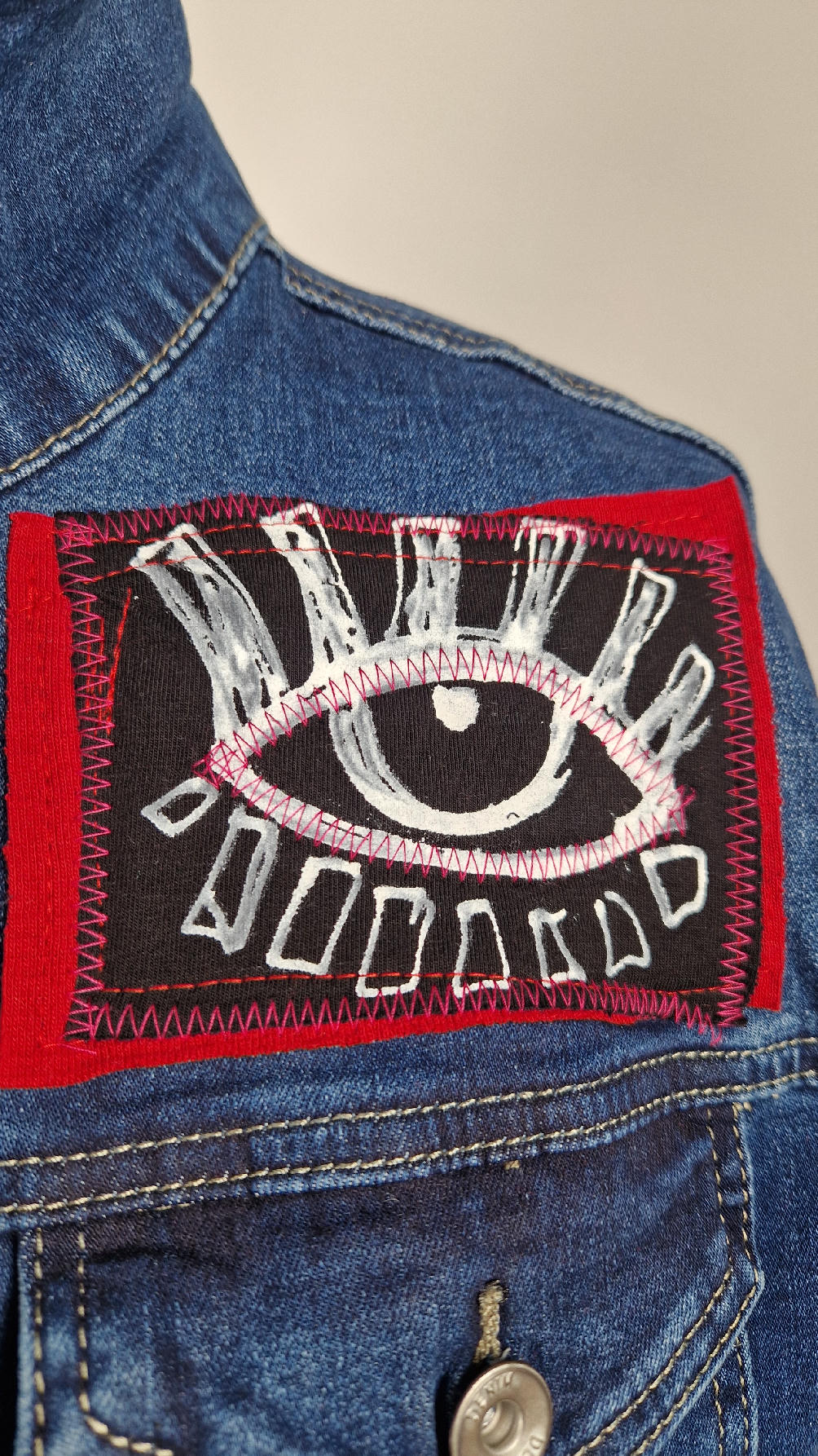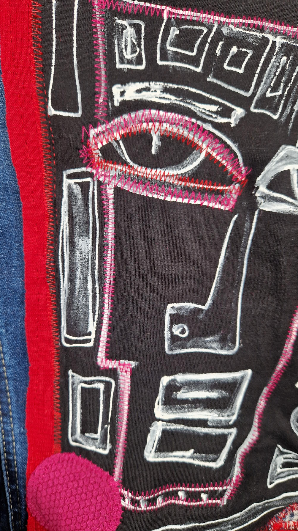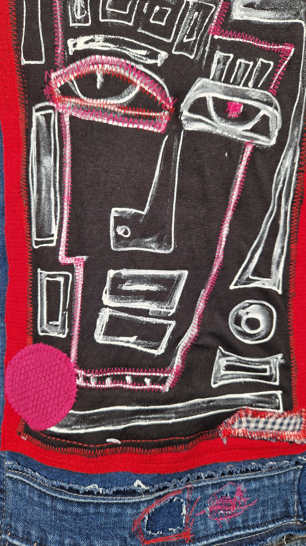 Katana z megaelastycznego,  miękkiego, niebieskiego jeansu, którego główną dekoracją jest mój autorski, unikatowy i niepowtarzalny kolaż tkanin na plecach, z namalowanym portrecikiem, z czerwonym wykończeniem- tak energetycznie…do tego falbanki, kratki, jeans na dole…Katana  ma długie, czarne mankiety,  żeby było miękko i wygodnie i oczywiście oryginalnie…, które sprawią, że pokochasz swoją katankę od pierwszego spojrzenia