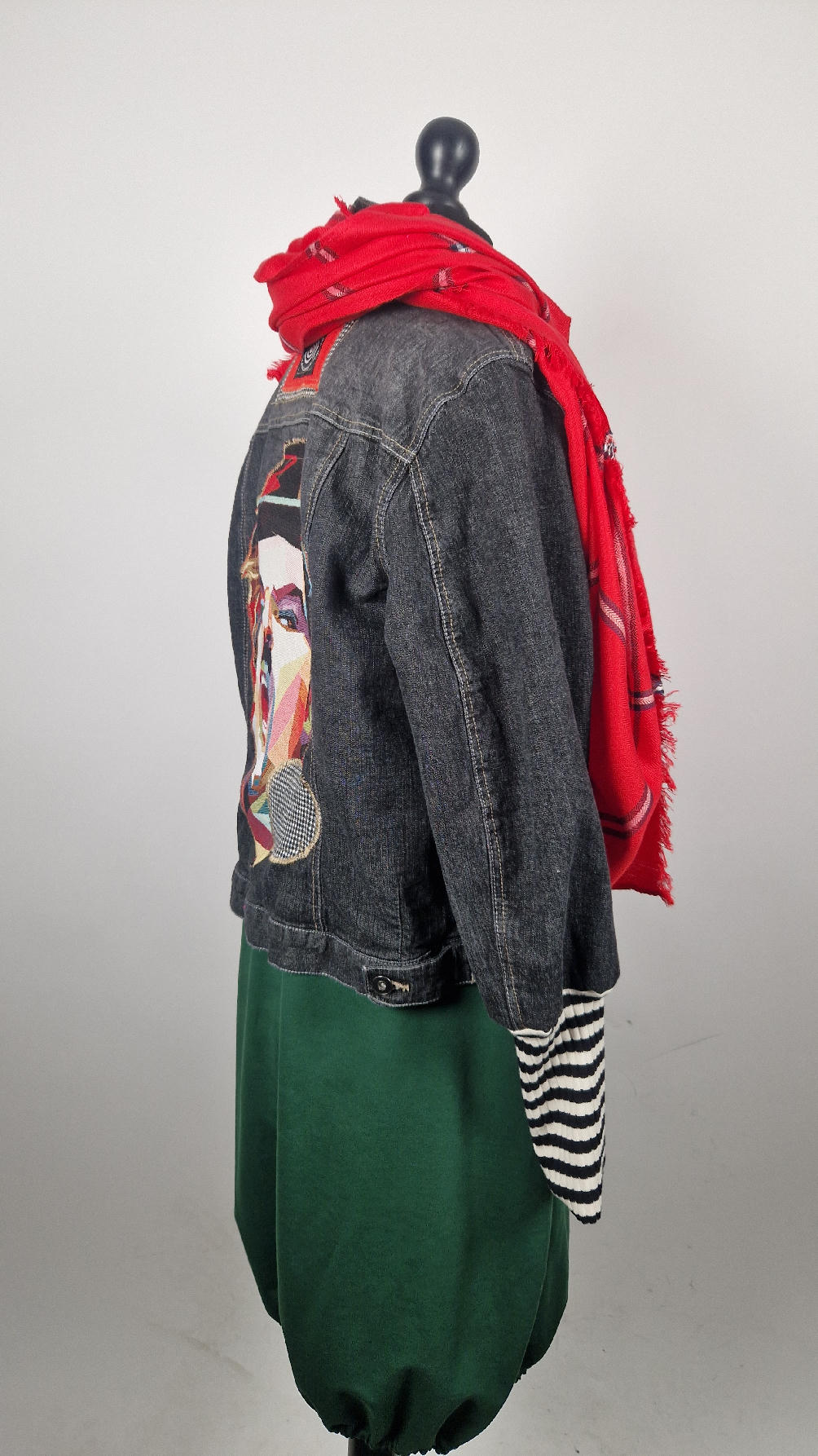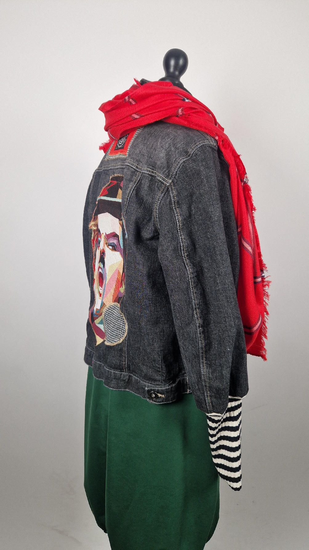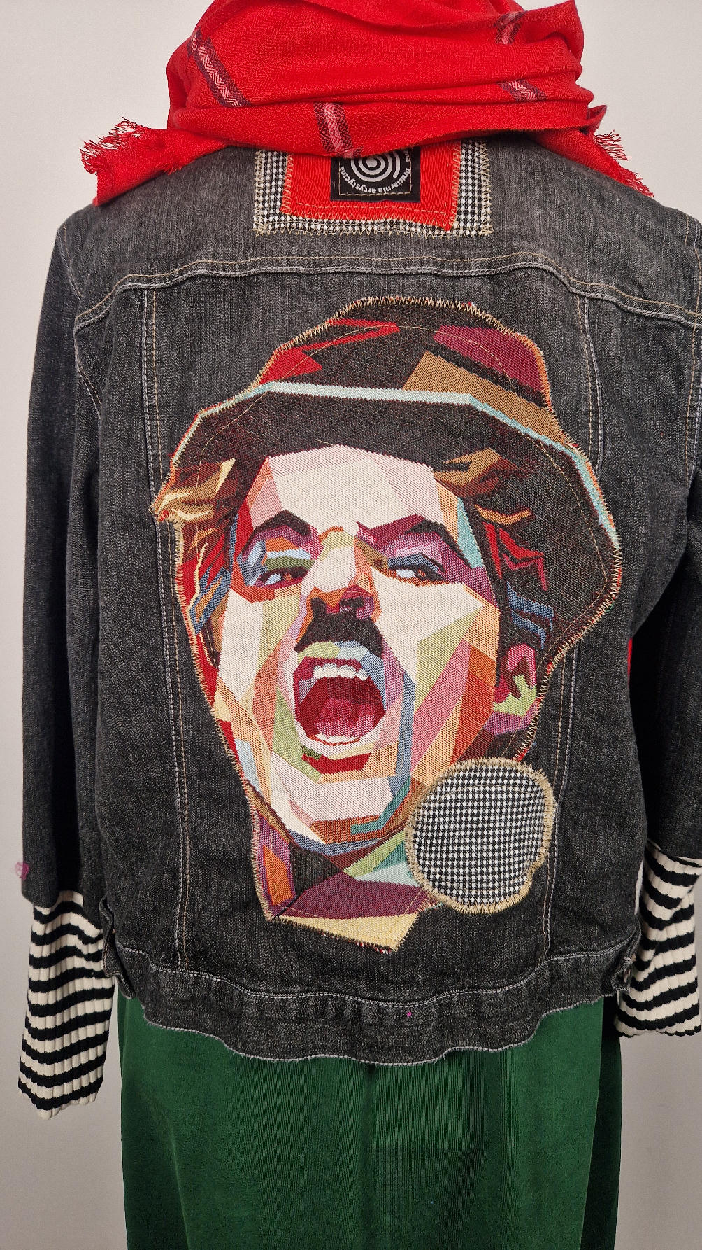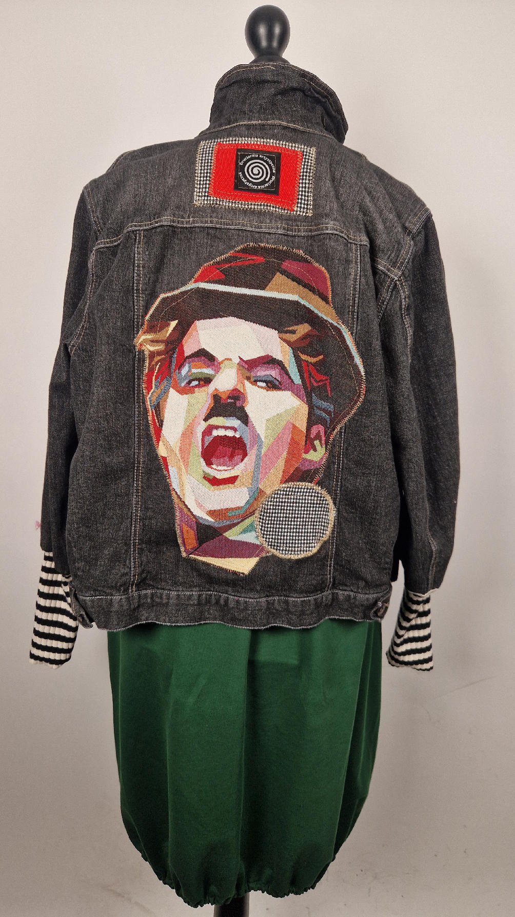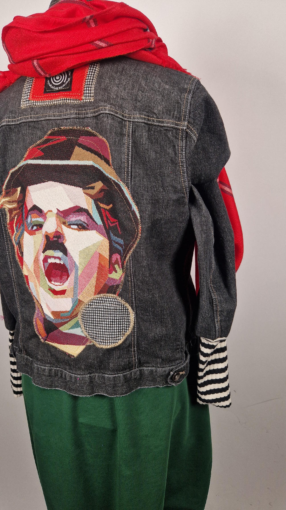 Czarna, a właściwie grafitowa elastyczna katana z unikatowym, megakolorowym wizerunkiem Charliego CHAPLINA na plecach, z rękawami w paski, z kropką w pepitkę…wyjątkowa, wygodna, bo ze streczem, jedna, jedyna , niepowtarzalna!