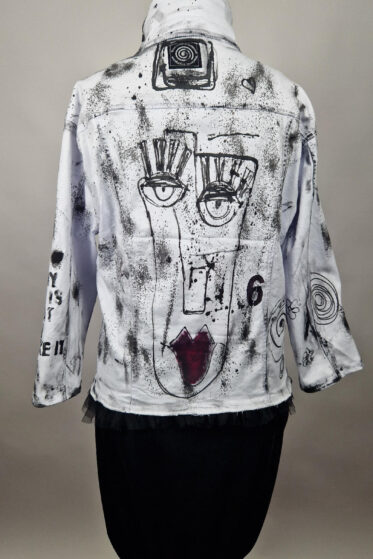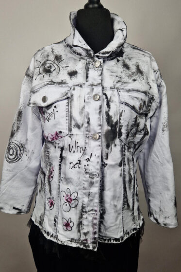 Katana z lekko elastycznego jeansu, którego główną dekoracją jest aplikacja z moim, autorskim kolażem tkanin na plecach. Katana jest pozbawiona paska na dole, ale ma wielowarstwową, tiulową falbankę, ma długie, miękkie czerwone mankiety, żeby było miękko i wygodnie i oczywiście oryginalnie…, które sprawią, że pokochasz swoją katankę od pierwszego spojrzenia