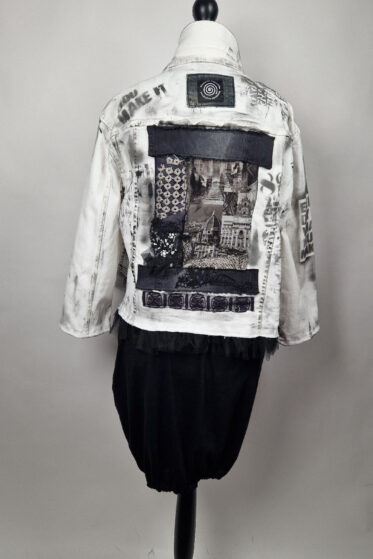 Katana z elastycznego, mega-miękkiego jeansu, którego główną dekoracją jest Pocałunek Klimta, kopia obrazu wydrukowana na tkaninie i naszyta na plecach.