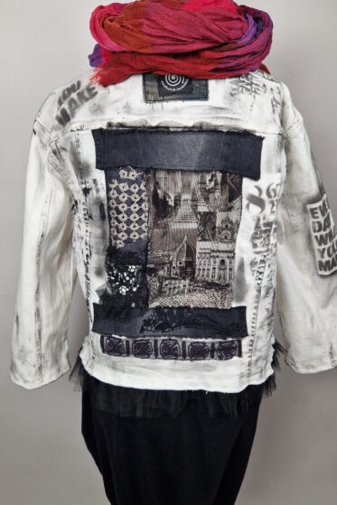 Katana z elastycznego, mega-miękkiego jeansu, którego główną dekoracją jest Pocałunek Klimta, kopia obrazu wydrukowana na tkaninie i naszyta na plecach.
