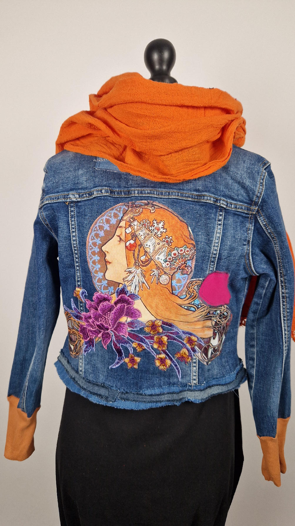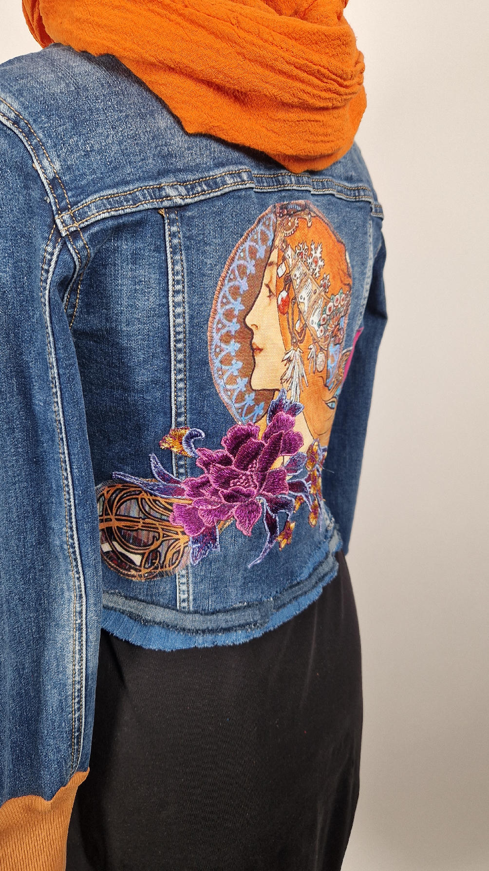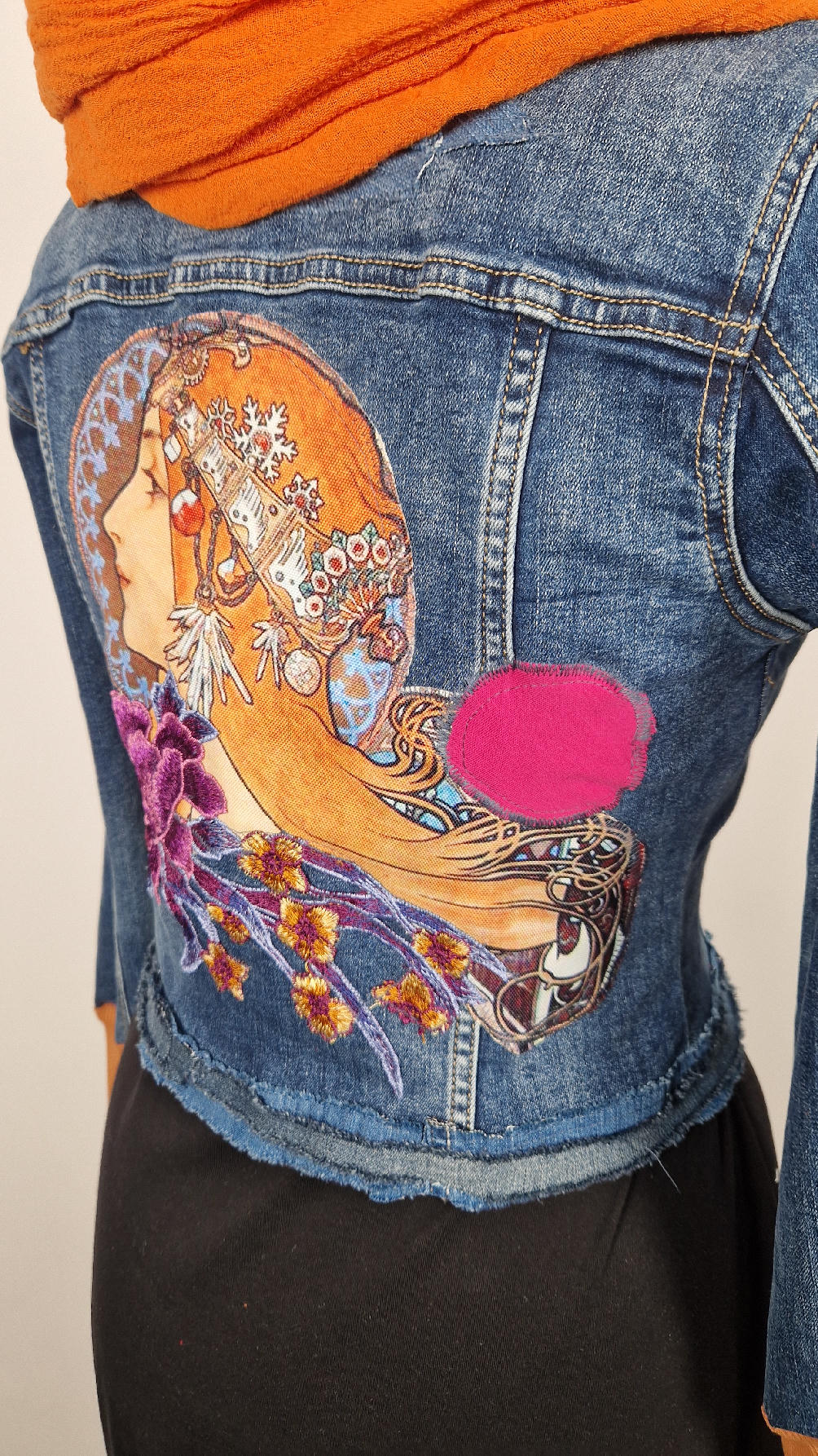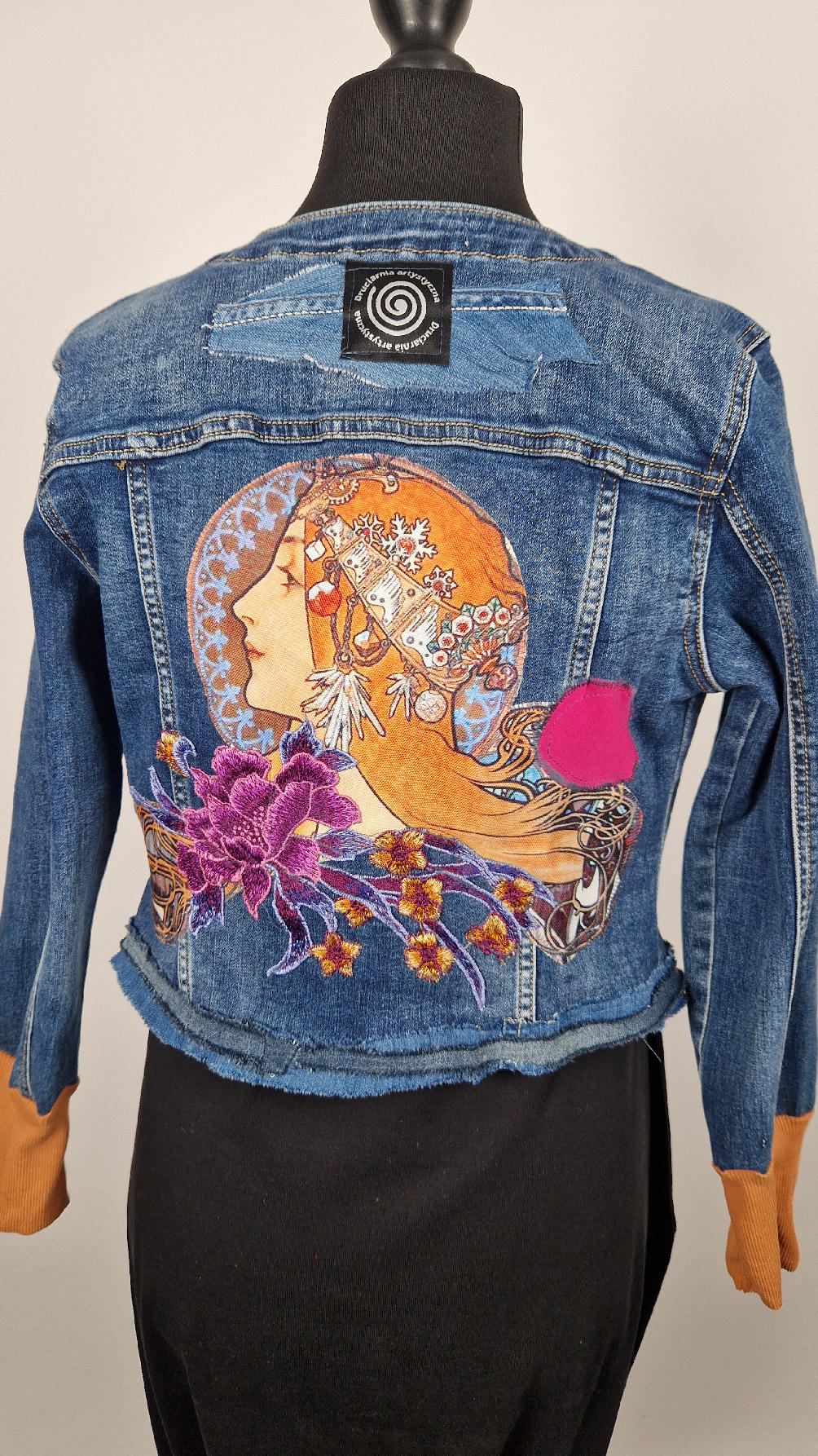Obłędna zupełnie niezwyczajna katana z elastycznego jeansu, którego główną dekoracją jest kolaż tkanin z obrazem Muchy Zodiak, do tego piękne kwiaty…Katana jest pozbawiona paska na dole, ma długie, miękkie mankiety,  żeby było miękko i wygodnie i oczywiście oryginalnie…, które sprawią, że pokochasz swoją Fridkę od pierwszego spojrzenia
