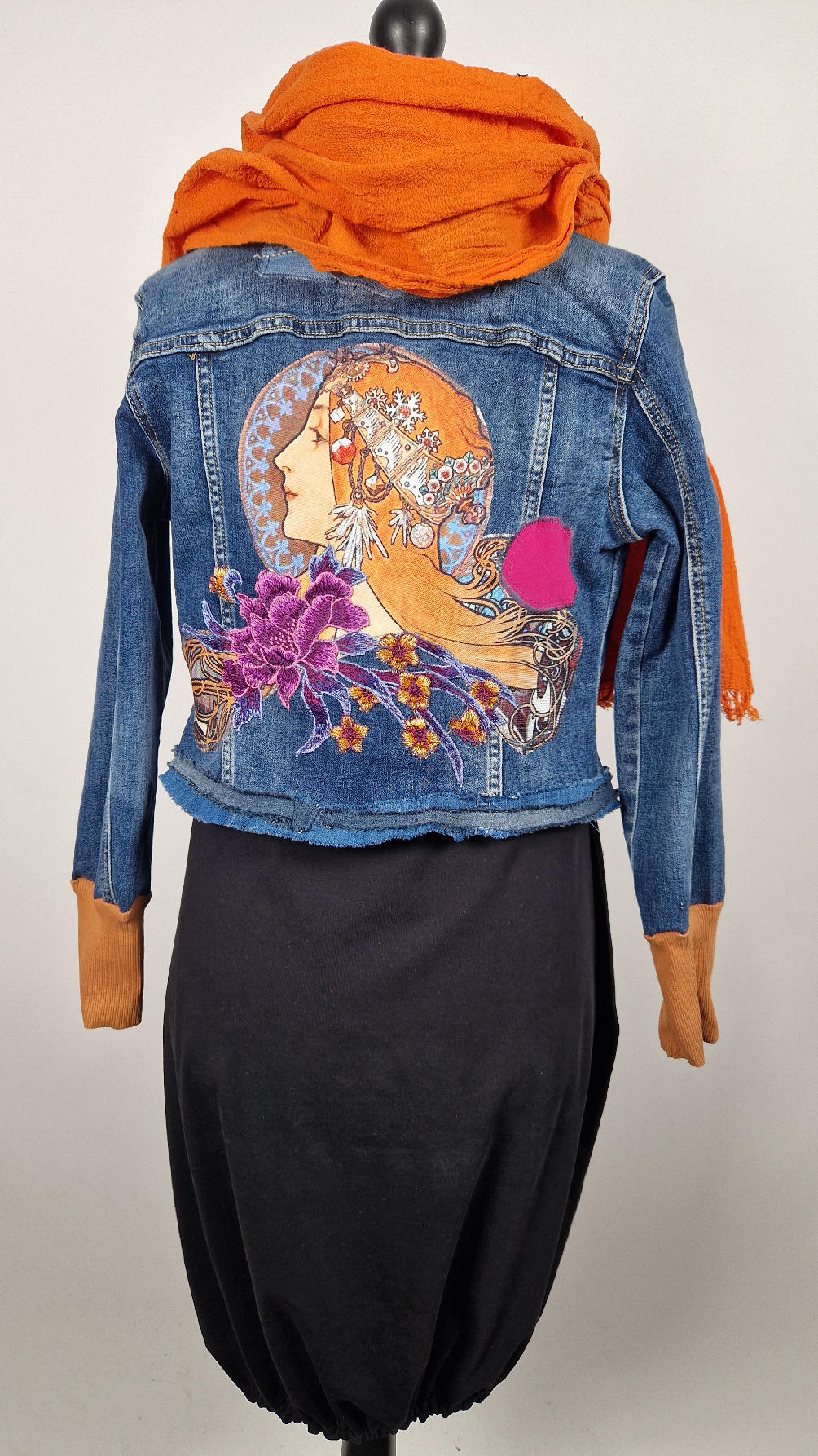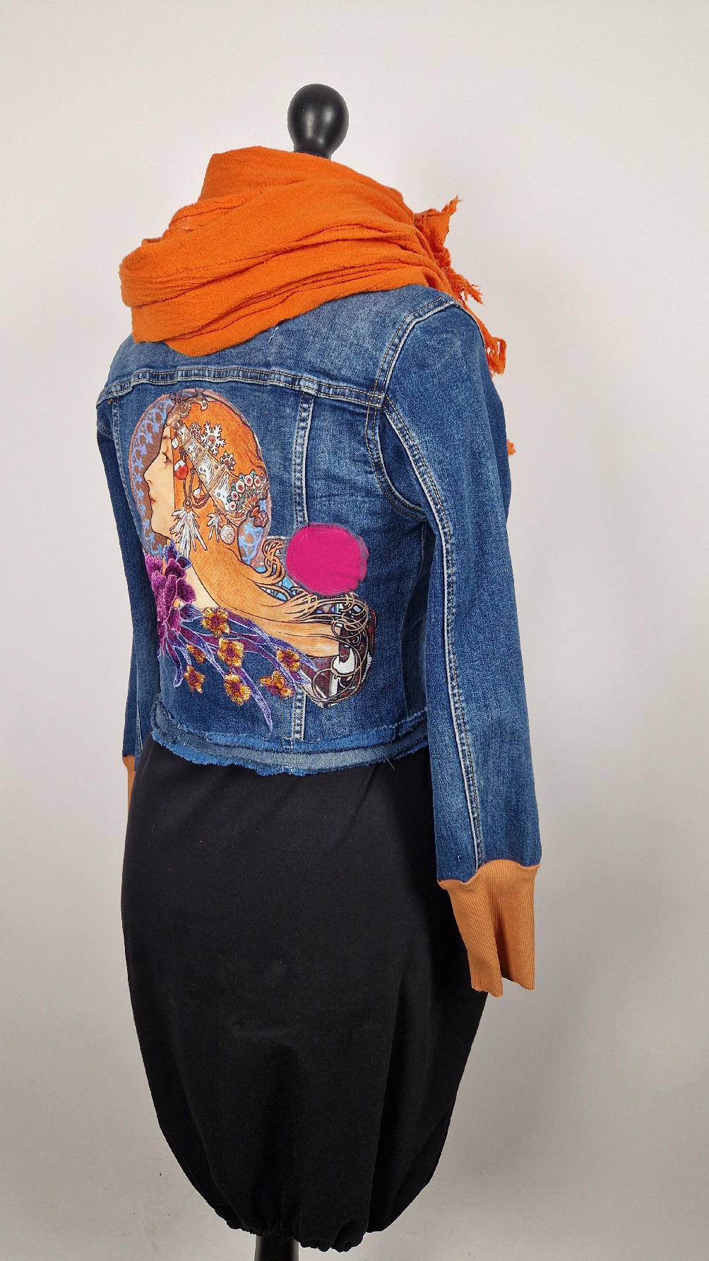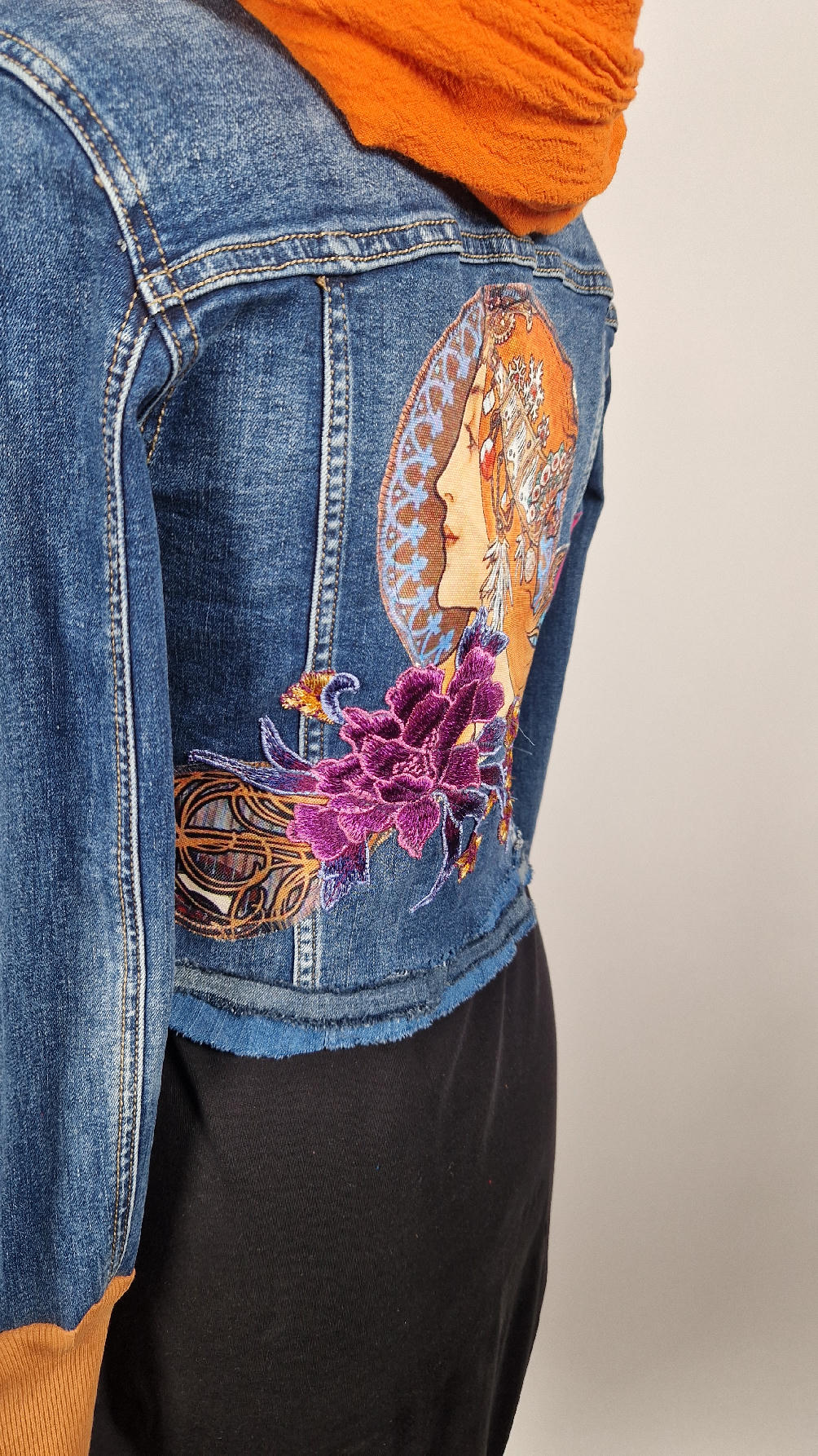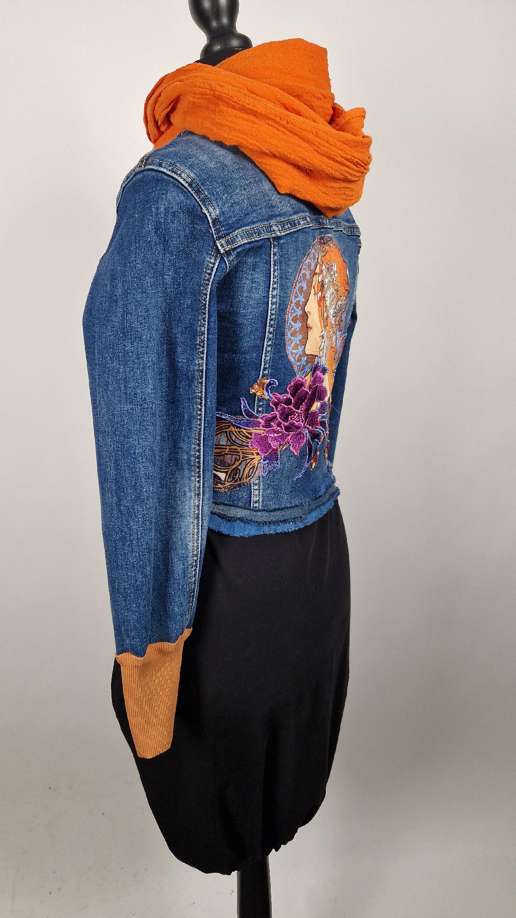 Obłędna zupełnie niezwyczajna katana z elastycznego jeansu, którego główną dekoracją jest kolaż tkanin z obrazem Muchy Zodiak, do tego piękne kwiaty…Katana jest pozbawiona paska na dole, ma długie, miękkie mankiety,  żeby było miękko i wygodnie i oczywiście oryginalnie…, które sprawią, że pokochasz swoją Fridkę od pierwszego spojrzenia