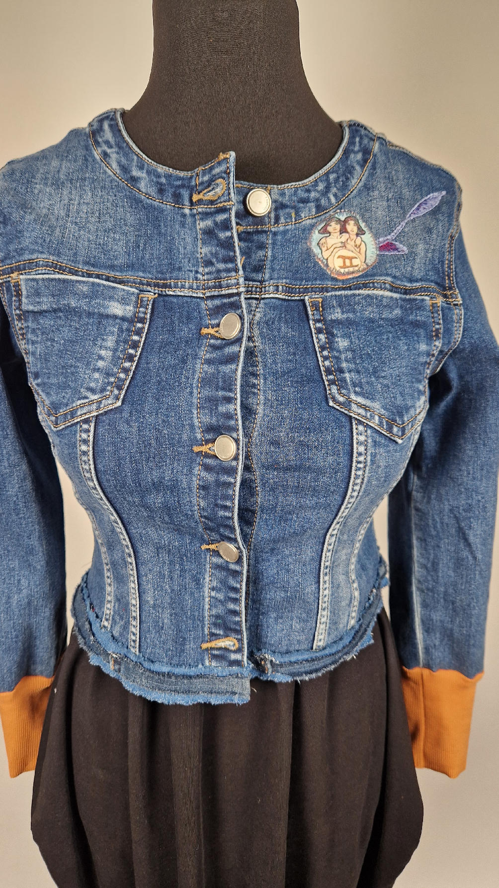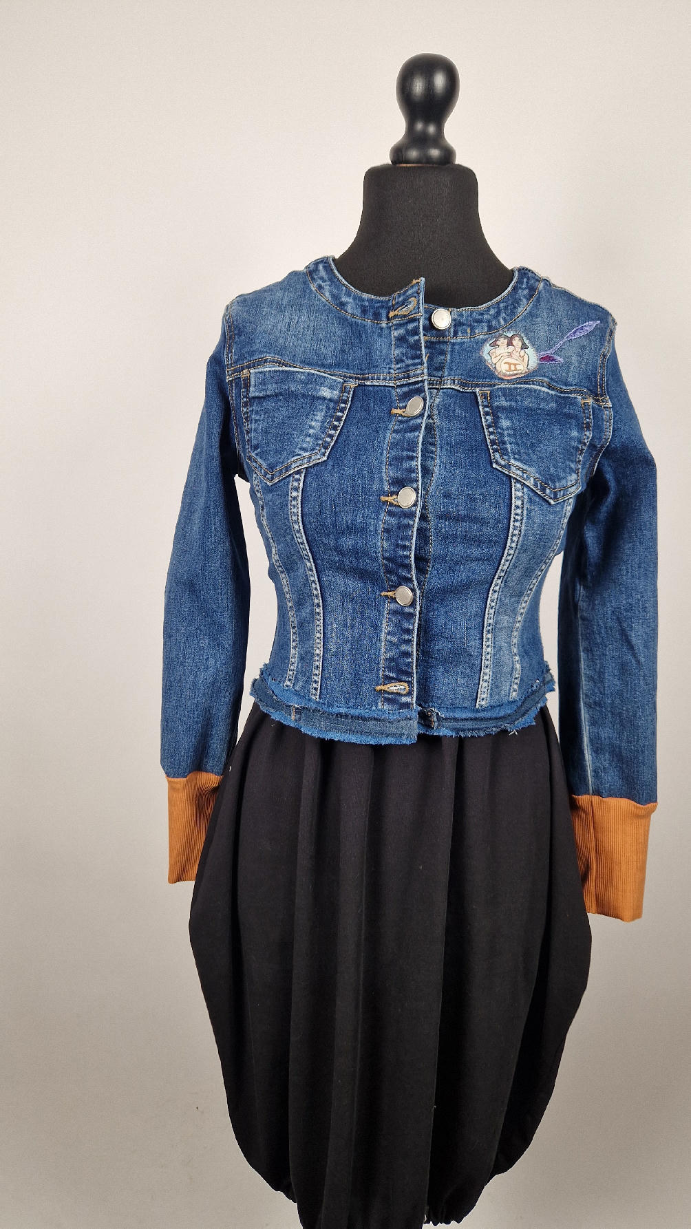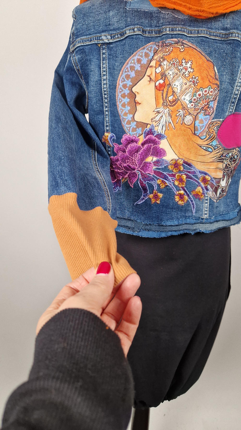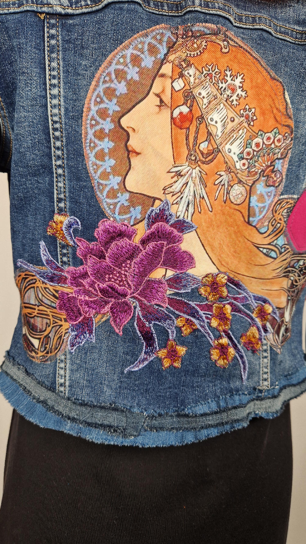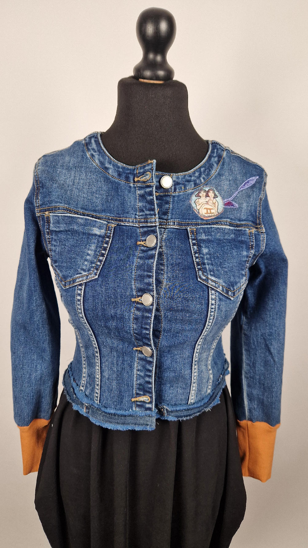 Obłędna zupełnie niezwyczajna katana z elastycznego jeansu, którego główną dekoracją jest kolaż tkanin z obrazem Muchy Zodiak, do tego piękne kwiaty…Katana jest pozbawiona paska na dole, ma długie, miękkie mankiety,  żeby było miękko i wygodnie i oczywiście oryginalnie…, które sprawią, że pokochasz swoją Fridkę od pierwszego spojrzenia