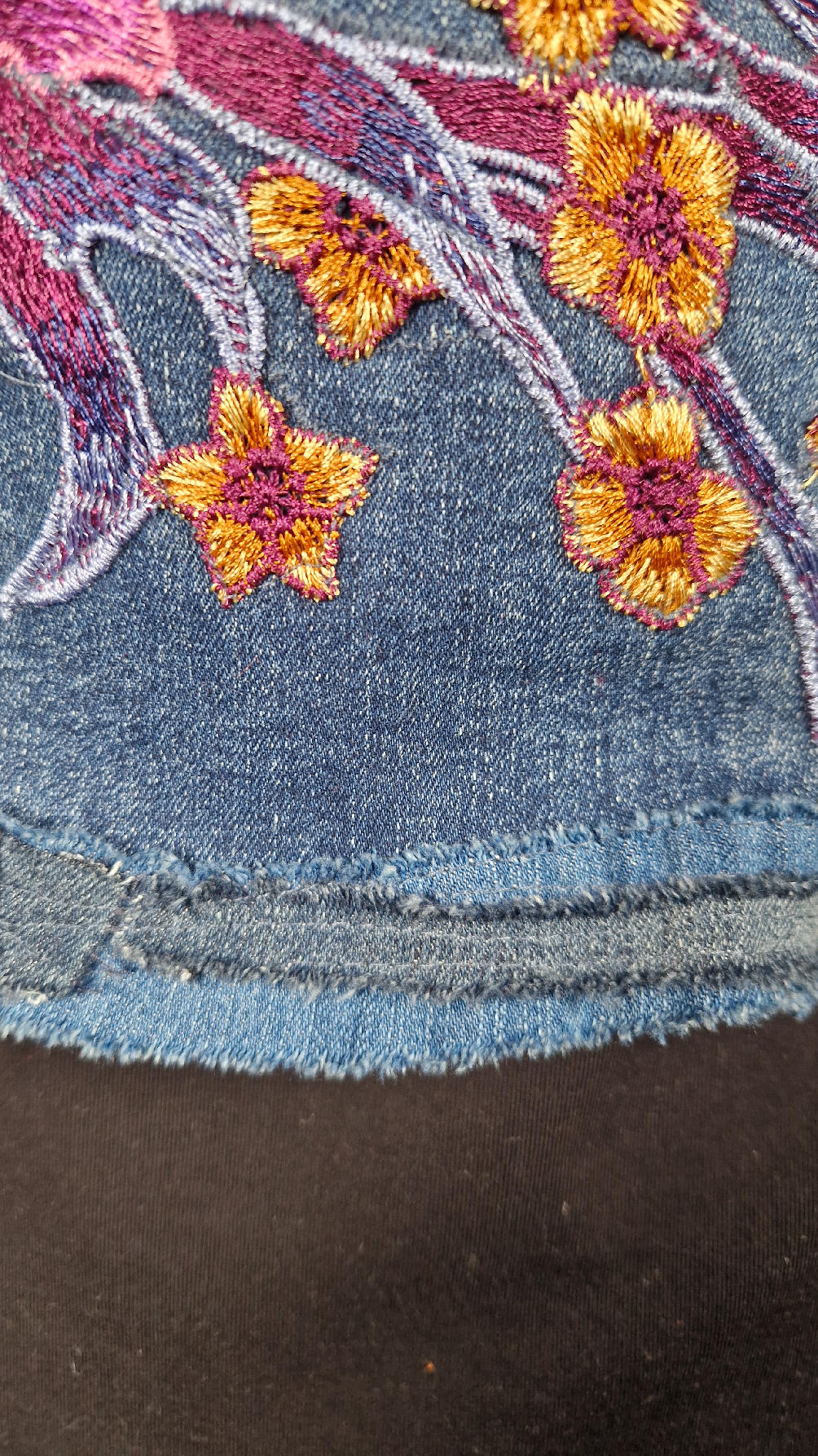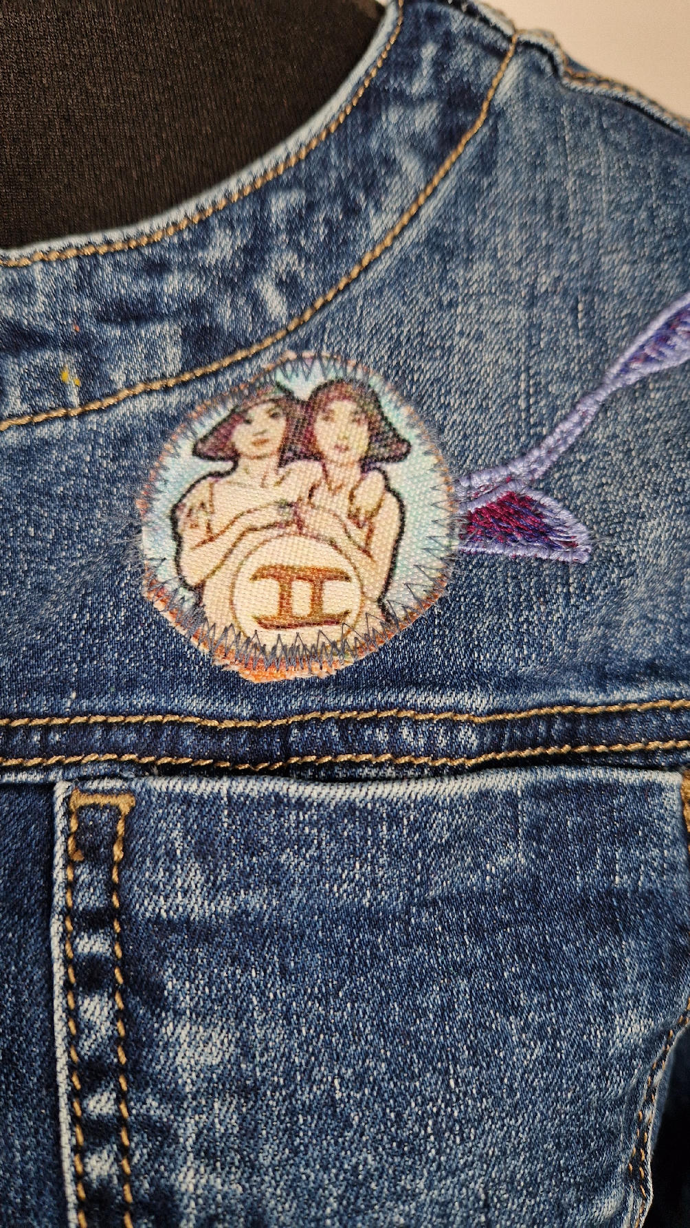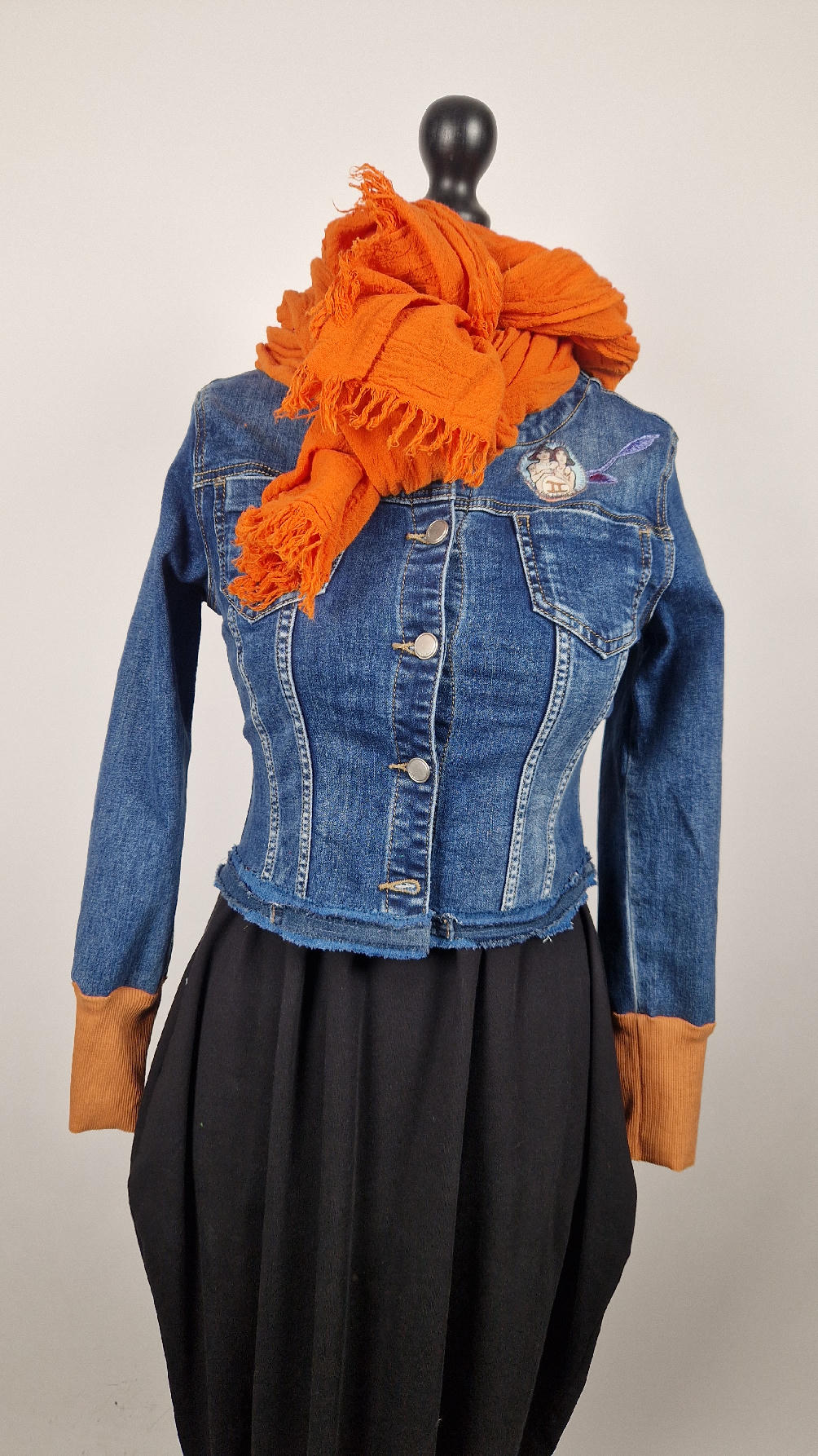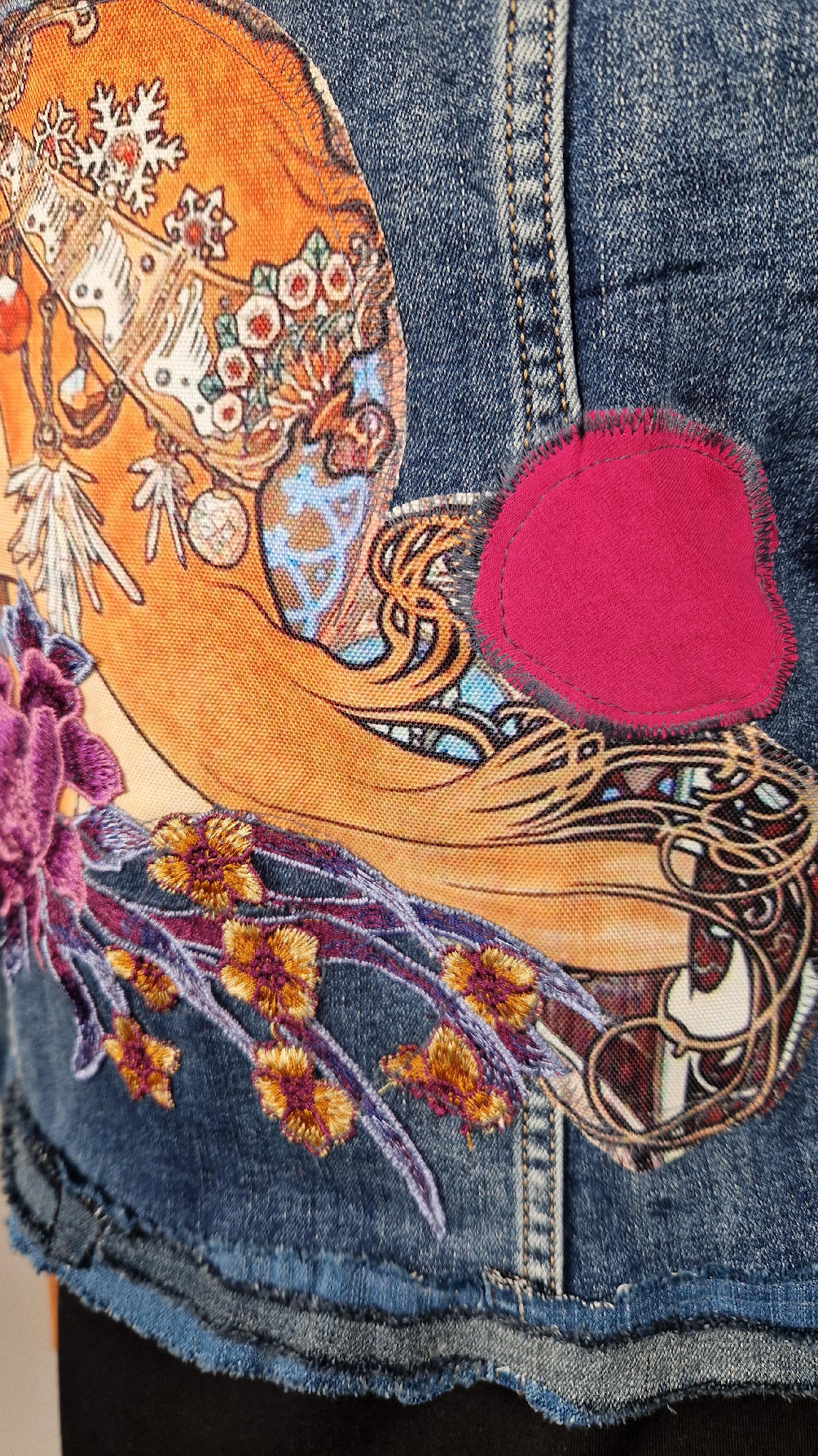 Obłędna zupełnie niezwyczajna katana z elastycznego jeansu, którego główną dekoracją jest kolaż tkanin z obrazem Muchy Zodiak, do tego piękne kwiaty…Katana jest pozbawiona paska na dole, ma długie, miękkie mankiety,  żeby było miękko i wygodnie i oczywiście oryginalnie…, które sprawią, że pokochasz swoją Fridkę od pierwszego spojrzenia
