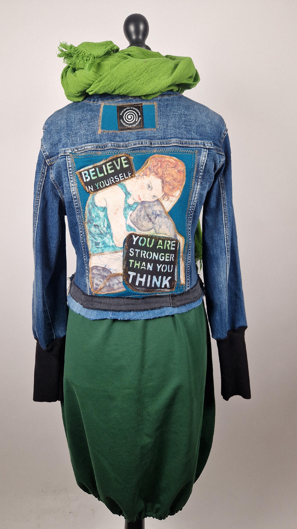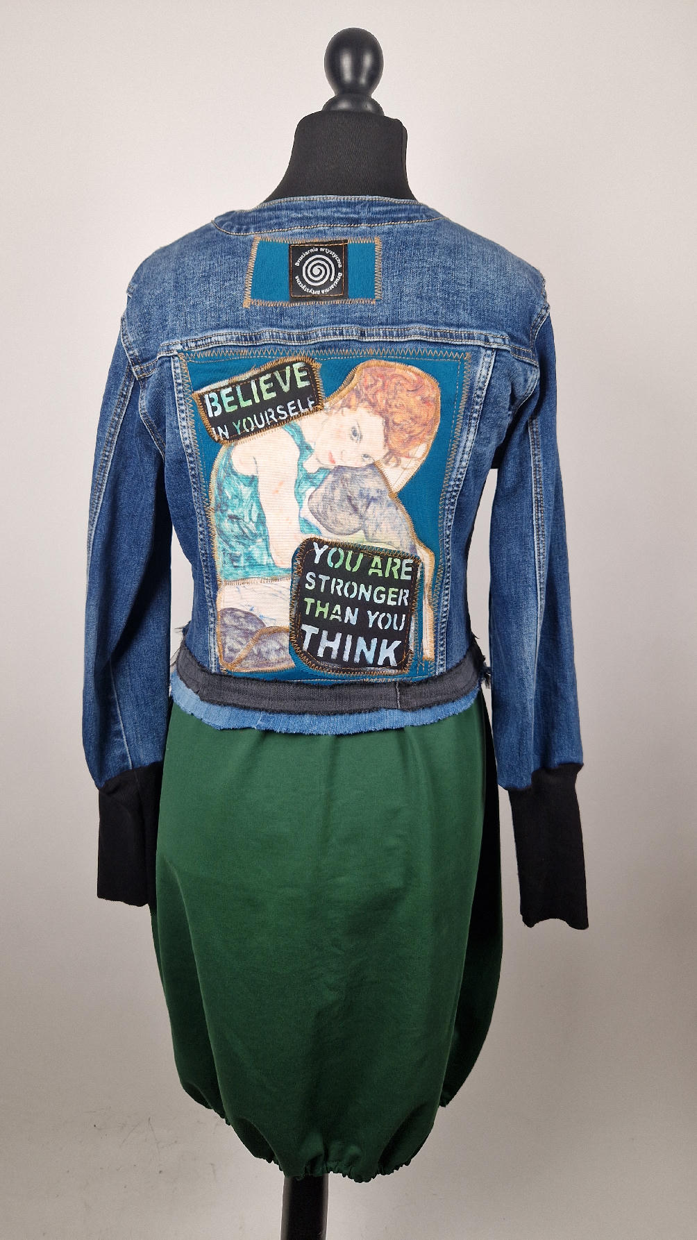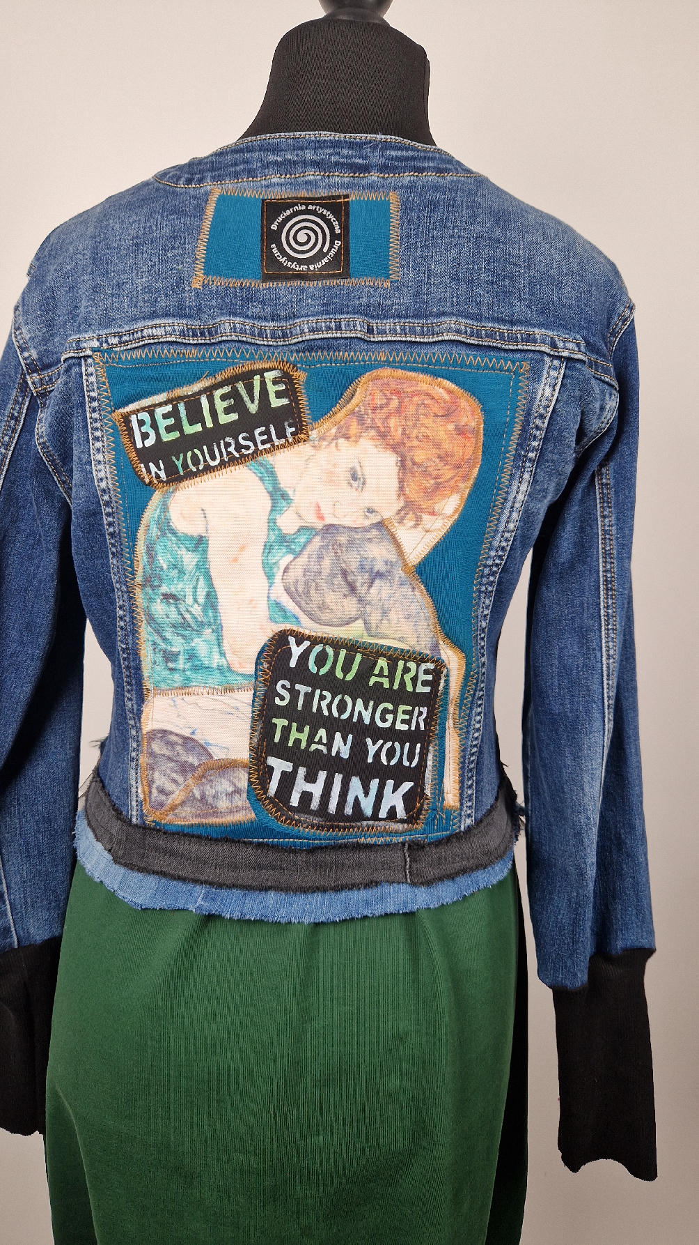 Niebieska, elastyczna katana, bez kołnierzyka, z niewielka stójką, z unikatowym kolażem tkanin na plecach, z kobietą z obrazu Schielego, połączyłami z turkusem i z napisami, na dole zrobiłam „falbankę” z jeansu i tiulu, rękawy wykończone są miękkimi ,czarnymi ściągaczami.