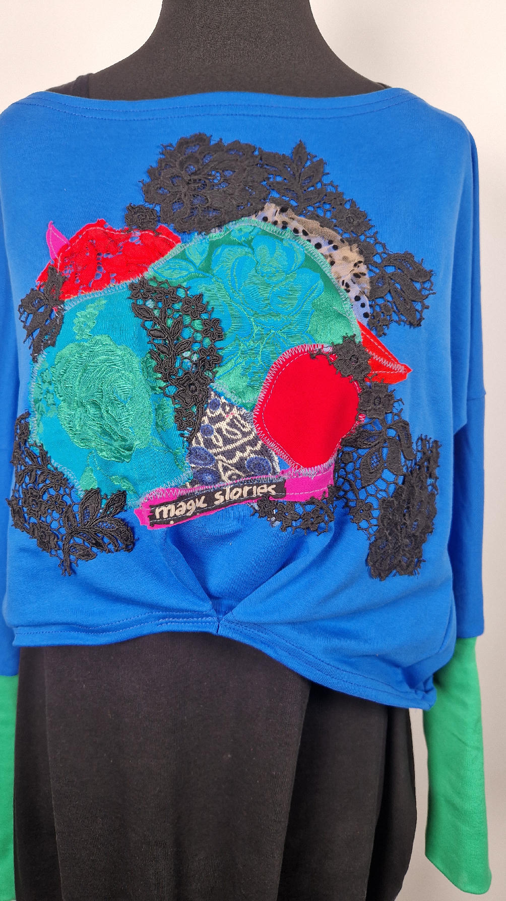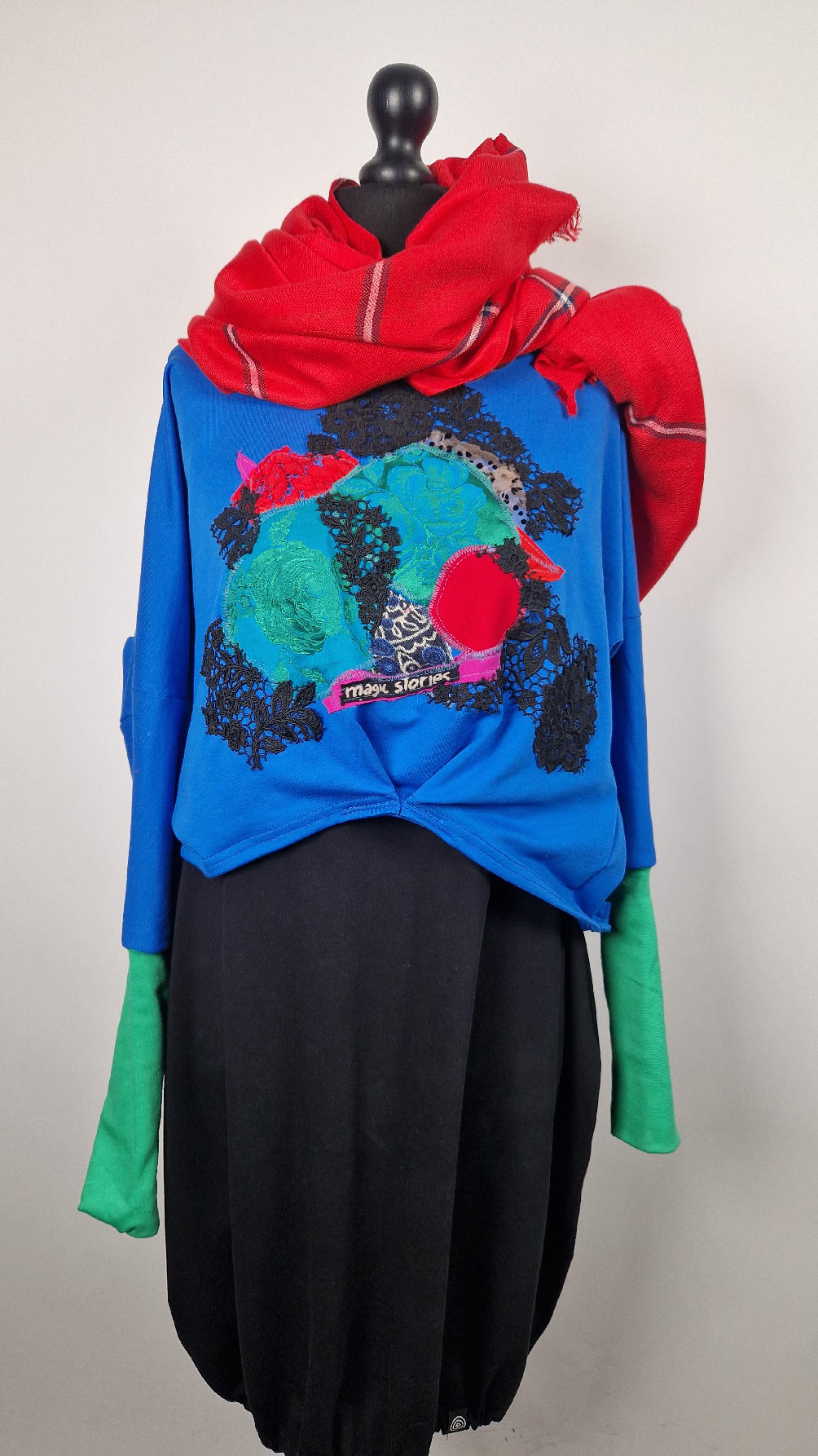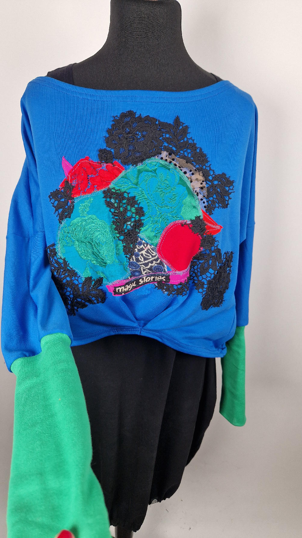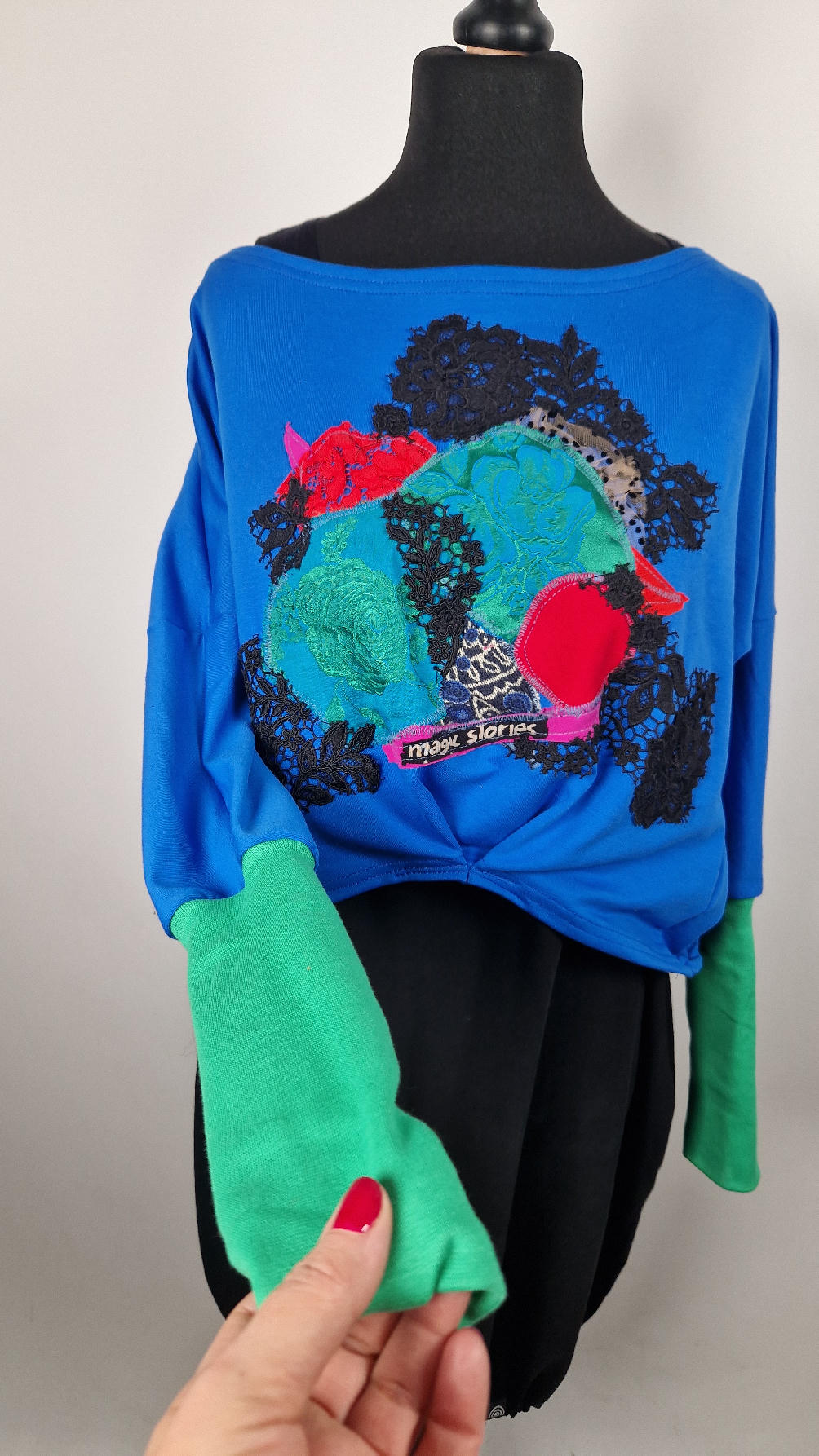 Krótka, kobaltowa bluzka z  obłędna megakolorową aplikacją, z koronek, gipiury i jedwabiu, z kontrastowymi , szmaragdowymi mankietami. Luźna w biuście bluzka typu NIETOPERZ, ale taki niewielki….bluzka uszyta z  wysokiej jakości bawełny z pętelką,  z długalaśnymi , elastycznymi mankietami … , lekko zebrana na dole, żeby układała się bardziej… prosta, bez kieszeni – tak specjalnie, żeby nic nie odstawało  ale z dużym dekoltem  typu ,,łódka”,  który możesz opuścić na jedno ramię, lub nosić symetrycznie…