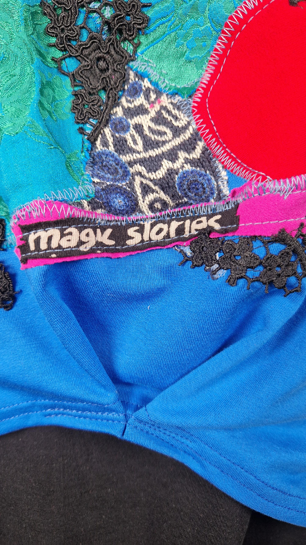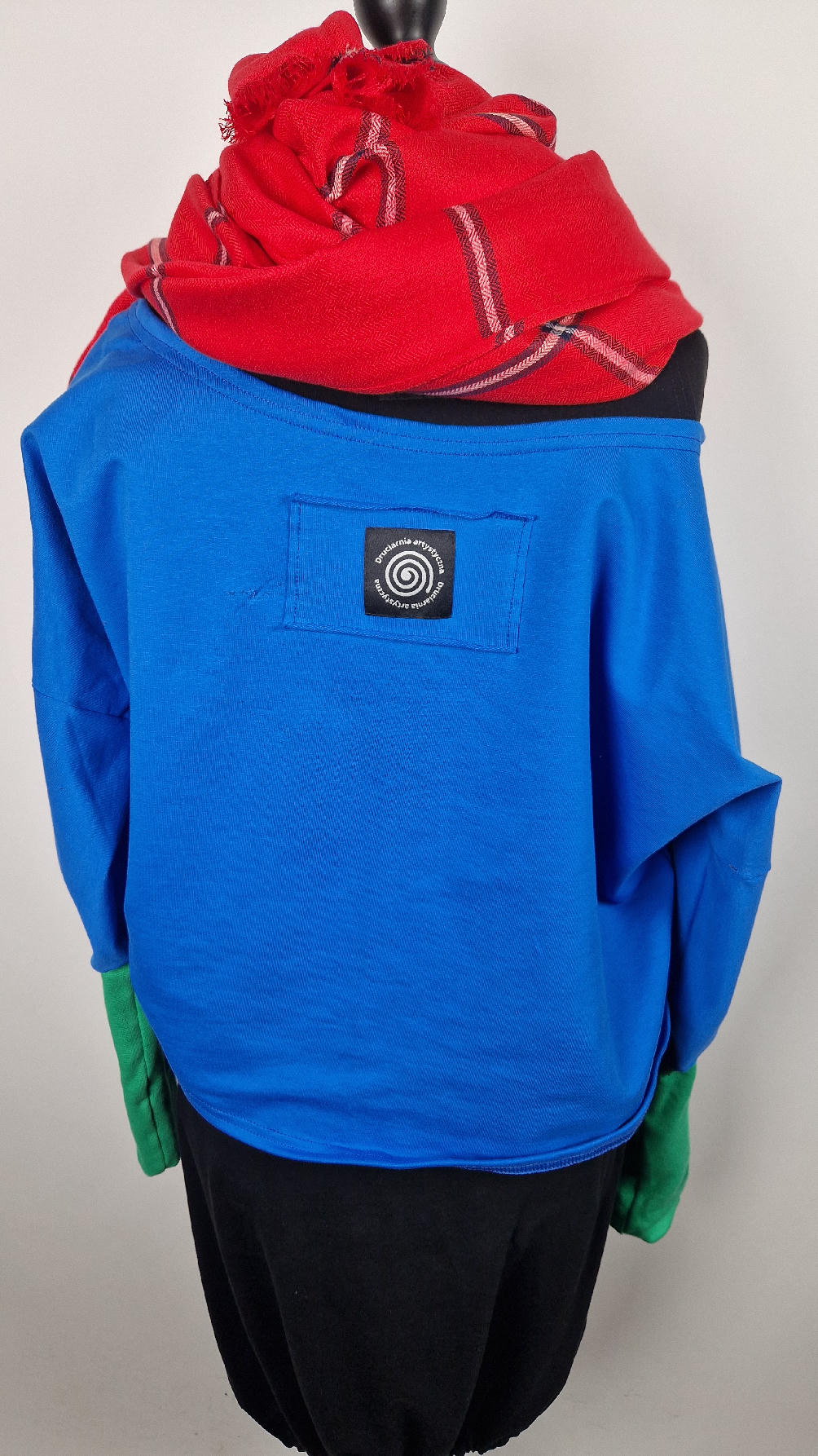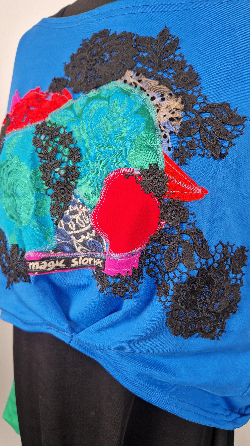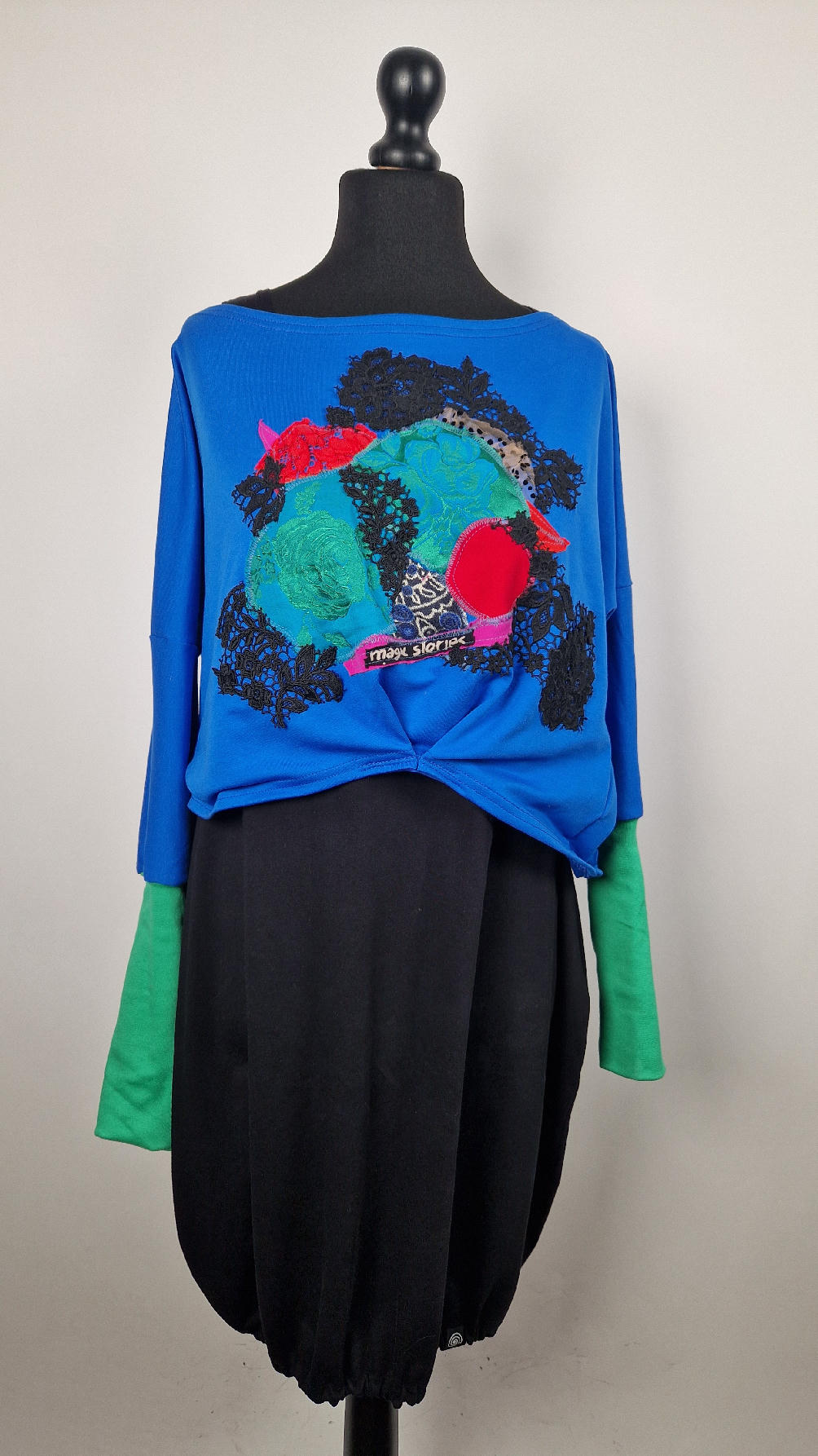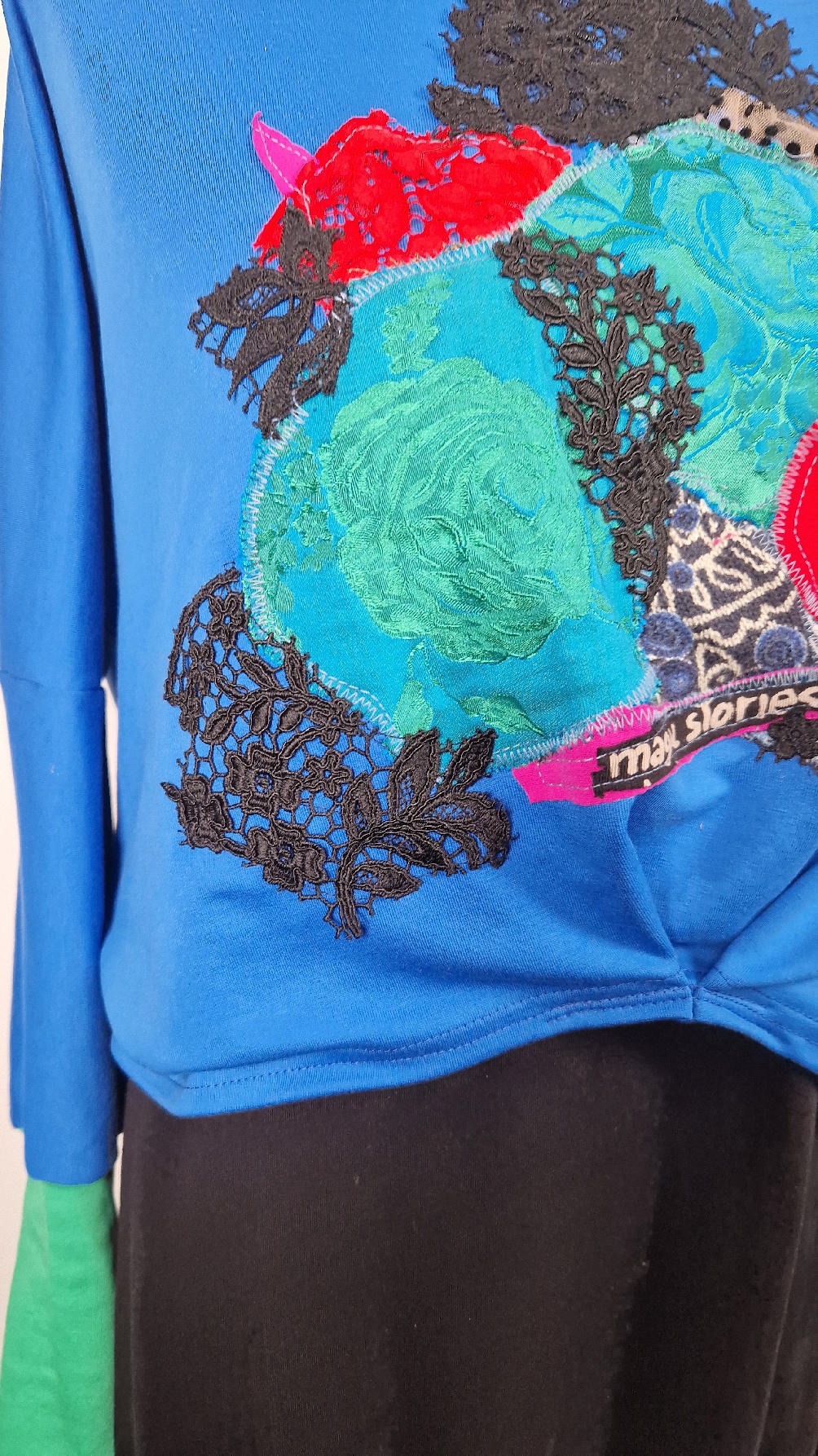 Krótka, kobaltowa bluzka z  obłędna megakolorową aplikacją, z koronek, gipiury i jedwabiu, z kontrastowymi , szmaragdowymi mankietami. Luźna w biuście bluzka typu NIETOPERZ, ale taki niewielki….bluzka uszyta z  wysokiej jakości bawełny z pętelką,  z długalaśnymi , elastycznymi mankietami … , lekko zebrana na dole, żeby układała się bardziej… prosta, bez kieszeni – tak specjalnie, żeby nic nie odstawało  ale z dużym dekoltem  typu ,,łódka”,  który możesz opuścić na jedno ramię, lub nosić symetrycznie…