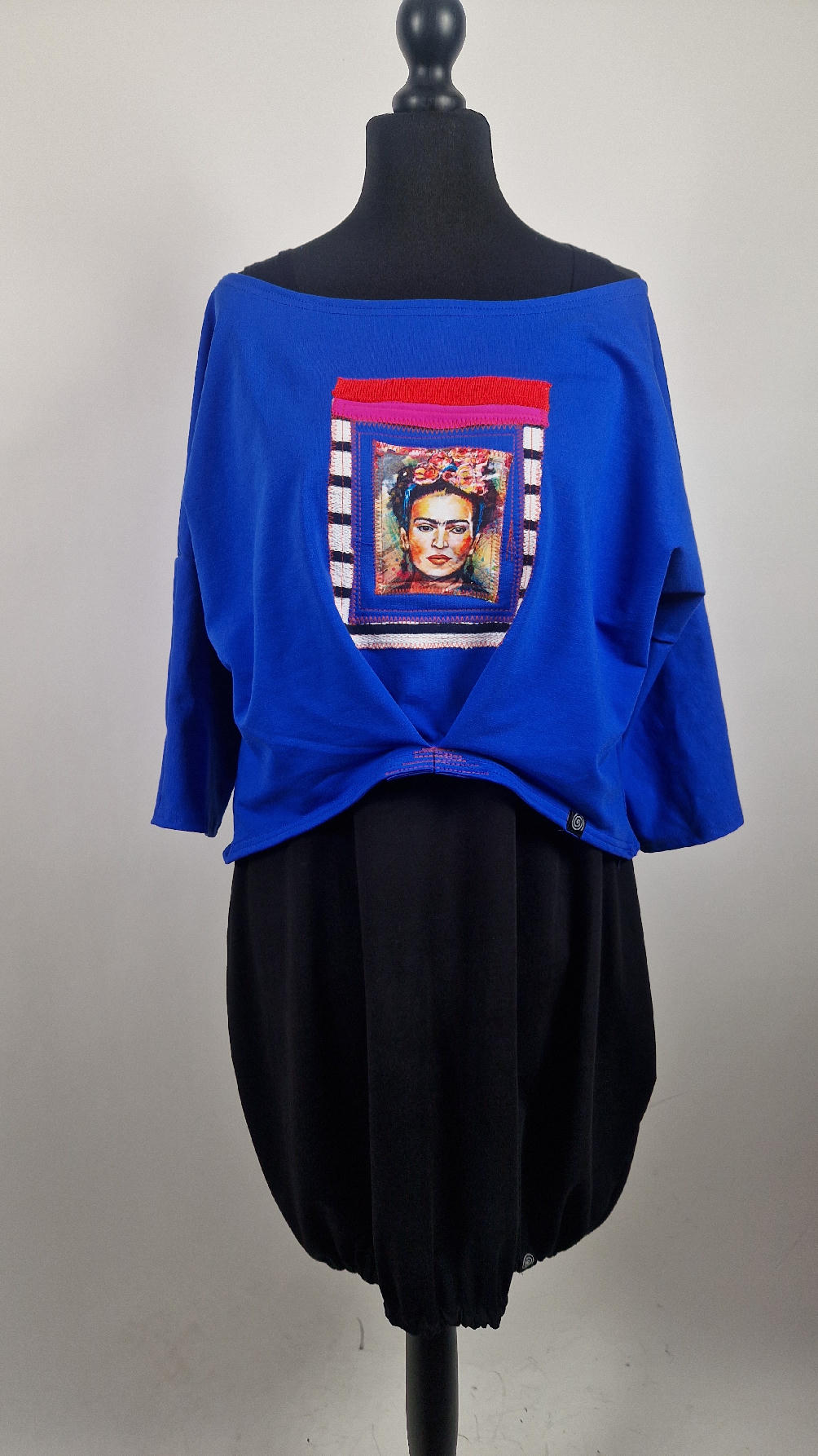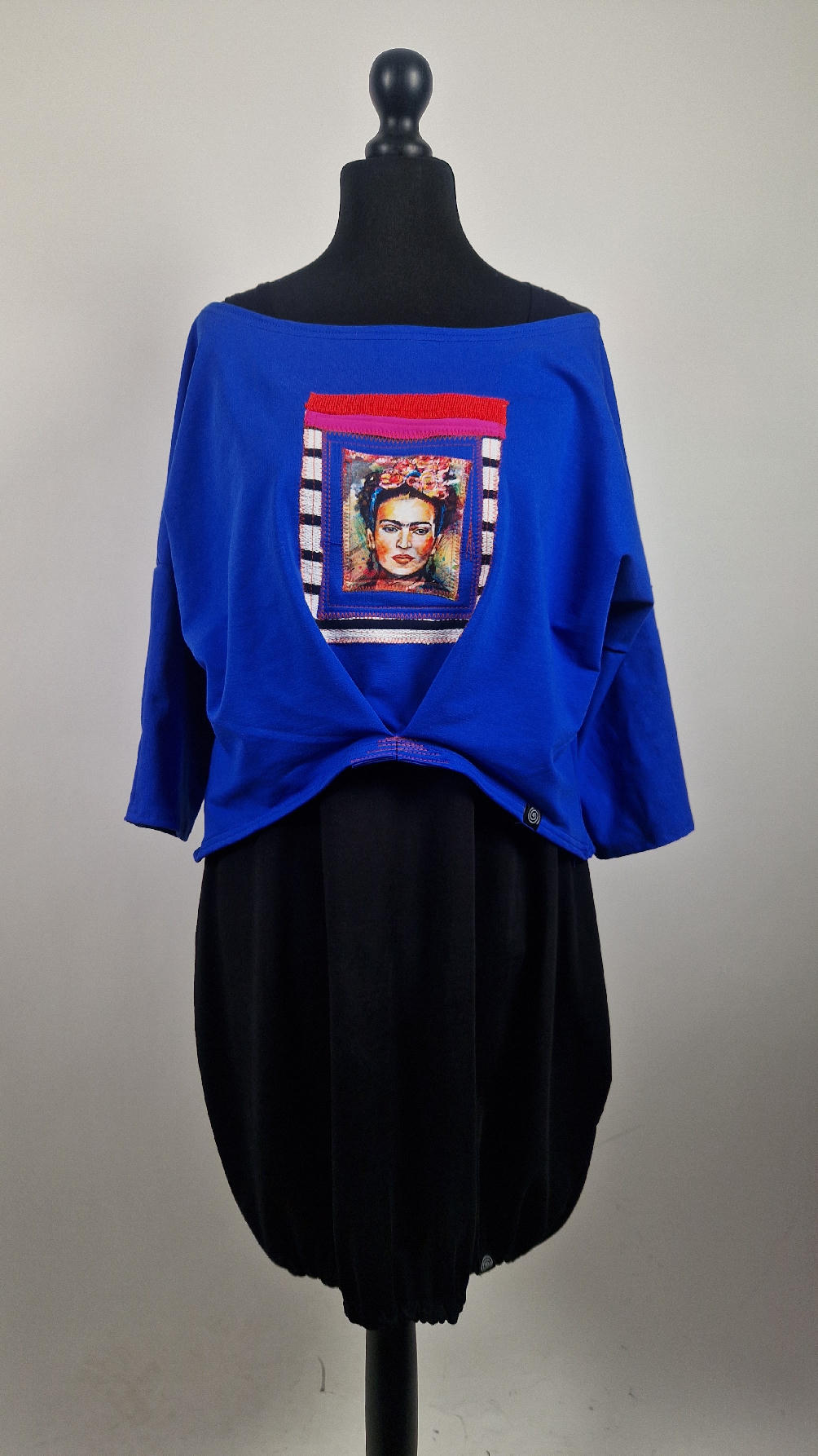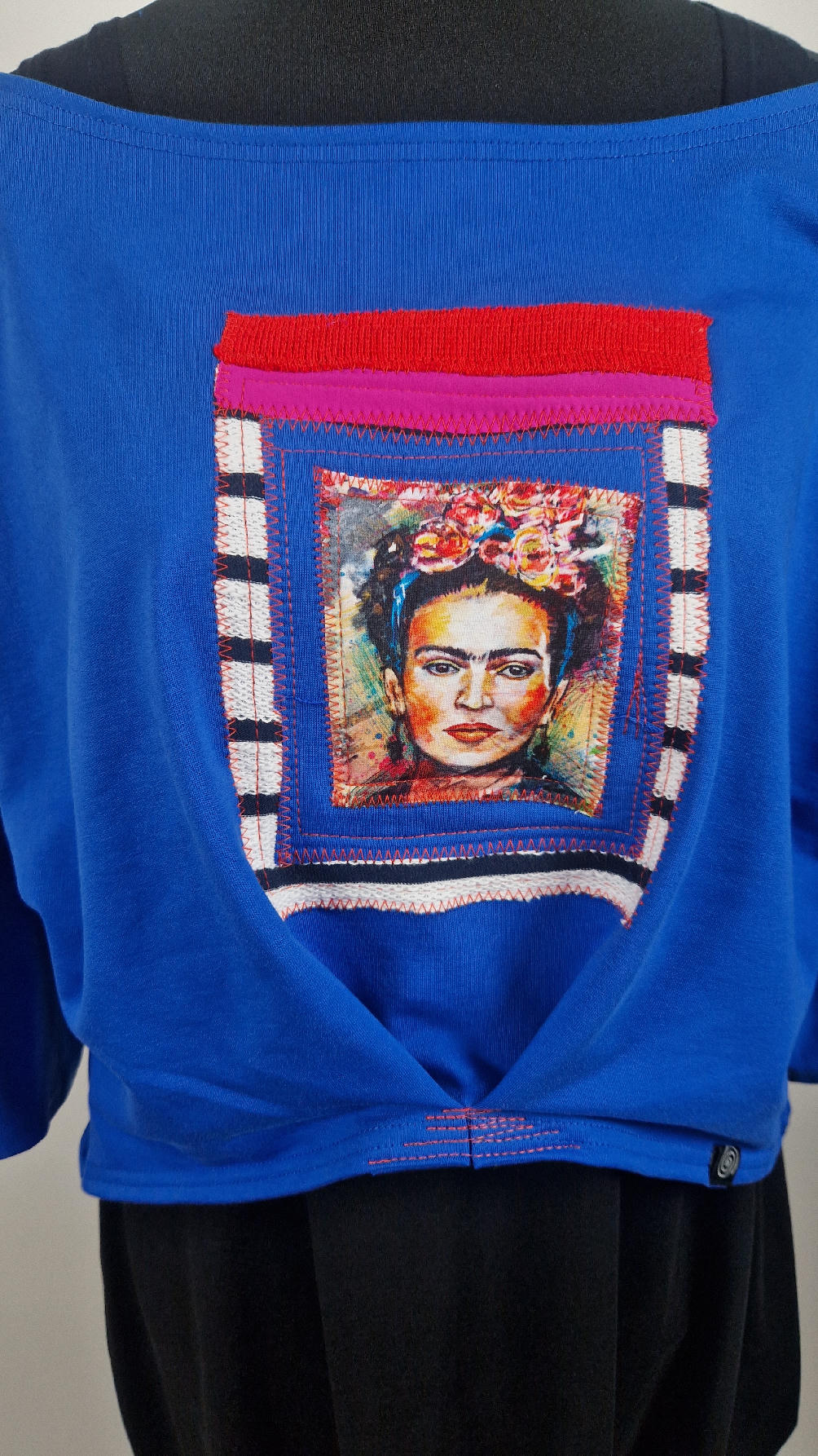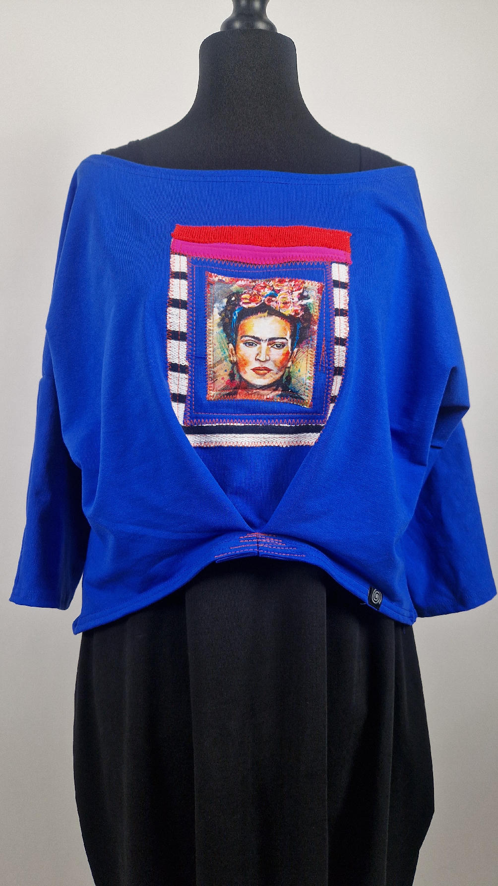 Krótka, kobaltowa bluzka z aplikacją z wizerunkiem Fridy, z kontrastowymi dodatkami. …Luźna w biuście bluzka typu NIETOPERZ, ale taki niewielki….bluzka uszyta z wysokiej jakości bawełny z pętelką, z rękawem 3/4… , lekko zebrana na dole, żeby układała się bardziej… prosta, bez kieszeni – tak specjalnie, żeby nic nie odstawało ale z dużym dekoltem typu ,,łódka”, który możesz opuścić na jedno ramię, lub nosić symetrycznie…możesz założyć do niej ZARĘKAWKI