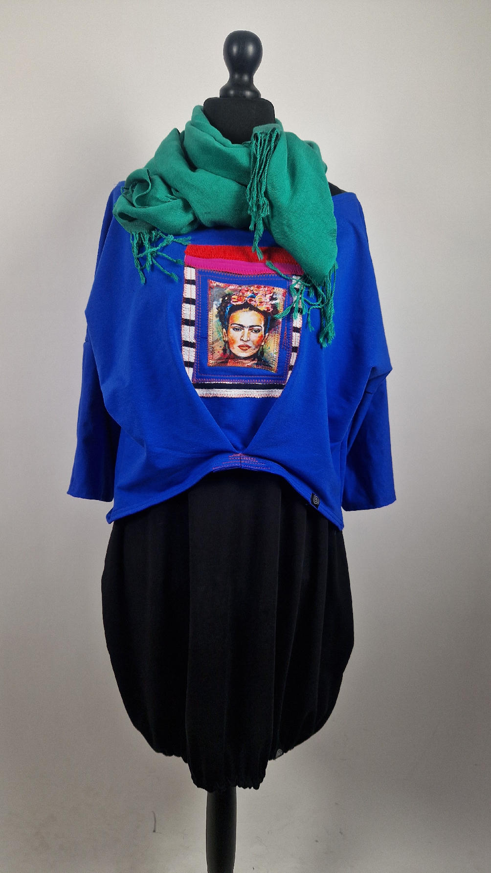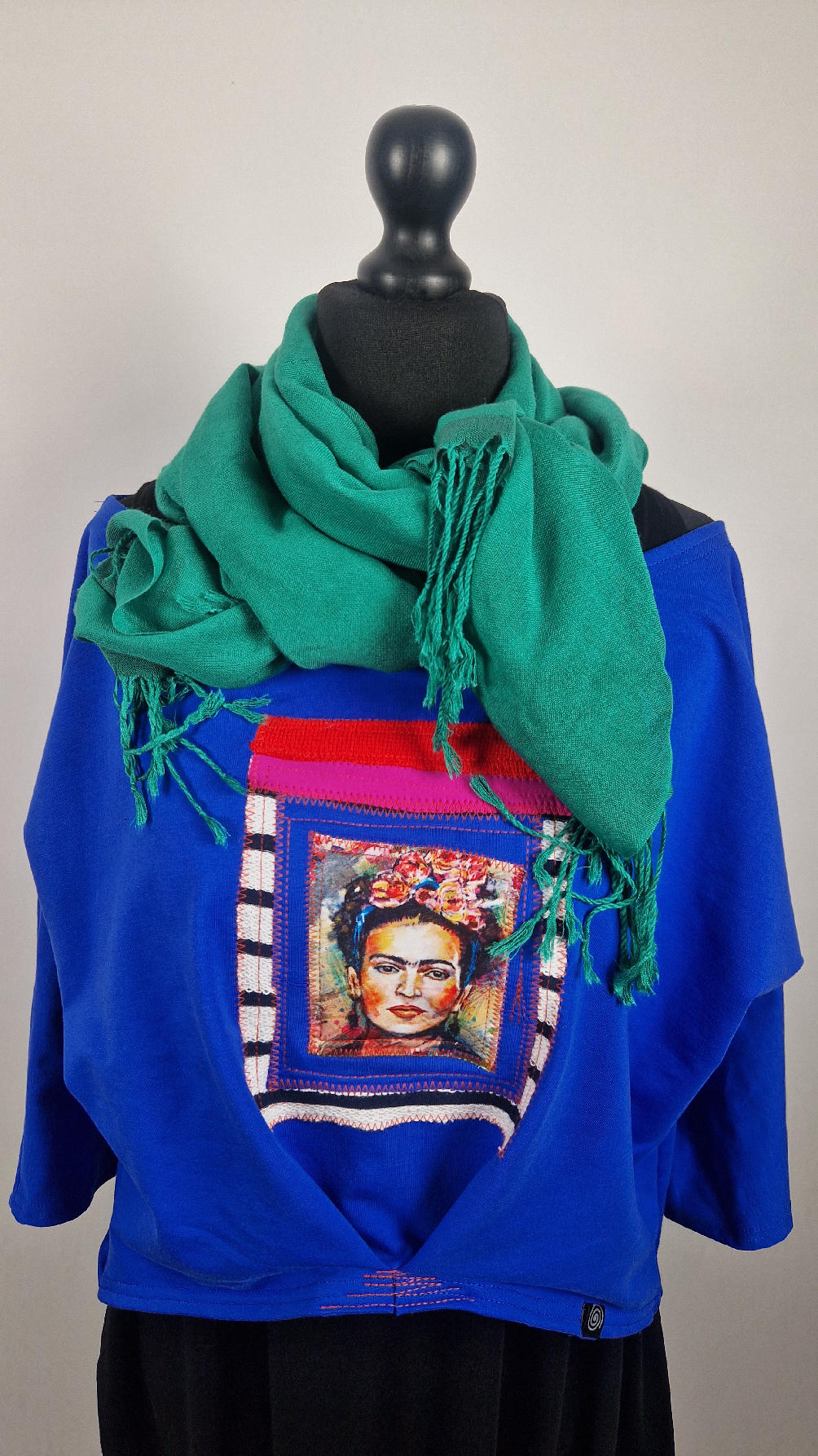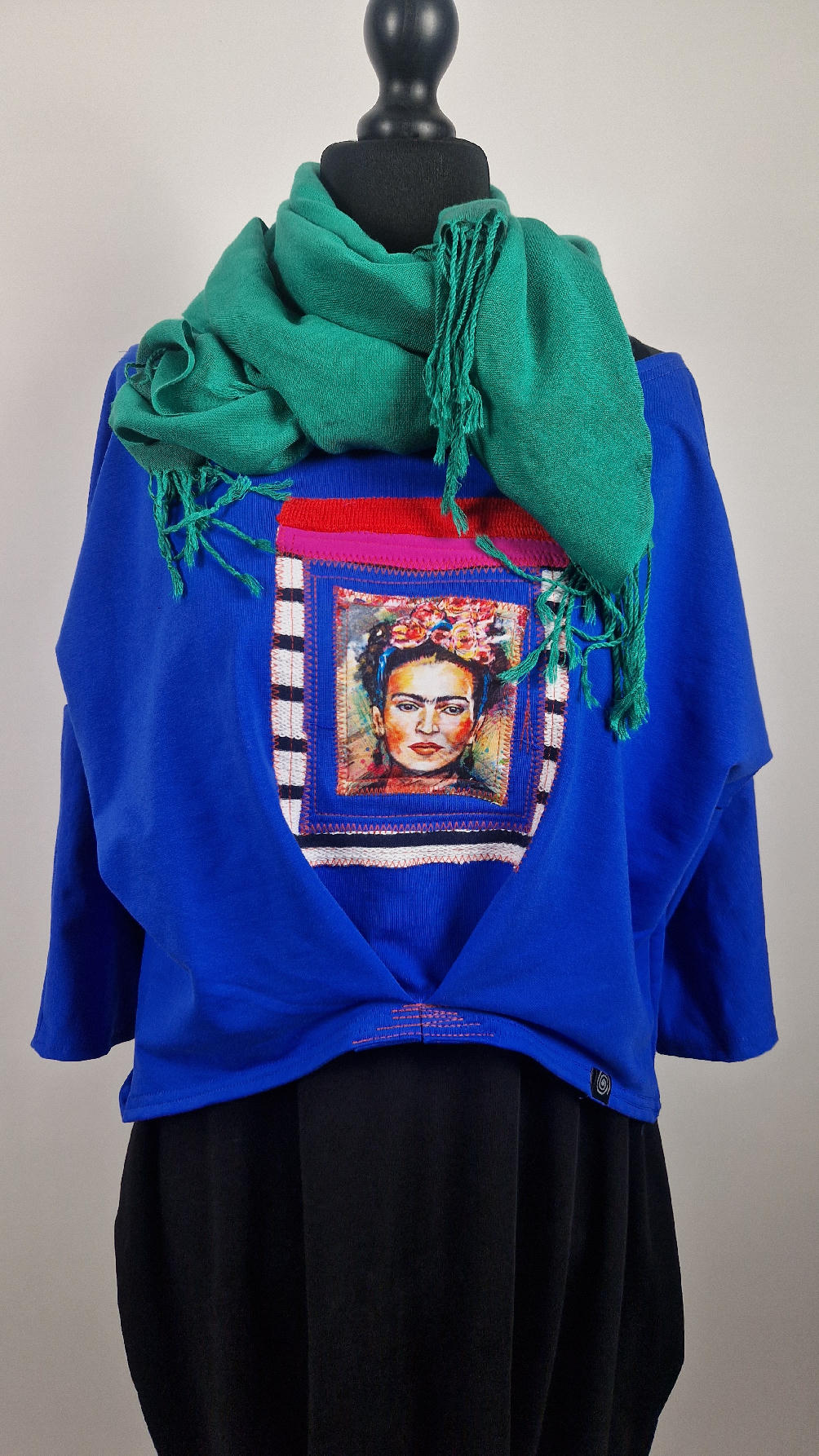 Krótka, kobaltowa bluzka z aplikacją z wizerunkiem Fridy, z kontrastowymi dodatkami. …Luźna w biuście bluzka typu NIETOPERZ, ale taki niewielki….bluzka uszyta z wysokiej jakości bawełny z pętelką, z rękawem 3/4… , lekko zebrana na dole, żeby układała się bardziej… prosta, bez kieszeni – tak specjalnie, żeby nic nie odstawało ale z dużym dekoltem typu ,,łódka”, który możesz opuścić na jedno ramię, lub nosić symetrycznie…możesz założyć do niej ZARĘKAWKI