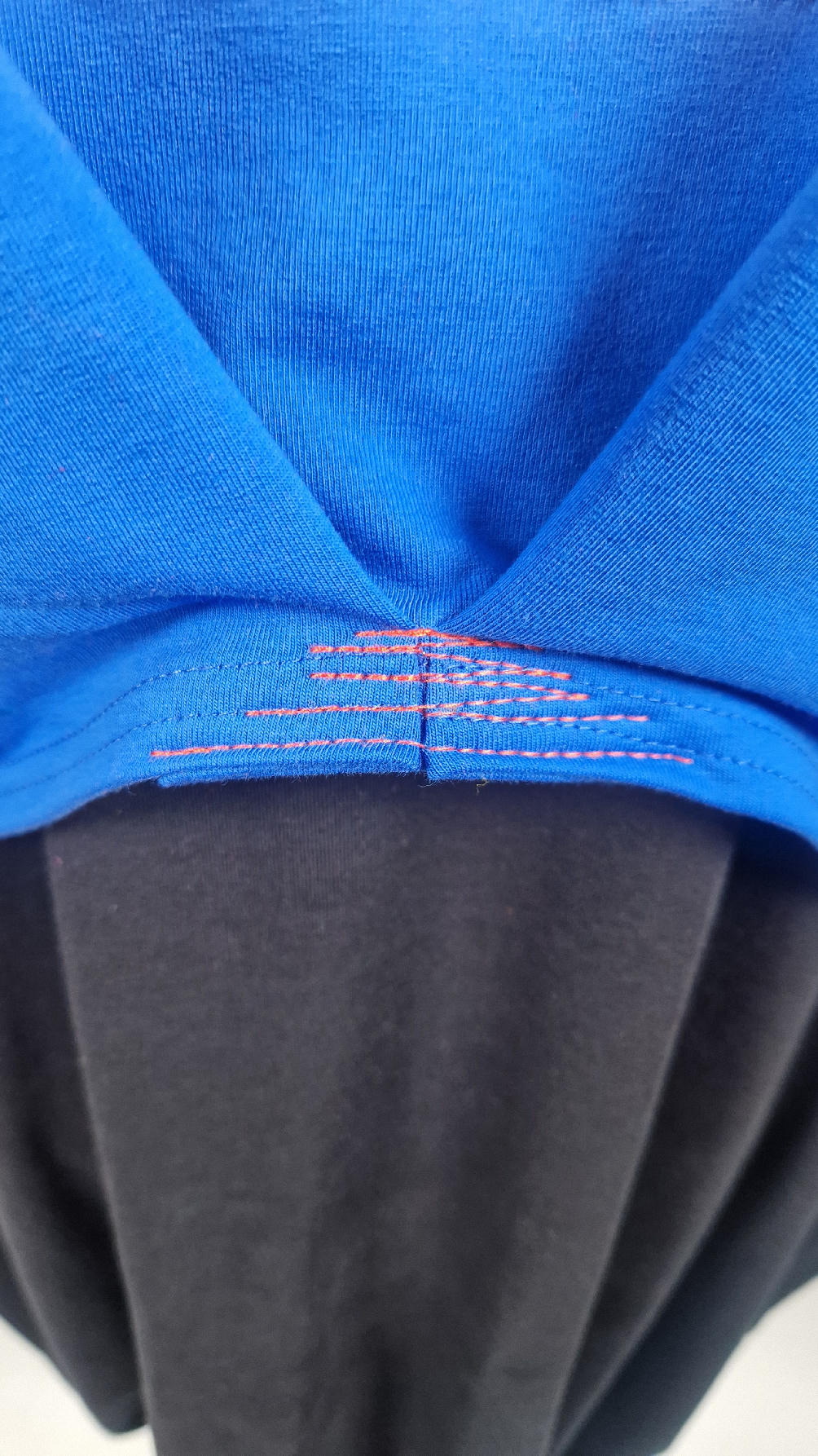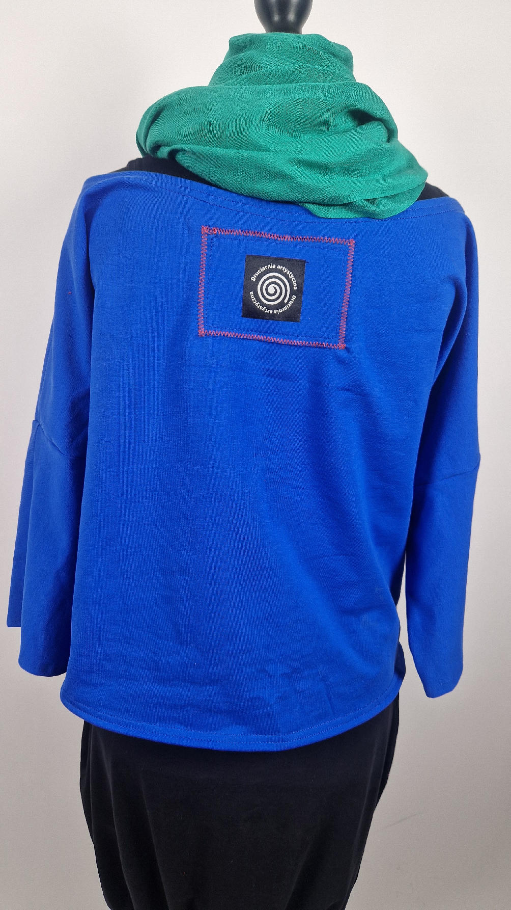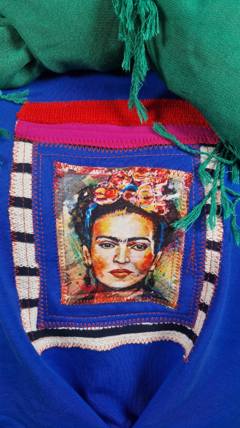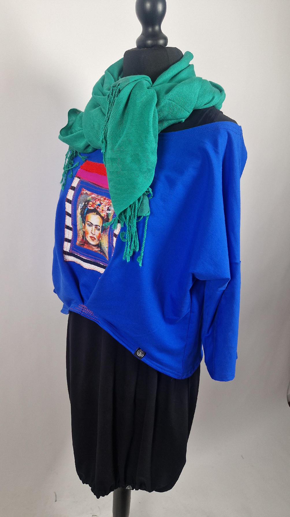 Krótka, kobaltowa bluzka z aplikacją z wizerunkiem Fridy, z kontrastowymi dodatkami. …Luźna w biuście bluzka typu NIETOPERZ, ale taki niewielki….bluzka uszyta z wysokiej jakości bawełny z pętelką, z rękawem 3/4… , lekko zebrana na dole, żeby układała się bardziej… prosta, bez kieszeni – tak specjalnie, żeby nic nie odstawało ale z dużym dekoltem typu ,,łódka”, który możesz opuścić na jedno ramię, lub nosić symetrycznie…możesz założyć do niej ZARĘKAWKI