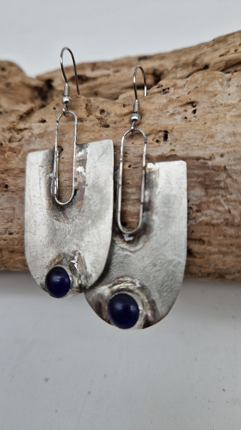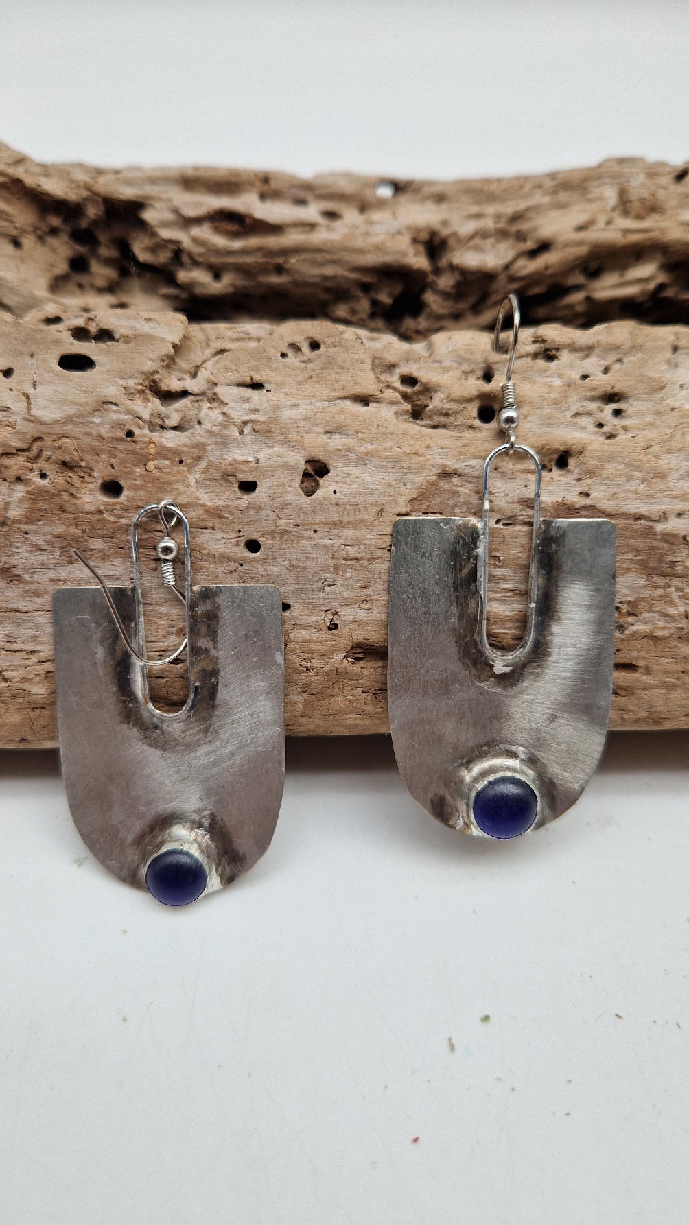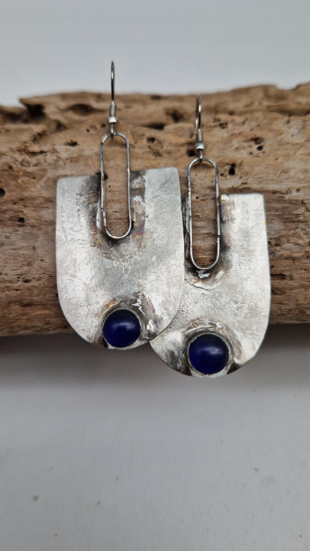 Wykonane z zaczarowanych elementów wyobraźni oraz z miedzianej blachy , srebrzonene i patynowane w obłędnym , wydłużającym szyję kształcie z pięknym, kobaltowym okiem.