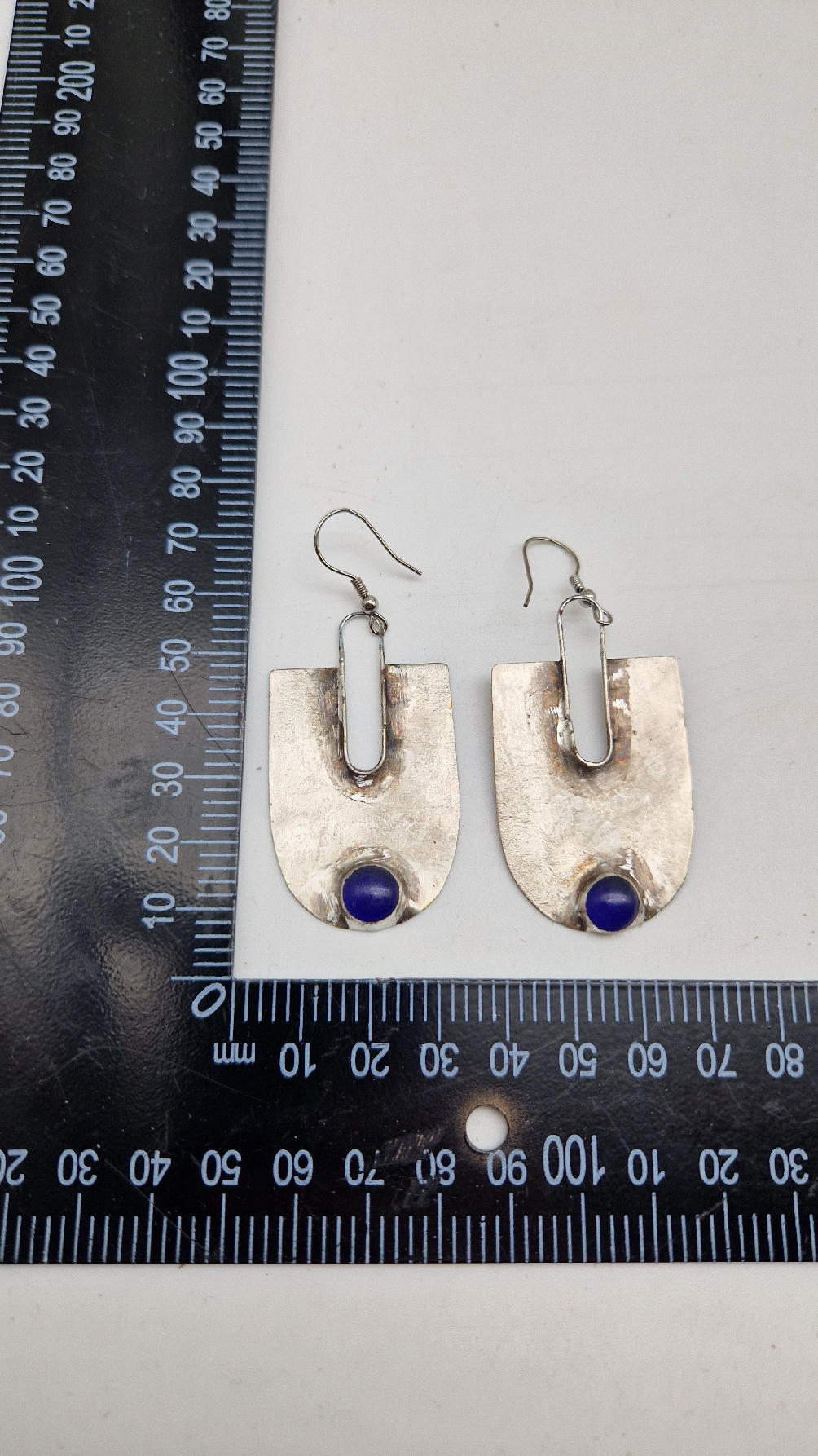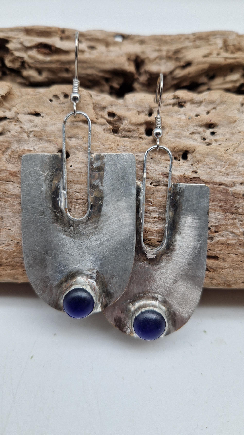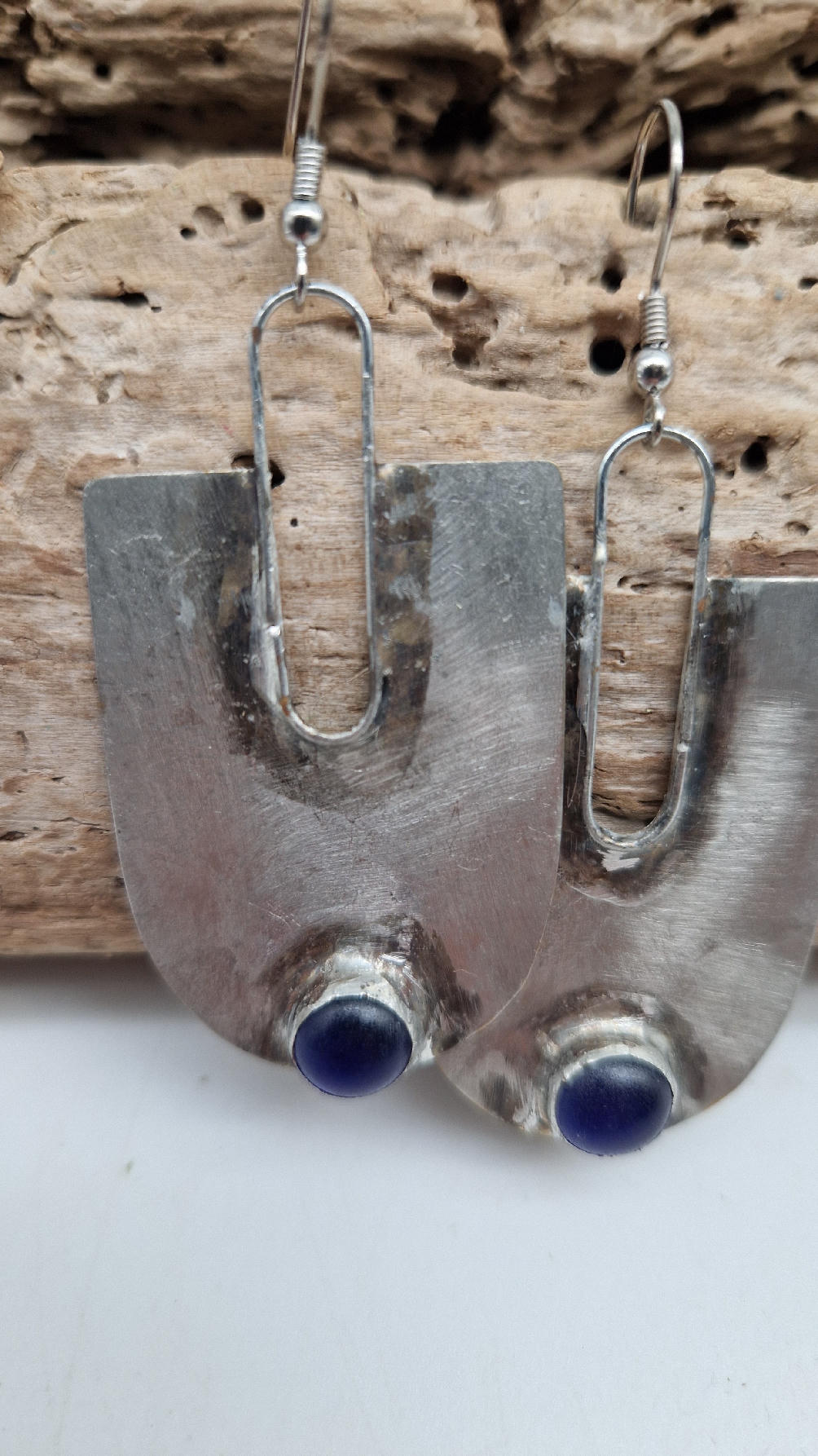 Wykonane z zaczarowanych elementów wyobraźni oraz z miedzianej blachy , srebrzonene i patynowane w obłędnym , wydłużającym szyję kształcie z pięknym, kobaltowym okiem.
