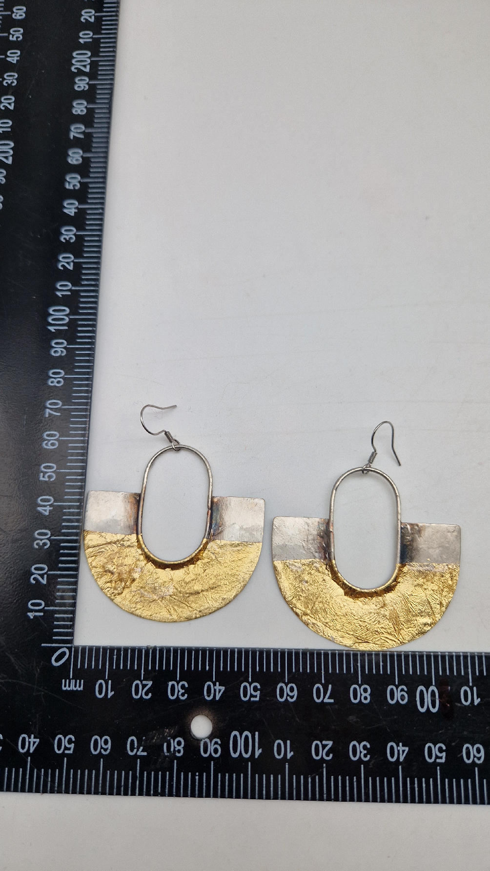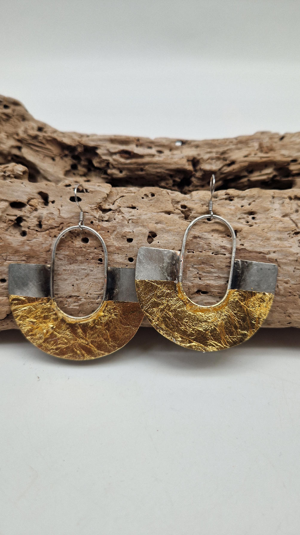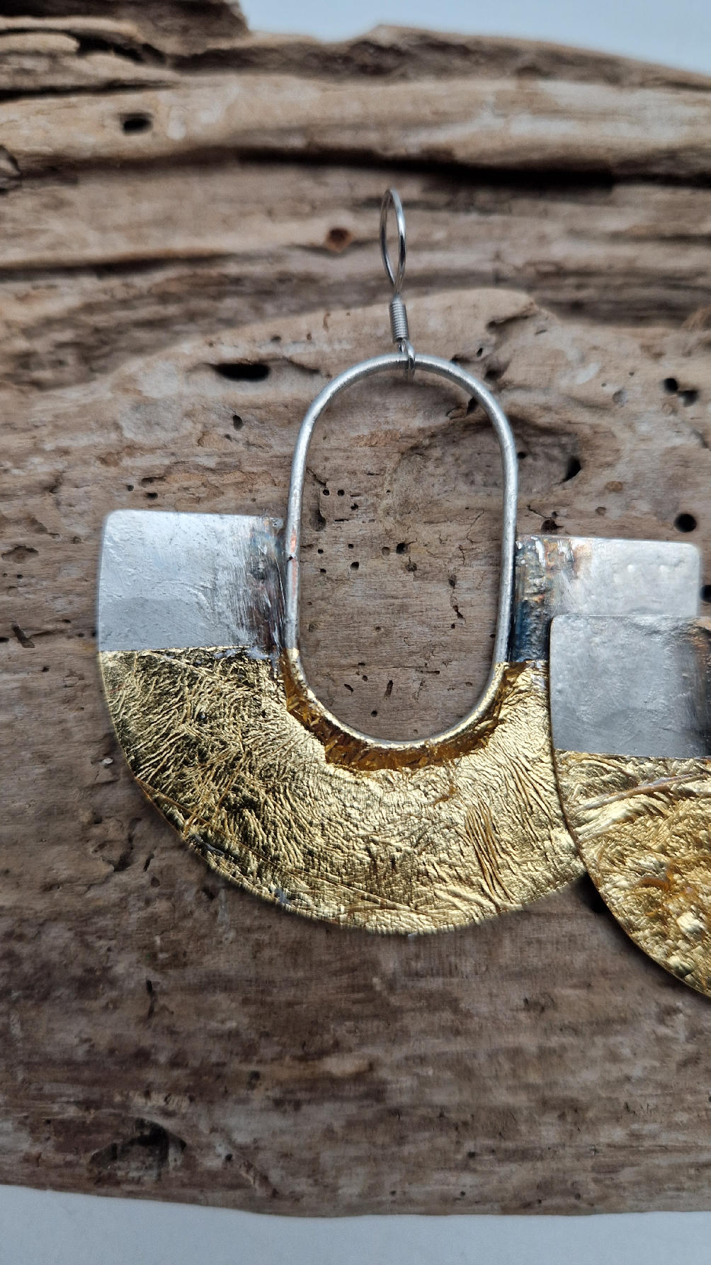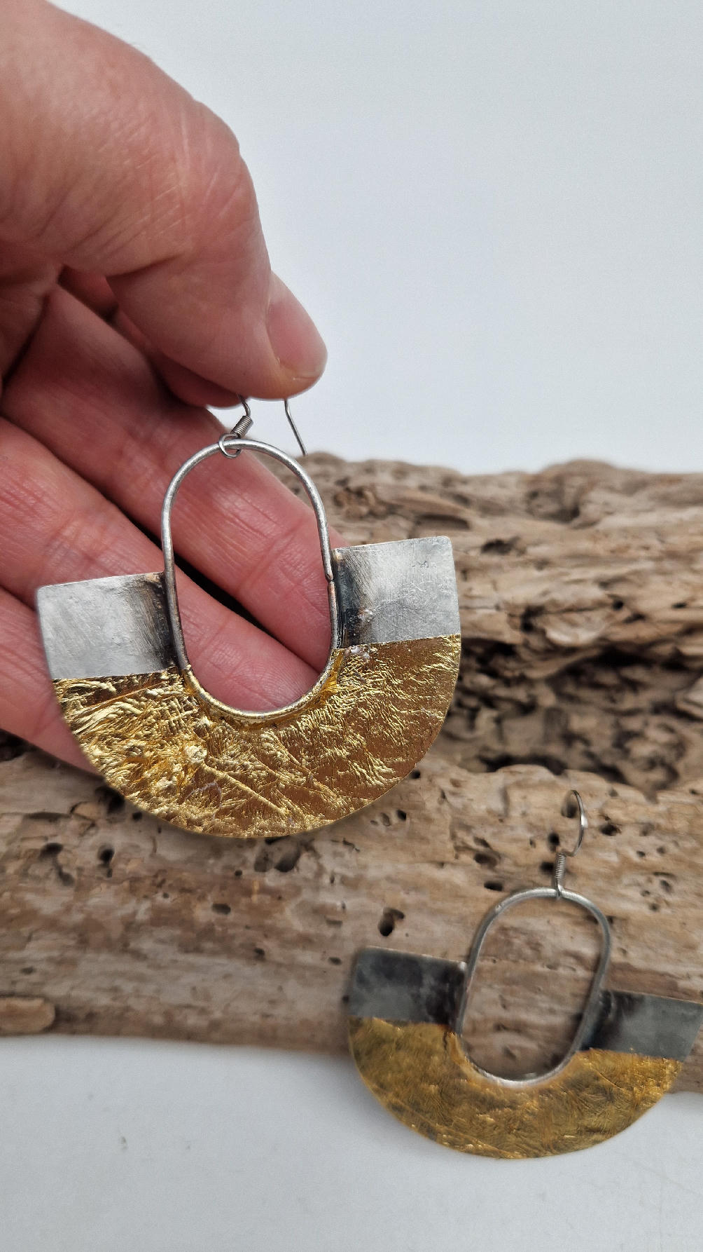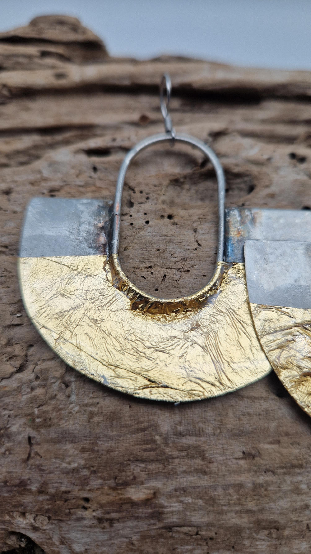 Duże i lekkie kolczyki w nieoczywistym kształcie, zrobione z miedzi, srebrzone i patynowane lekko na czarno, jakby zamoczone w złocie…są naprawdę urocze, eleganckie, przestrzenne, niebanalne, tajemnicze , takie wyjątkowe, ale do wszystkiego, cudne!
