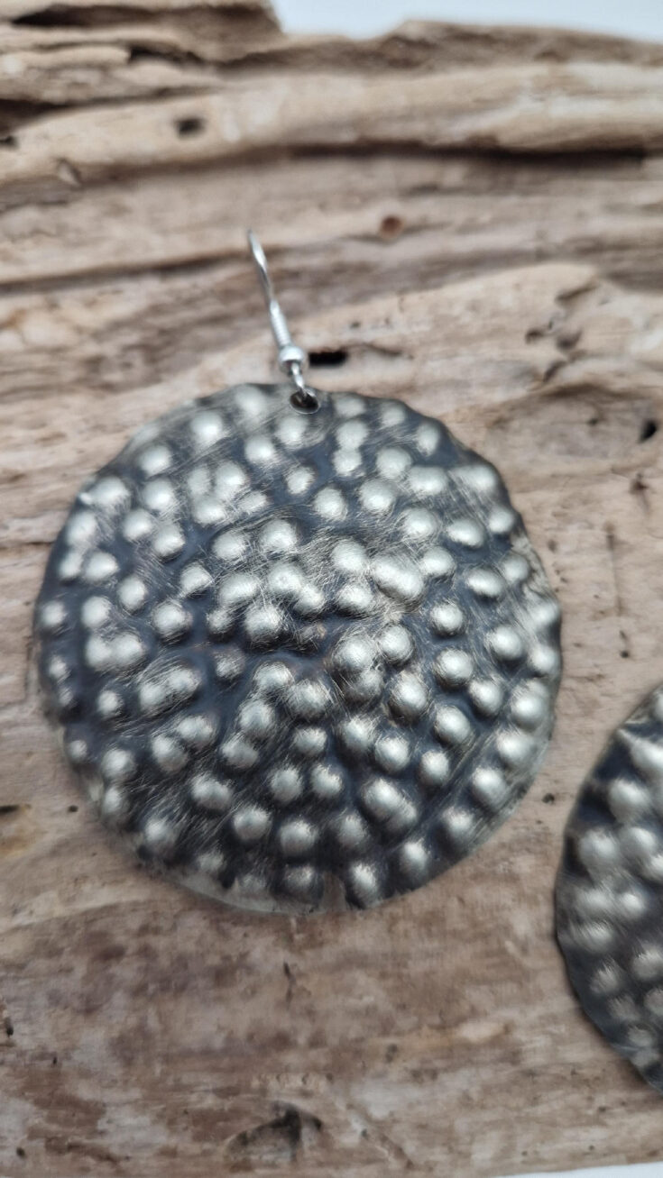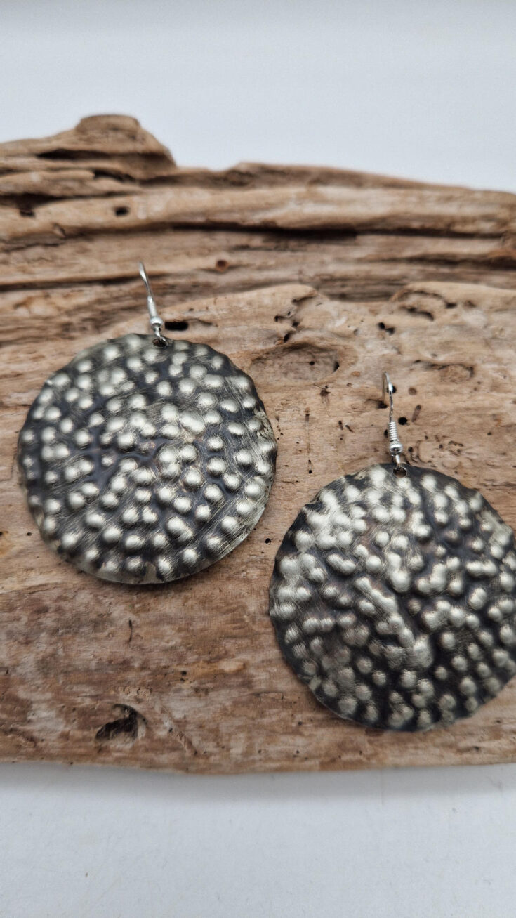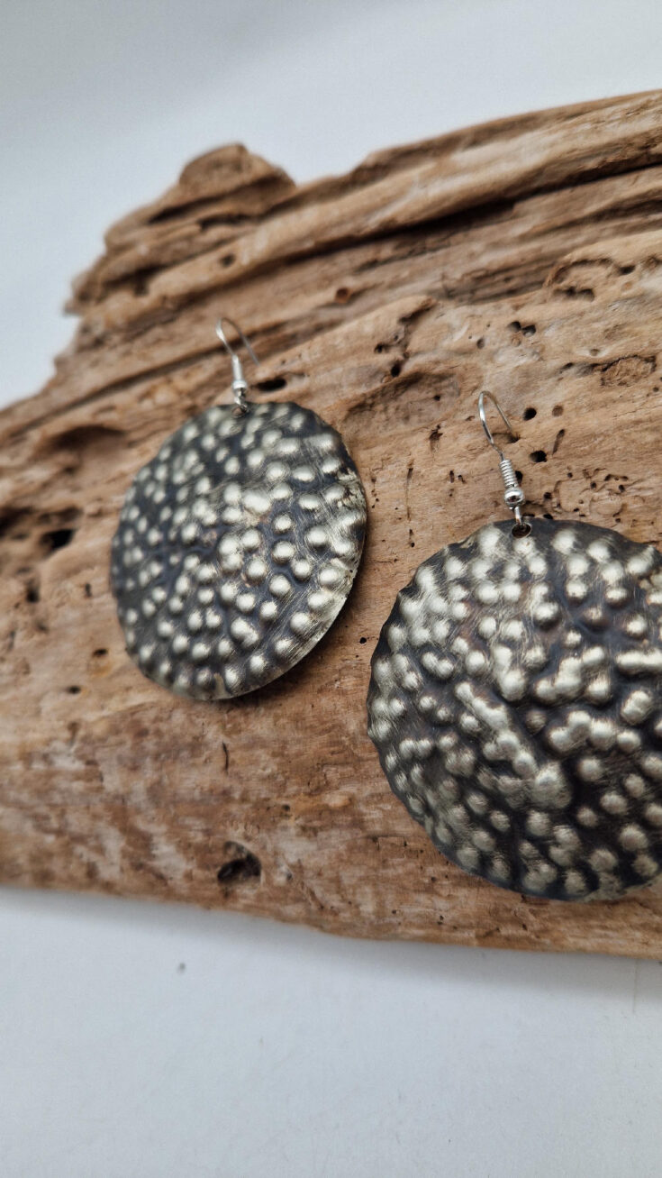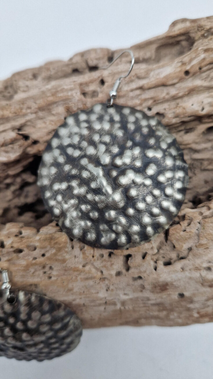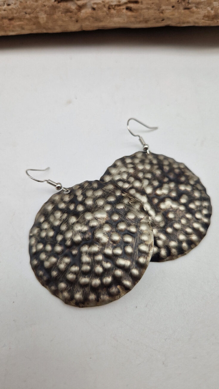 Duże i lekkie kolczyki zrobione z alpaki ,kute, postarzone, patynowane na czarno, z lekkimi prześwitami dwustronne, z fajowymi wypustkami, przestrzenne, niebanalne, tajemnicze , takie wyjątkowe, ale do wszystkiego, cudne!