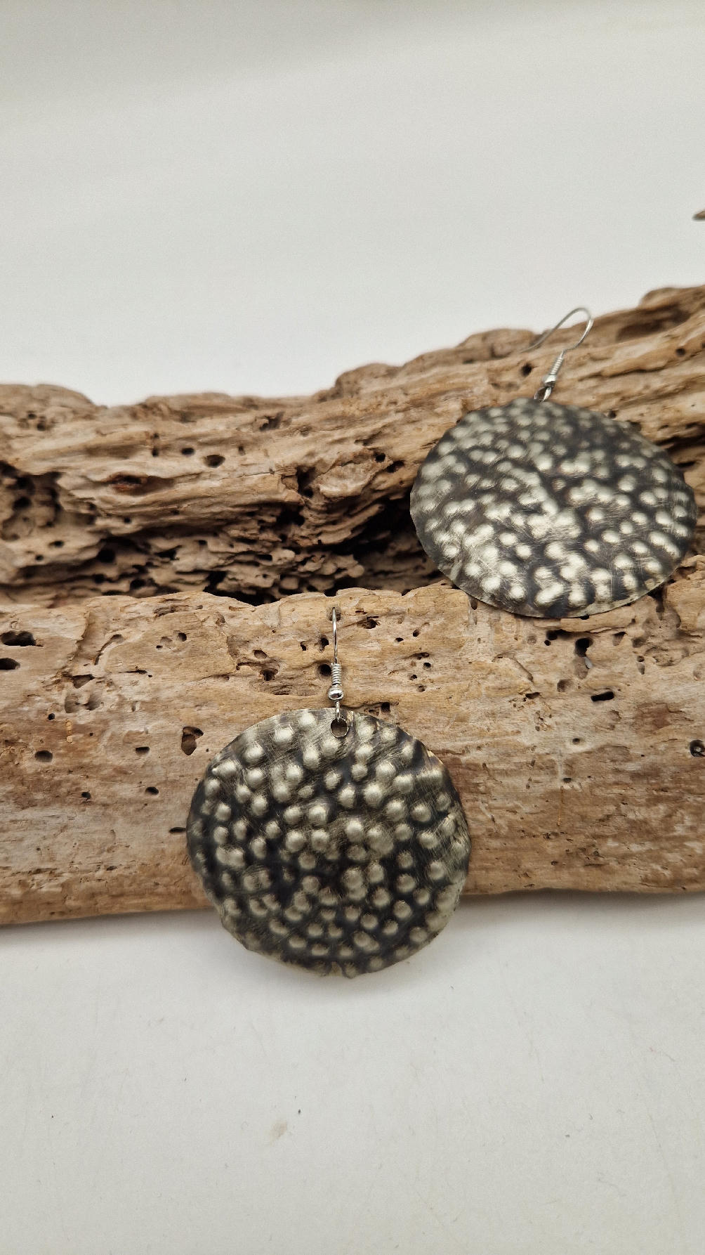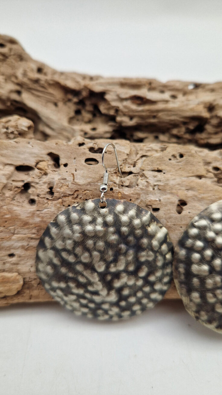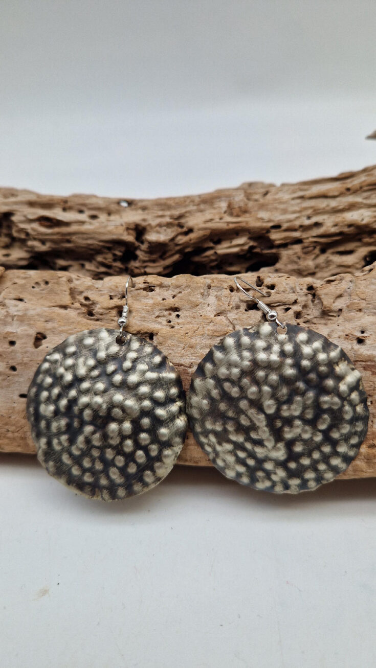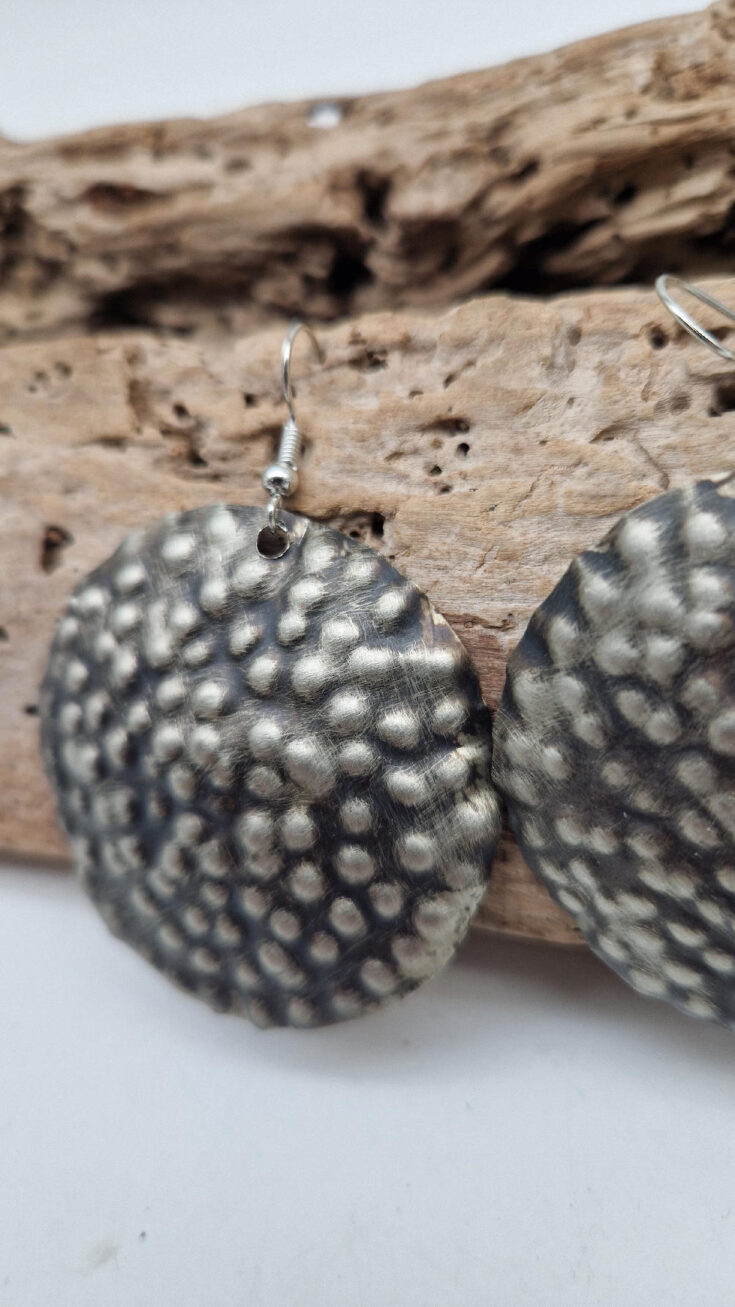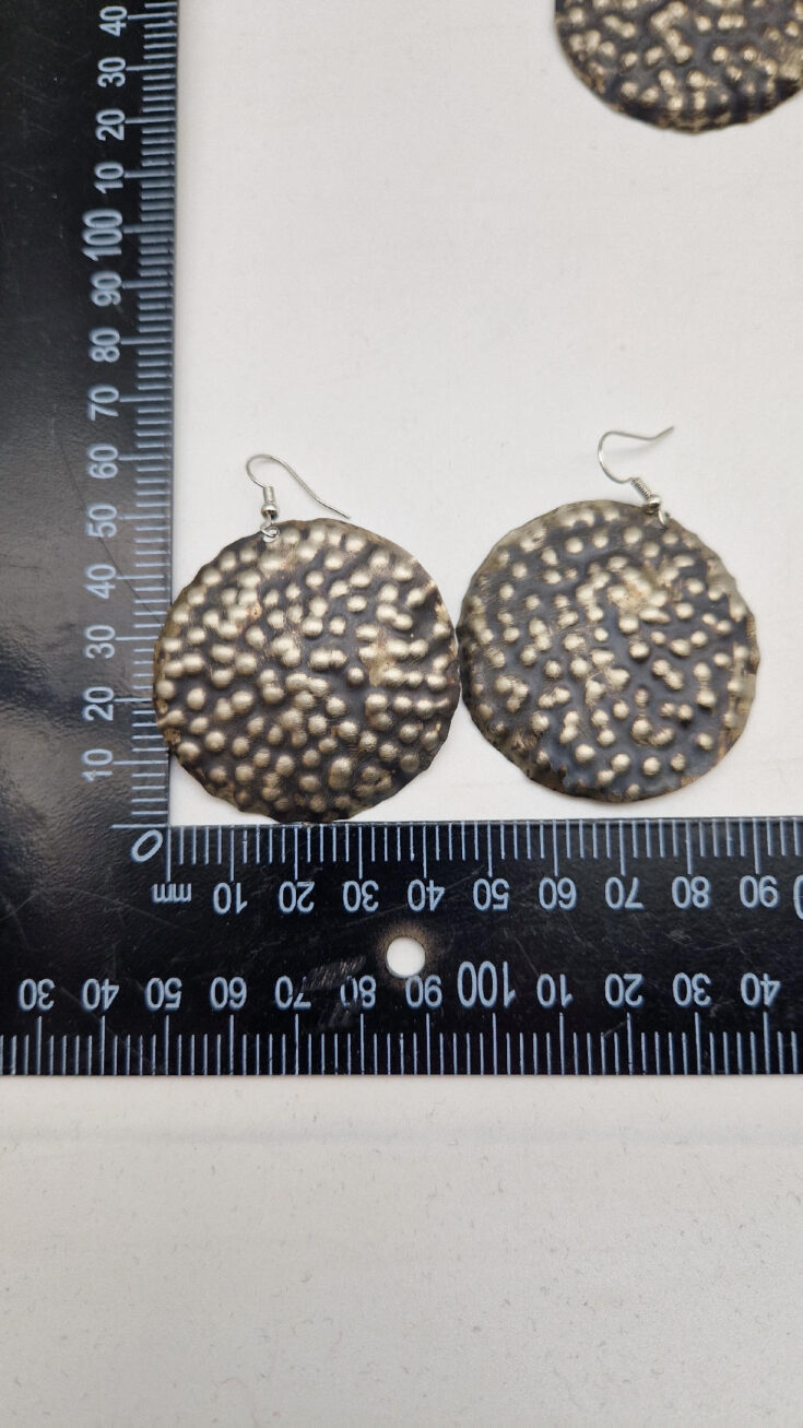 Duże i lekkie kolczyki zrobione z alpaki ,kute, postarzone, patynowane na czarno, z lekkimi prześwitami dwustronne, z fajowymi wypustkami, przestrzenne, niebanalne, tajemnicze , takie wyjątkowe, ale do wszystkiego, cudne!