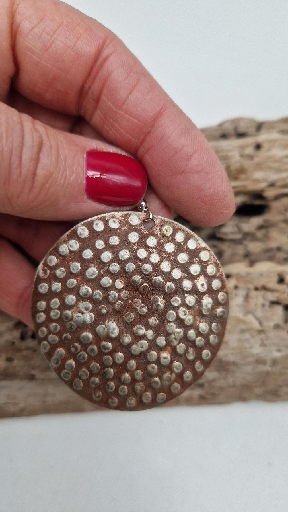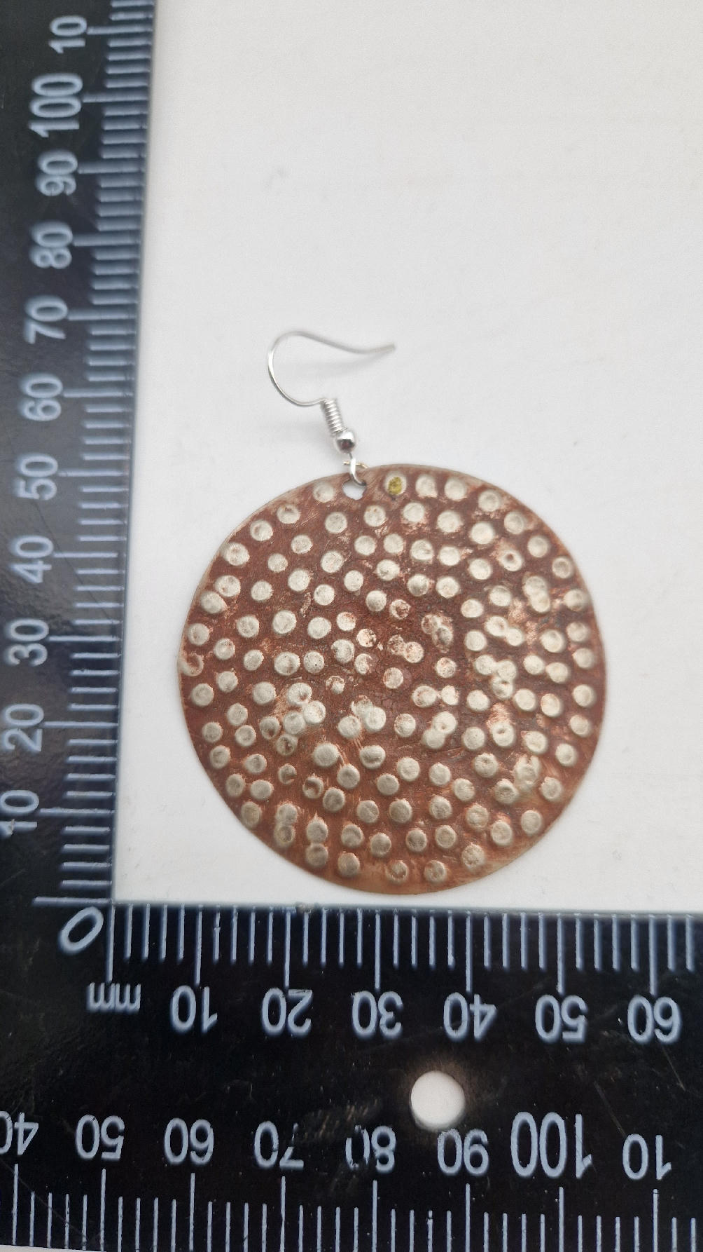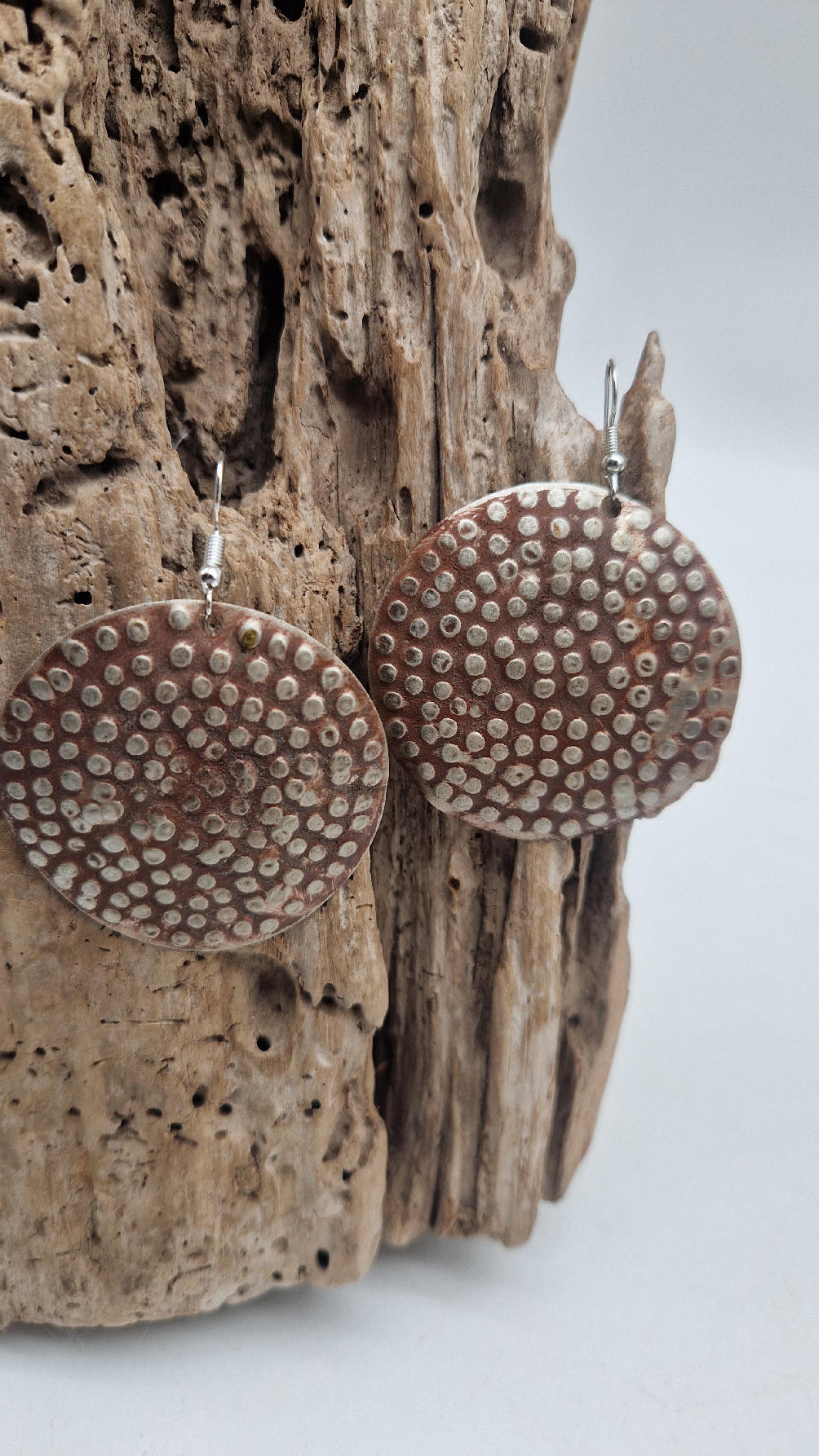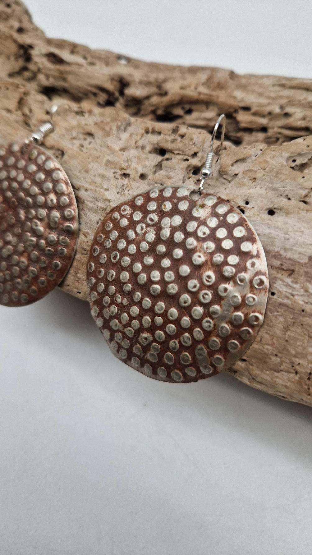 Idealne – bo okrągłe, niebanalne, oryginalne, w przecudnym kolorze…Duże i lekkie kolczyki zrobione z mosiądzu, kute, patynowane na brązow0, a właściwie ciemno rudo, z lekkimi prześwitami mosiądzu , dwustronne, z fajowymi wypustkami, .. przestrzenne, niebanalne, tajemnicze , takie wyjątkowe, ale do wszystkiego, cudne!