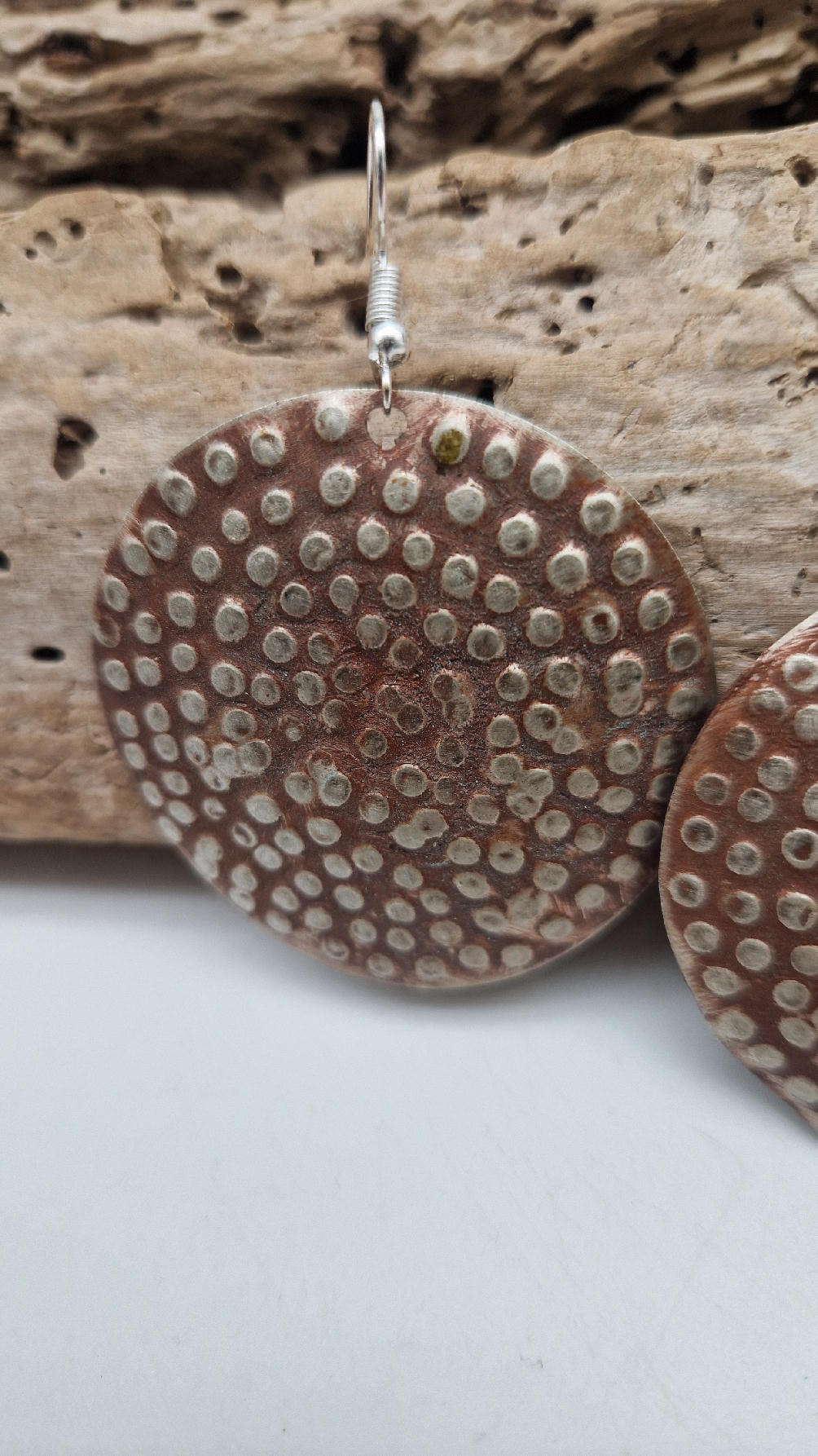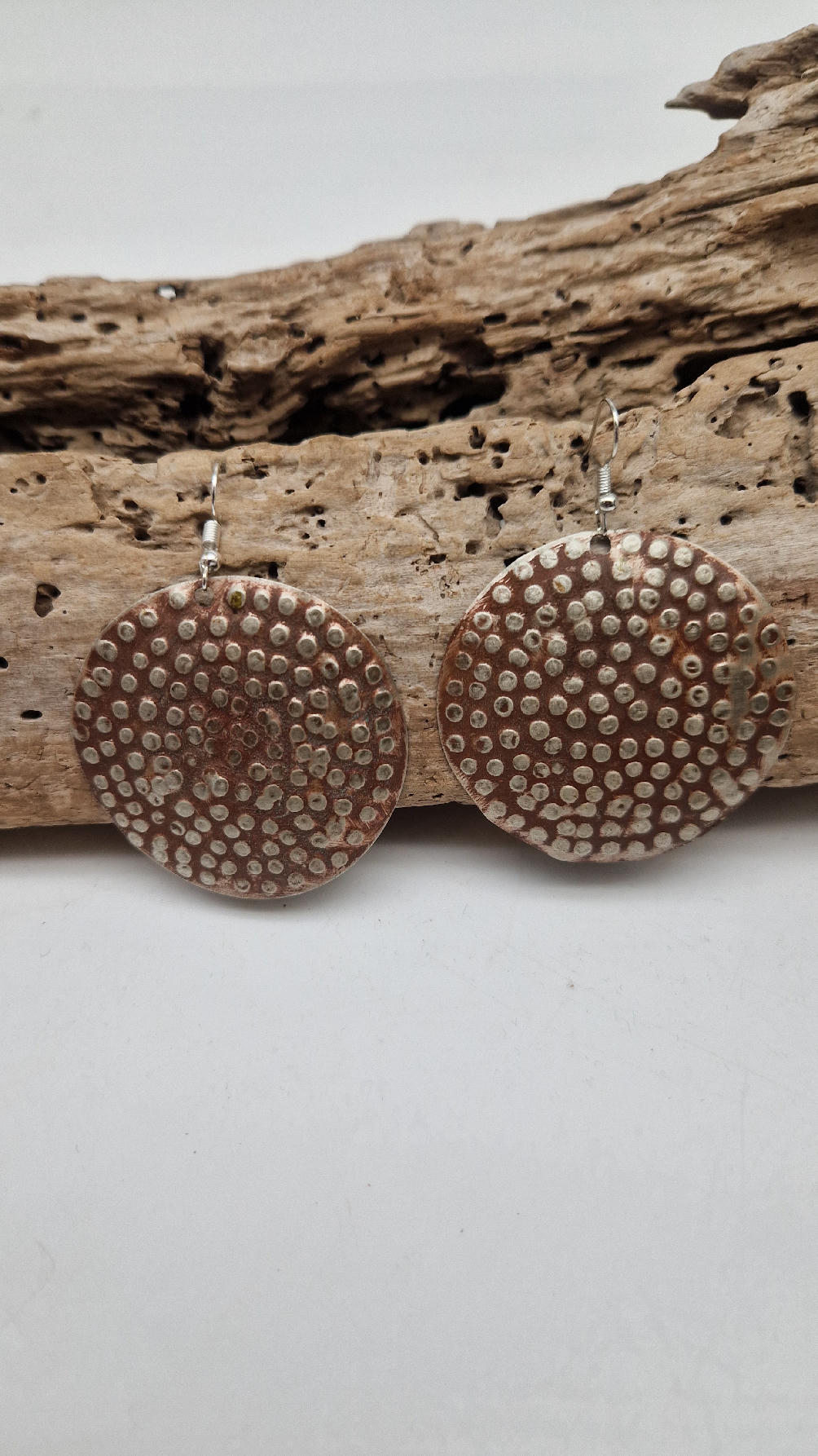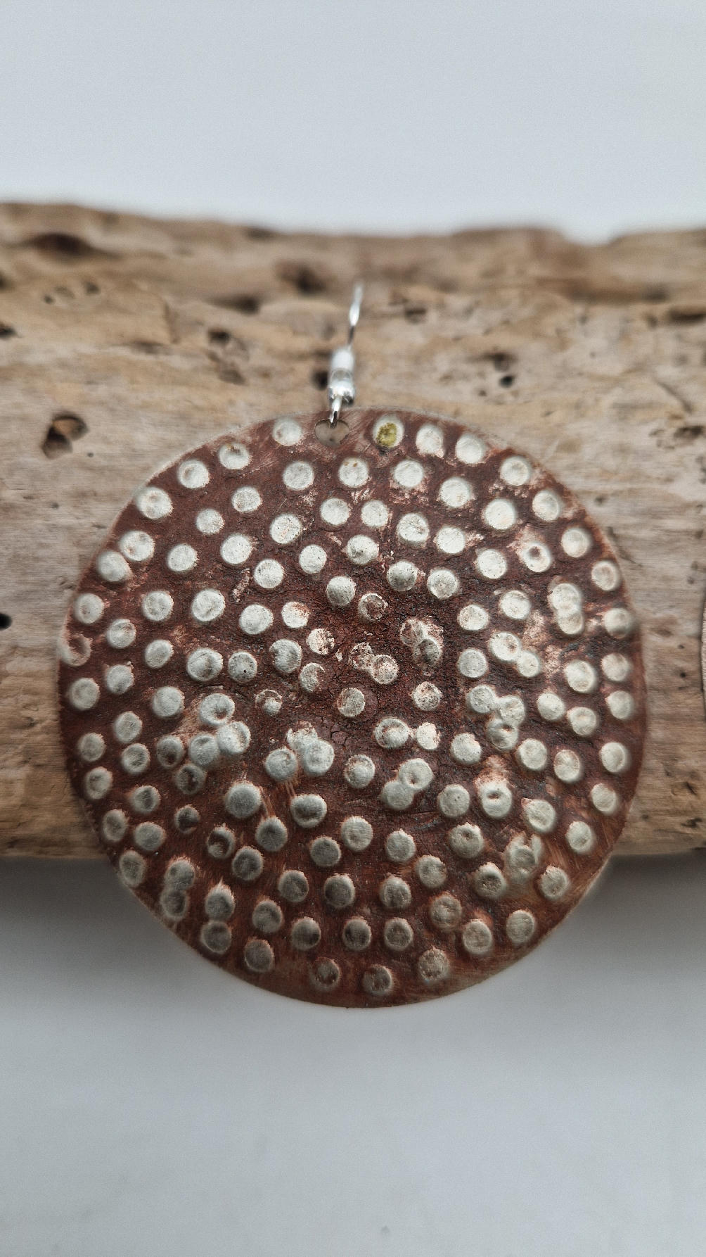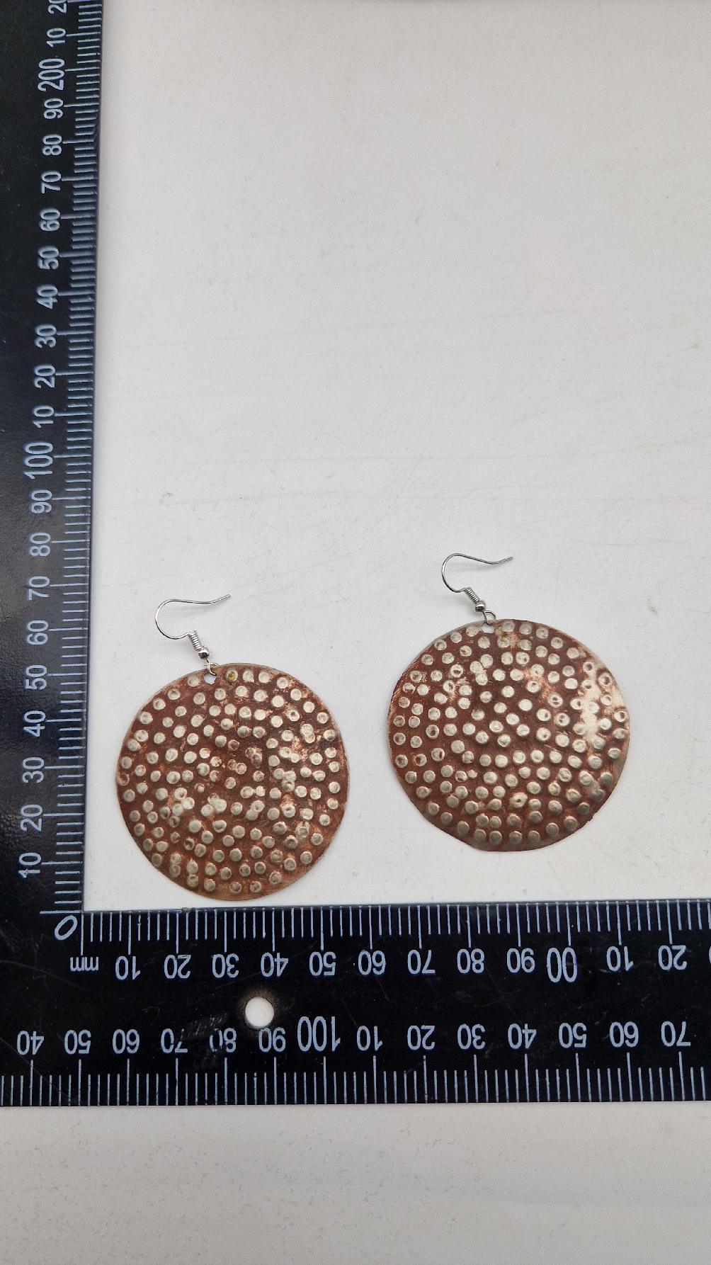 Idealne – bo okrągłe, niebanalne, oryginalne, w przecudnym kolorze…Duże i lekkie kolczyki zrobione z mosiądzu, kute, patynowane na brązow0, a właściwie ciemno rudo, z lekkimi prześwitami mosiądzu , dwustronne, z fajowymi wypustkami, .. przestrzenne, niebanalne, tajemnicze , takie wyjątkowe, ale do wszystkiego, cudne!