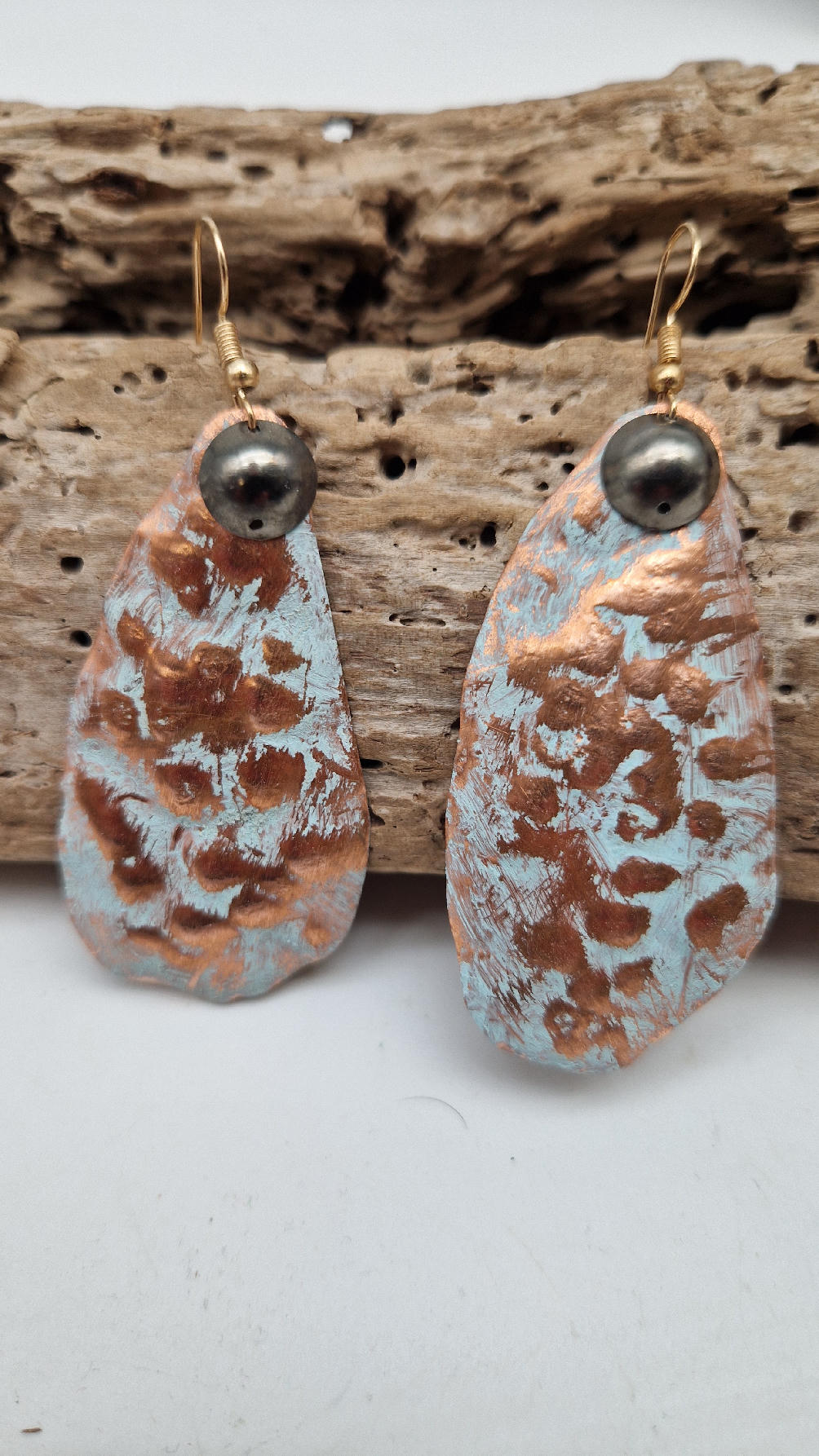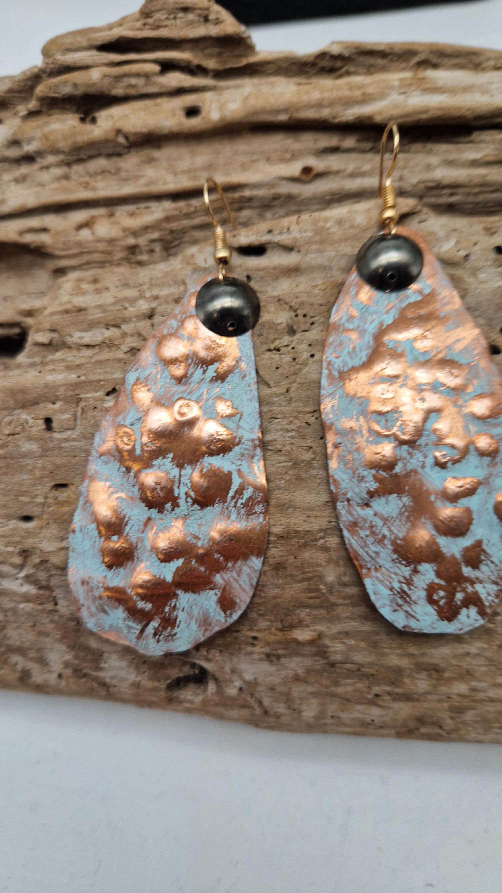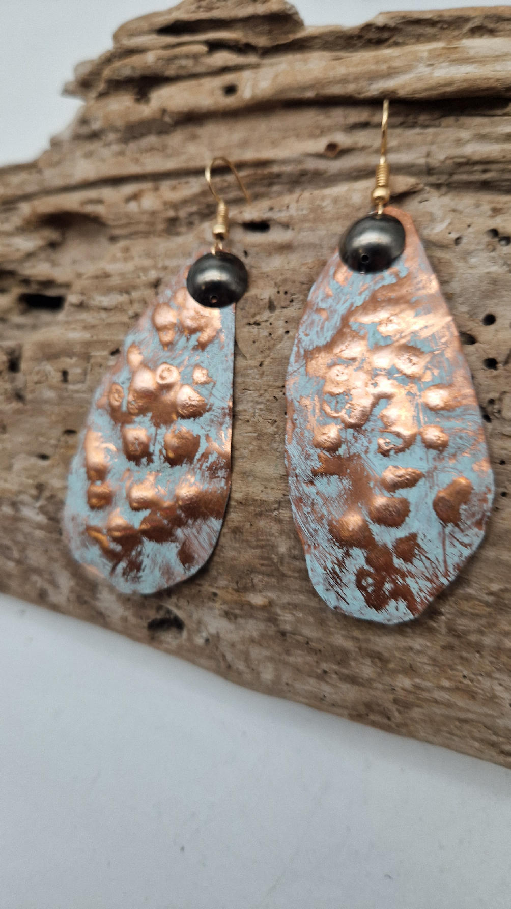 Duże i lekkie podłużne, ale niesymetryczne, lekko szalone śliczne kolczyki zrobione z miedzi,  z grafitowa kropką…kute, postarzone, patynowane na biało z odrobiną mszystej ,  zieleni… z lekkimi prześwitami … przestrzenne, niebanalne,  tajemnicze , takie wyjątkowe, ale do wszystkiego, cudne!