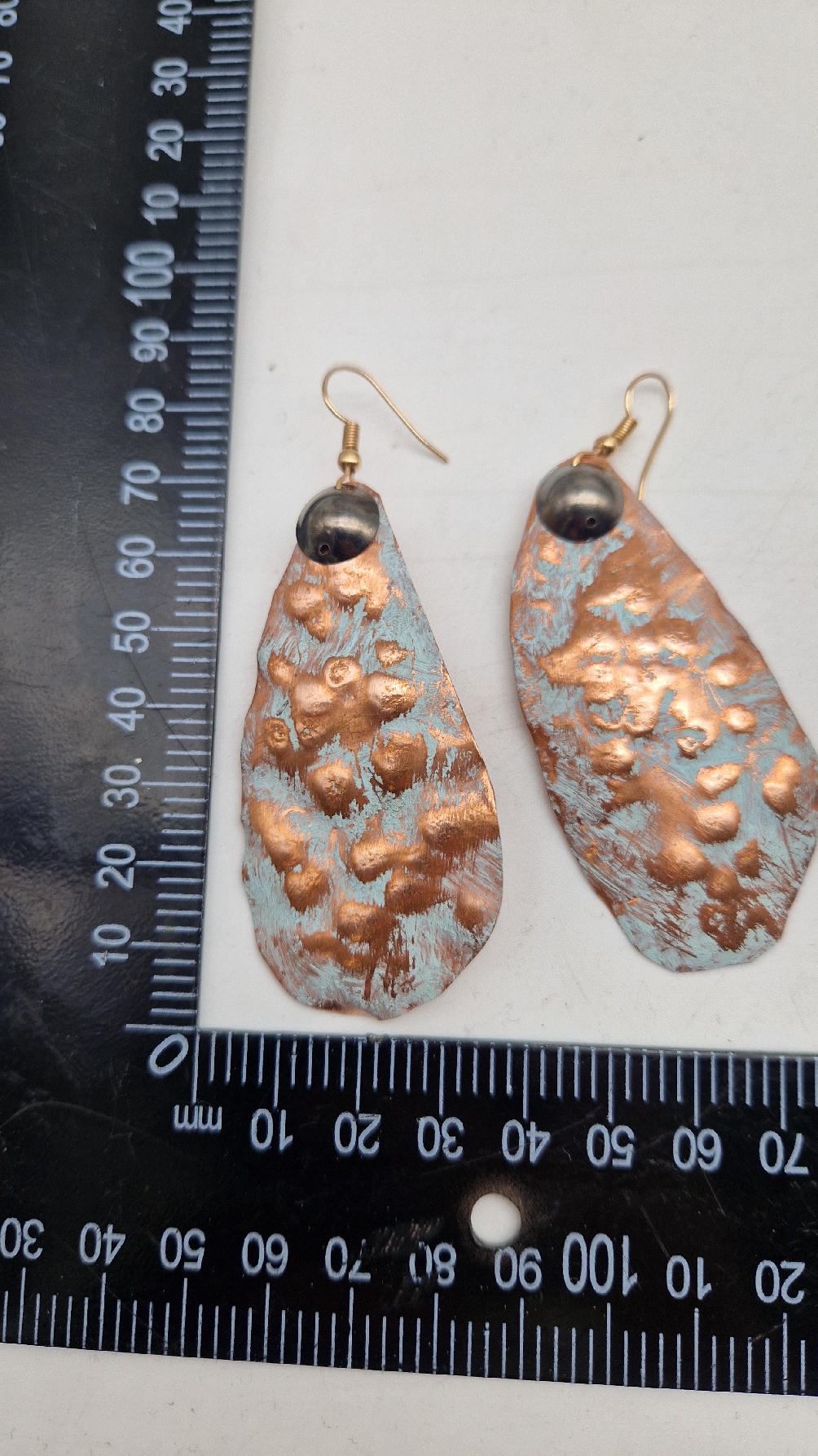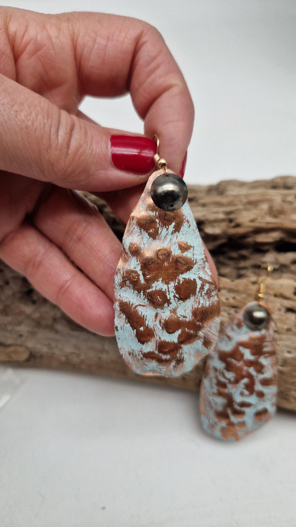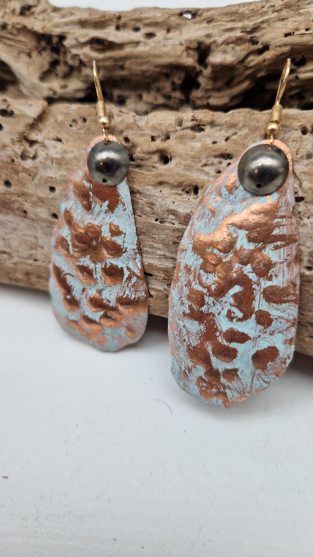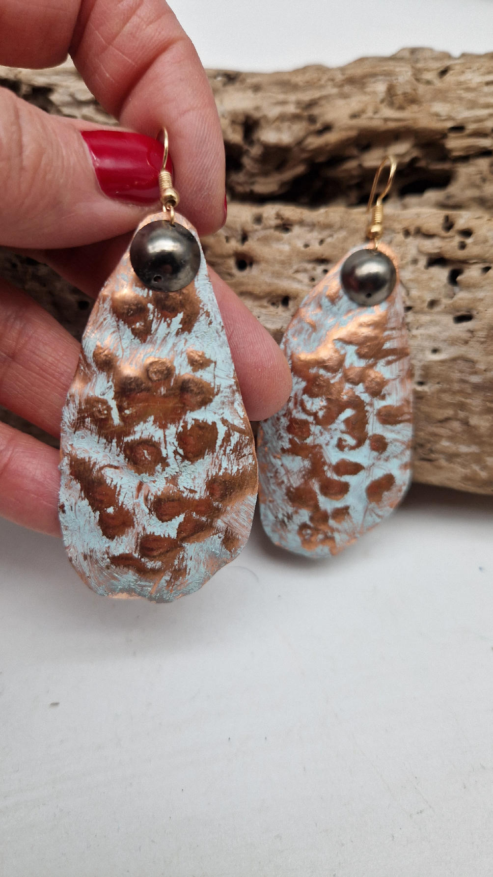 Duże i lekkie podłużne, ale niesymetryczne, lekko szalone śliczne kolczyki zrobione z miedzi,  z grafitowa kropką…kute, postarzone, patynowane na biało z odrobiną mszystej ,  zieleni… z lekkimi prześwitami … przestrzenne, niebanalne,  tajemnicze , takie wyjątkowe, ale do wszystkiego, cudne!
