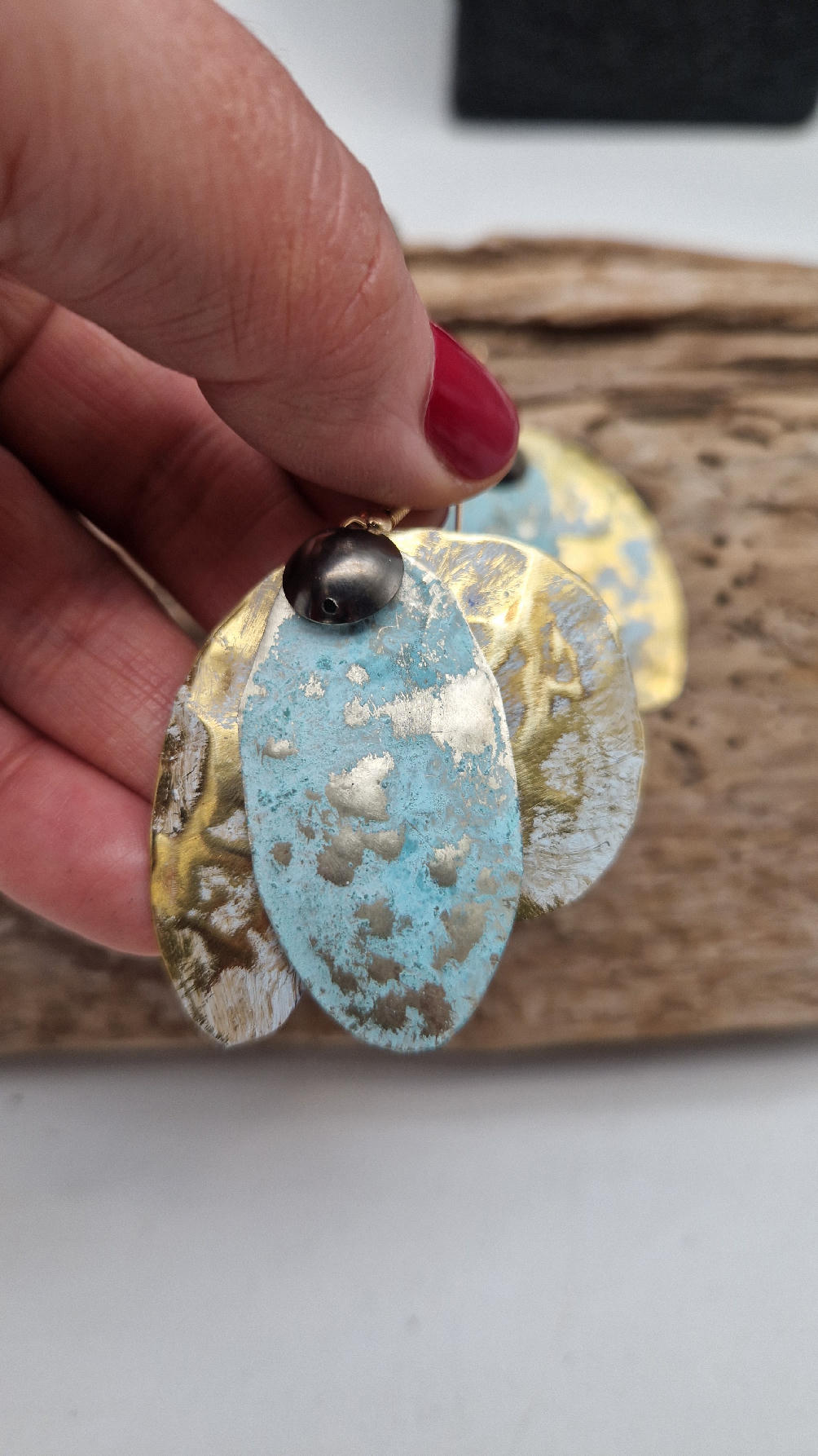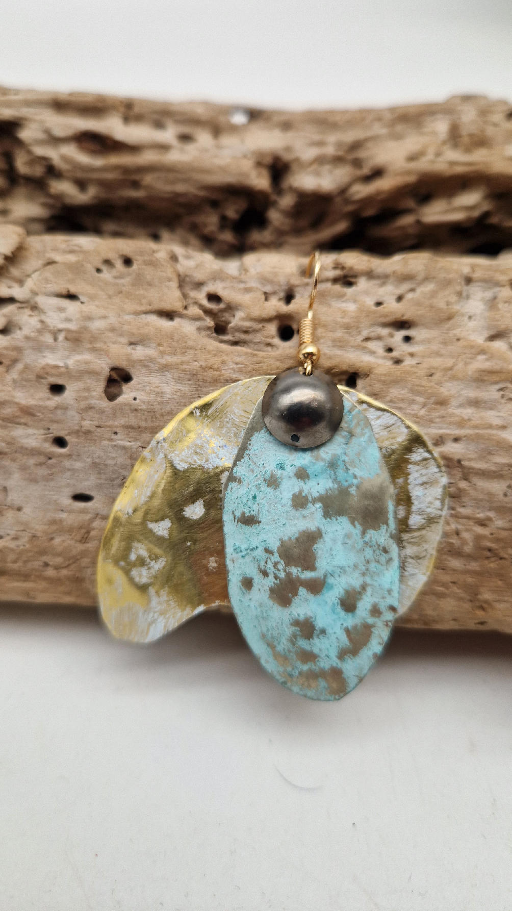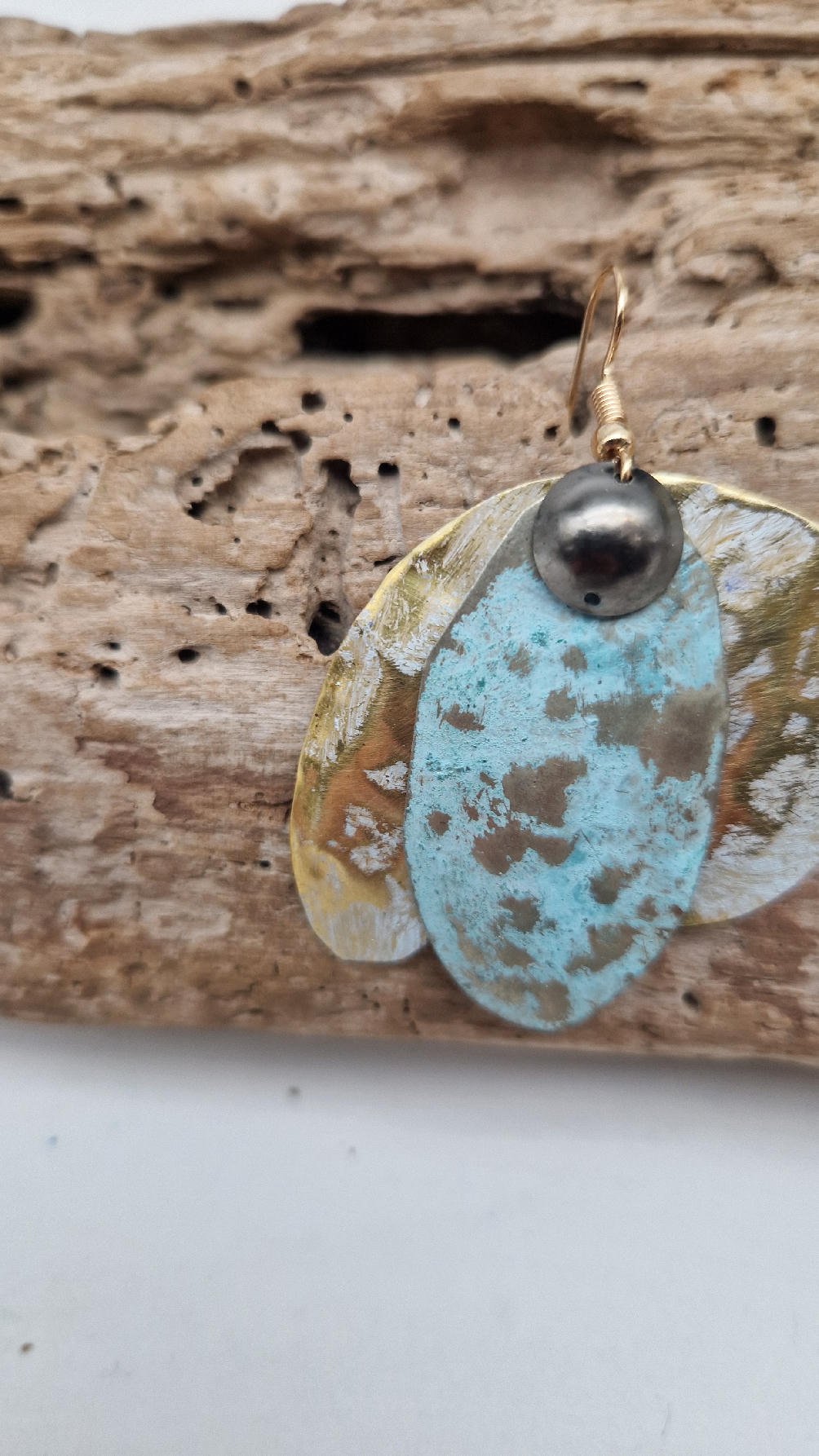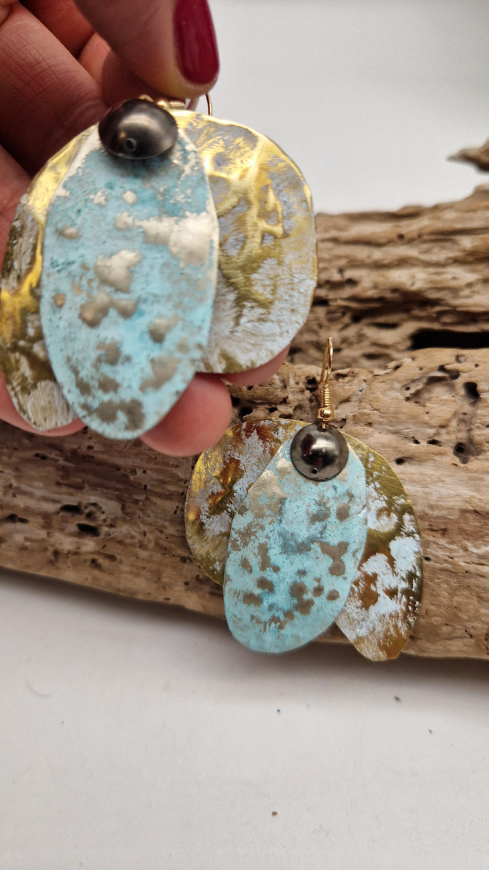 Duże i lekkie niesymetryczne, dwuczęsciowe, lekko szalone śliczne kolczyki zrobione z mosiądzu i alpaki, wyglądają jak motyle…z grafitową kropką…kute, postarzone, patynowane na biało z odrobiną mszystej , zieleni… z lekkimi prześwitami … przestrzenne, niebanalne, tajemnicze , takie wyjątkowe, przecudne!