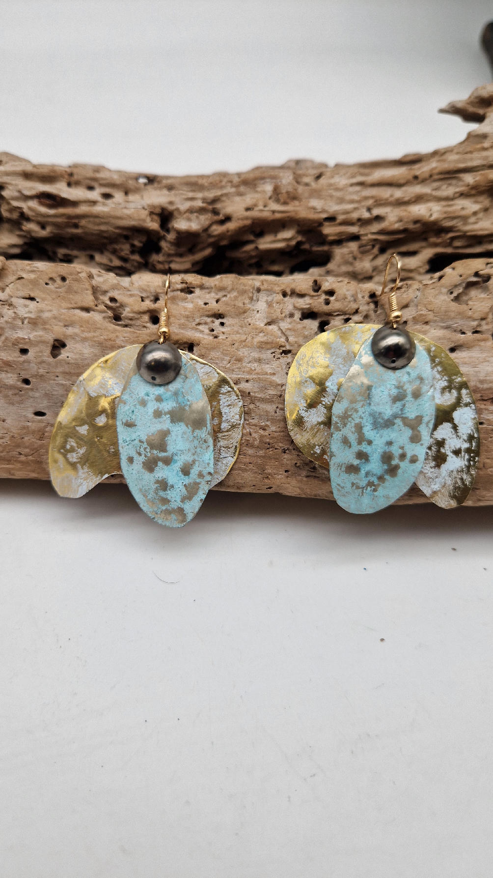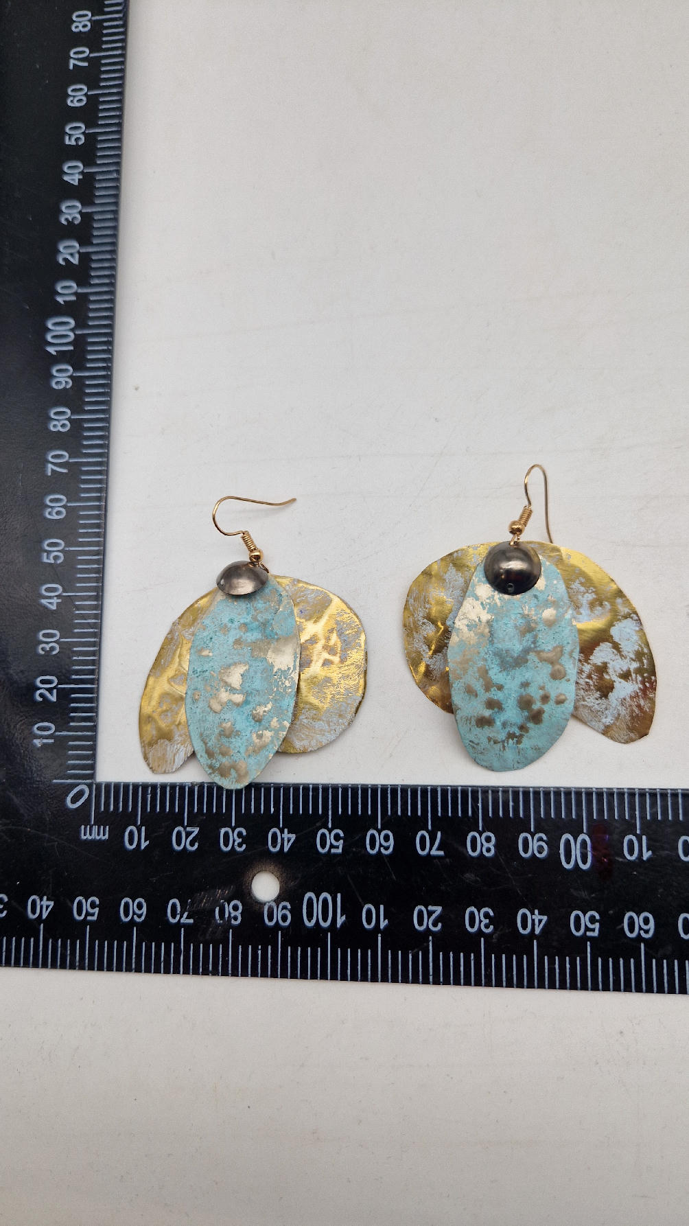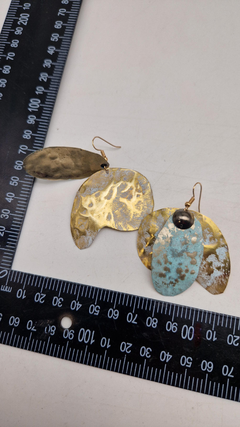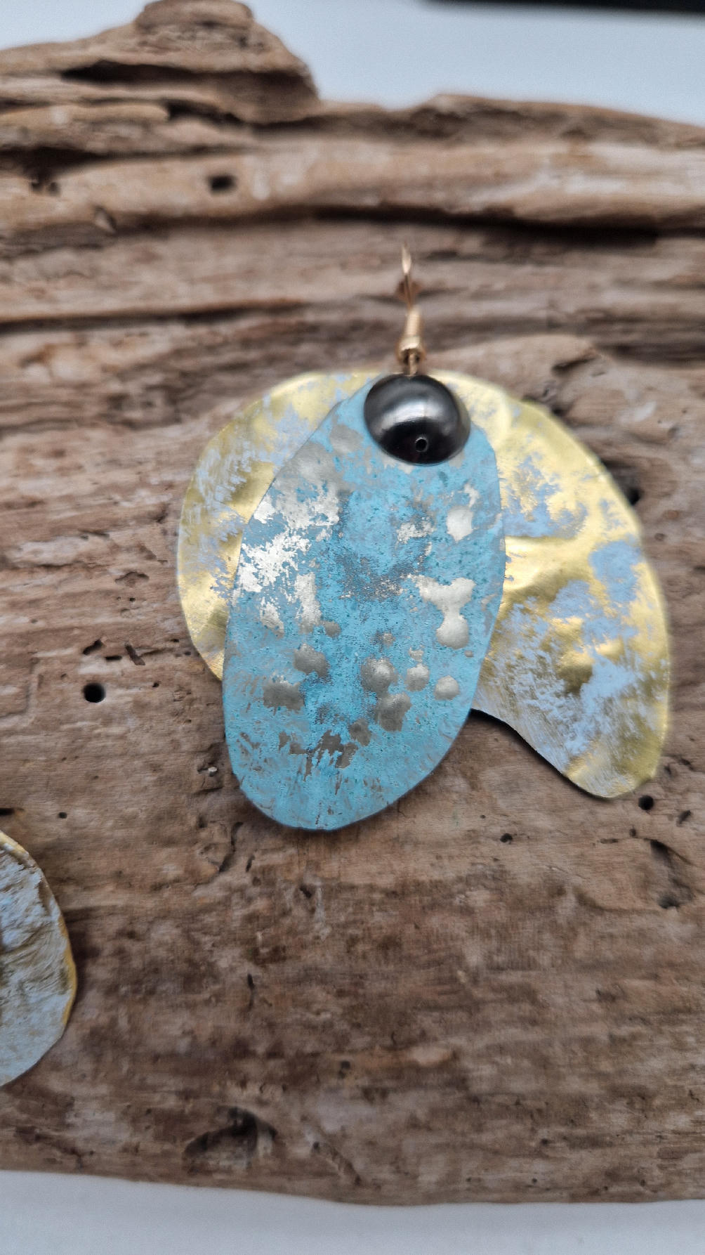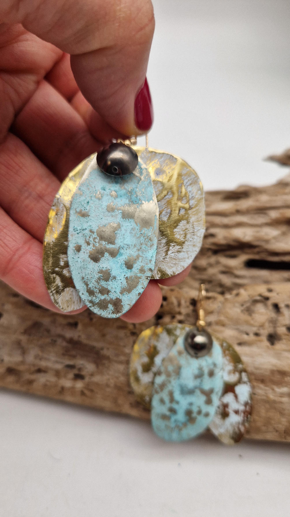 Duże i lekkie niesymetryczne, dwuczęsciowe, lekko szalone śliczne kolczyki zrobione z mosiądzu i alpaki, wyglądają jak motyle…z grafitową kropką…kute, postarzone, patynowane na biało z odrobiną mszystej , zieleni… z lekkimi prześwitami … przestrzenne, niebanalne, tajemnicze , takie wyjątkowe, przecudne!