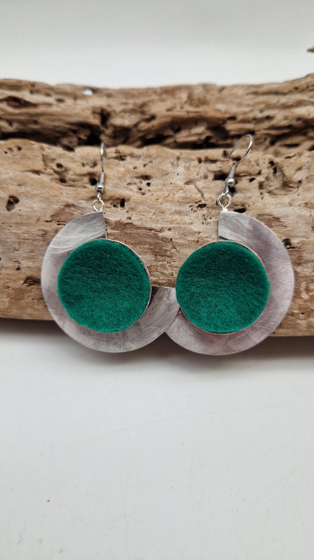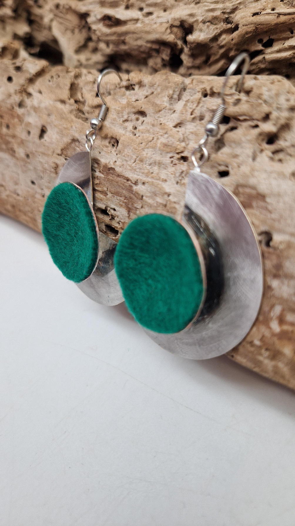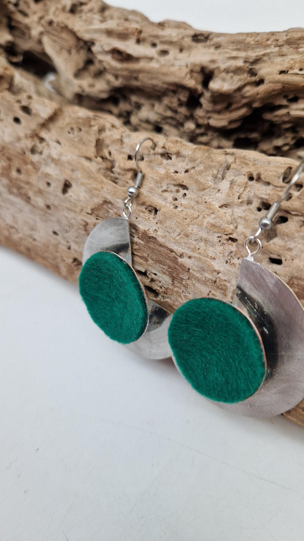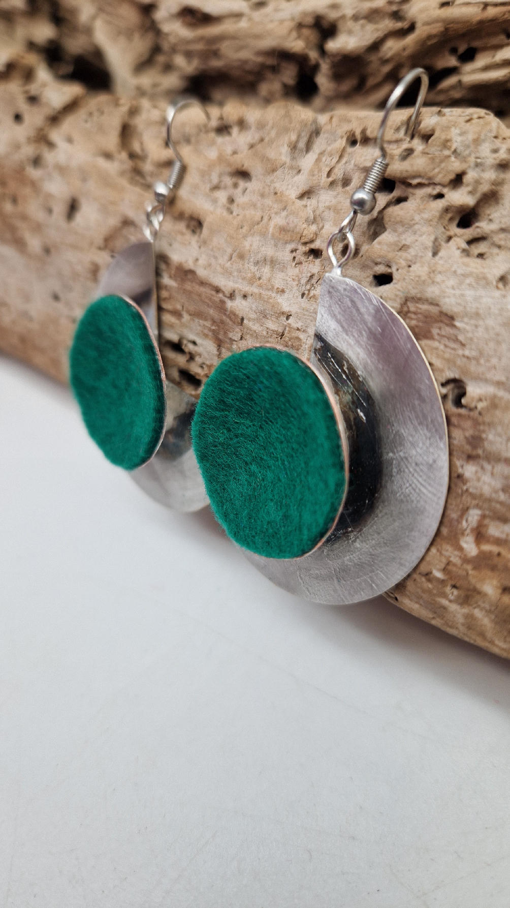 Duże i lekkie kolczyki w nieoczywistym kształcie, zrobione z miedzi, srebrzone i patynowane lekko na czarno, z intensywnie zielonym środkiem…Zielony środek zrobiony jest z filcu, wklejonego w specjalnie do tego zrobiona miseczkę. Kolczyki są przestrzenne, dwuwarstwowe, bo środek, jest jakby zawieszony nad płaskim dołem…Kolczyki są naprawdę urocze, eleganckie, przestrzenne, niebanalne, tajemnicze , takie wyjątkowe, ale do wszystkiego, cudne!