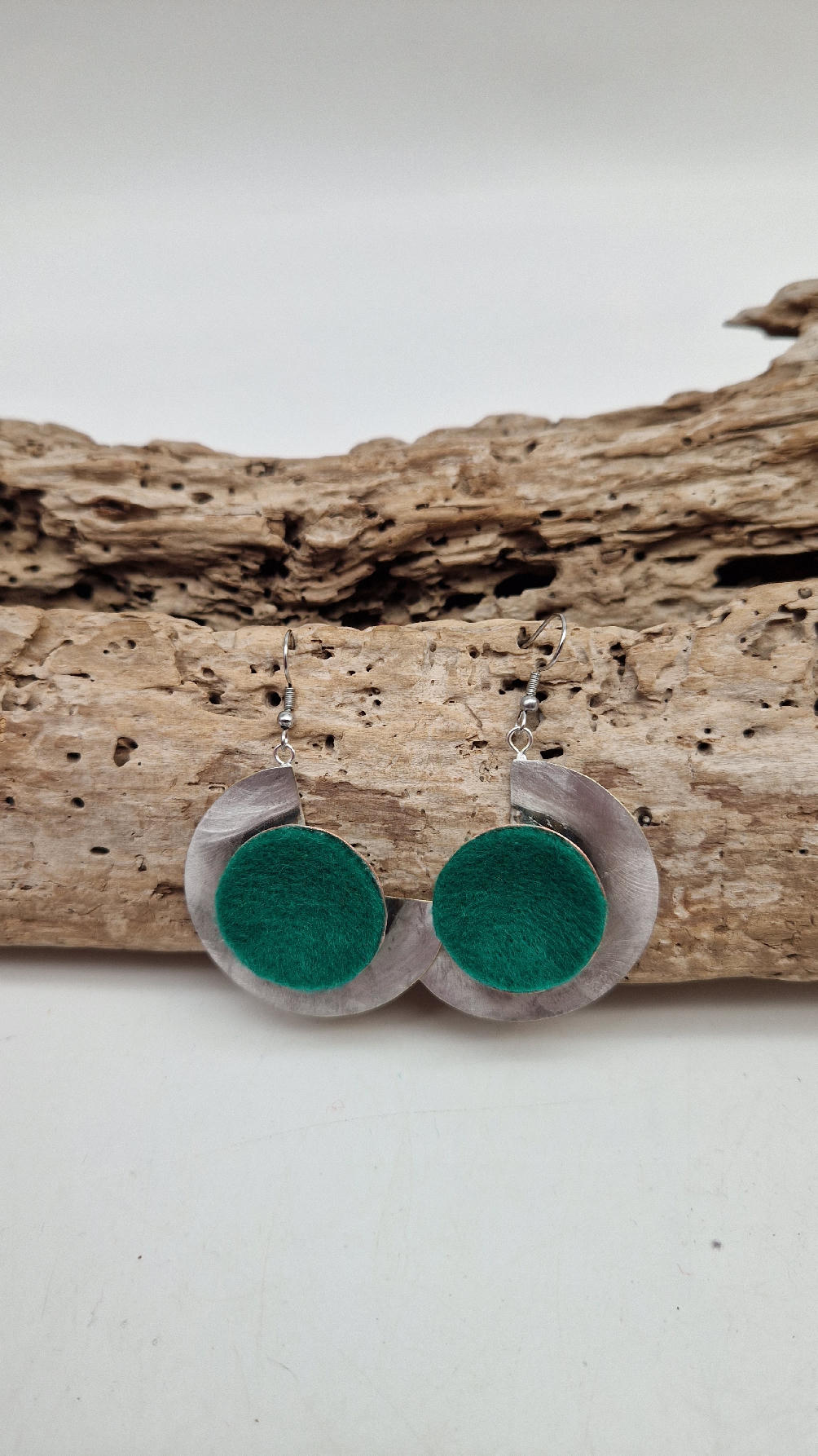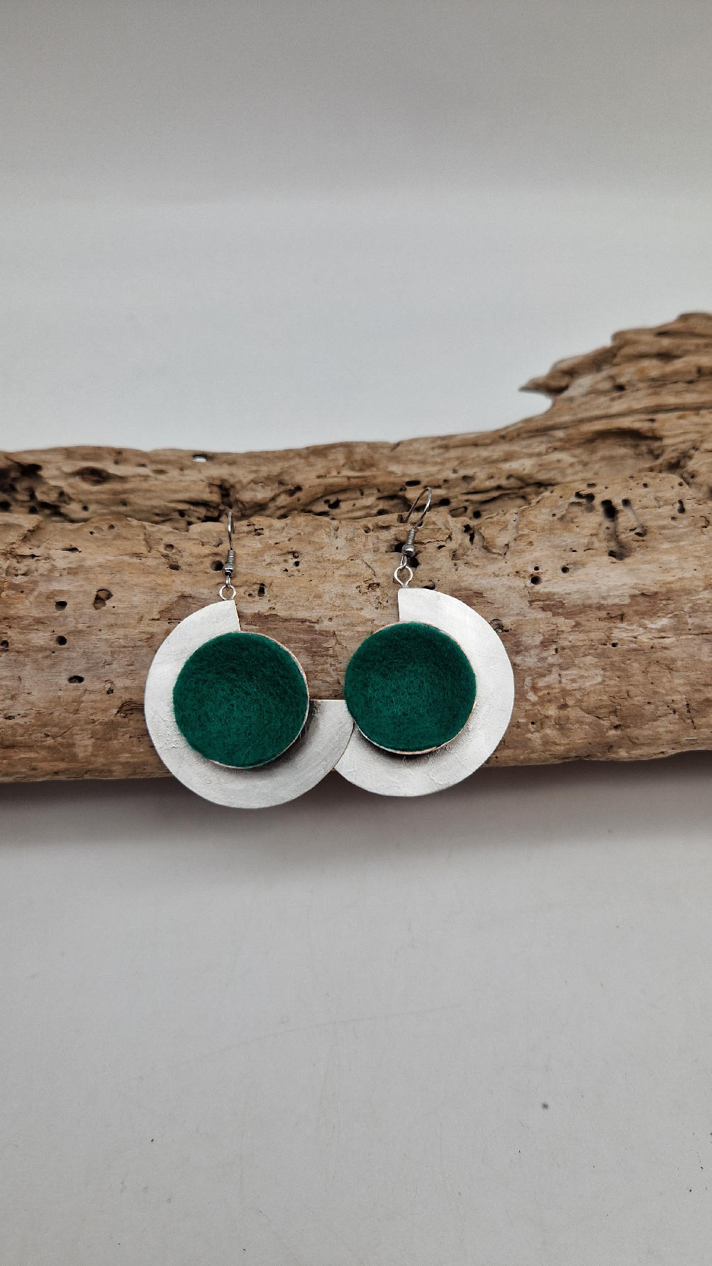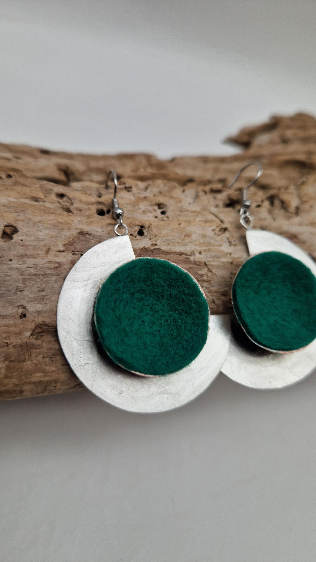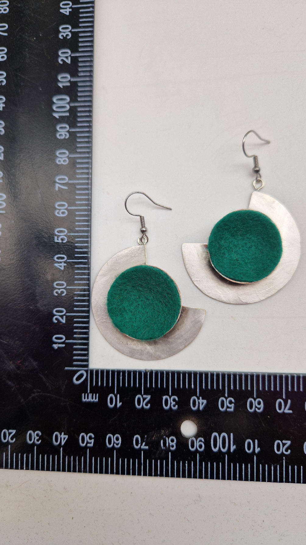 Duże i lekkie kolczyki w nieoczywistym kształcie, zrobione z miedzi, srebrzone i patynowane lekko na czarno, z intensywnie zielonym środkiem…Zielony środek zrobiony jest z filcu, wklejonego w specjalnie do tego zrobiona miseczkę. Kolczyki są przestrzenne, dwuwarstwowe, bo środek, jest jakby zawieszony nad płaskim dołem…Kolczyki są naprawdę urocze, eleganckie, przestrzenne, niebanalne, tajemnicze , takie wyjątkowe, ale do wszystkiego, cudne!