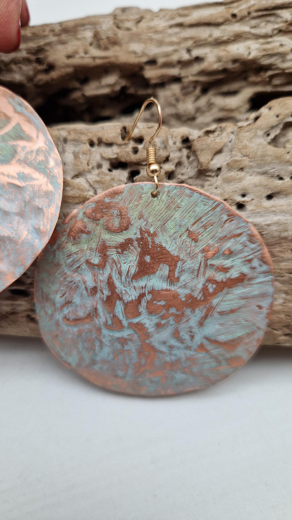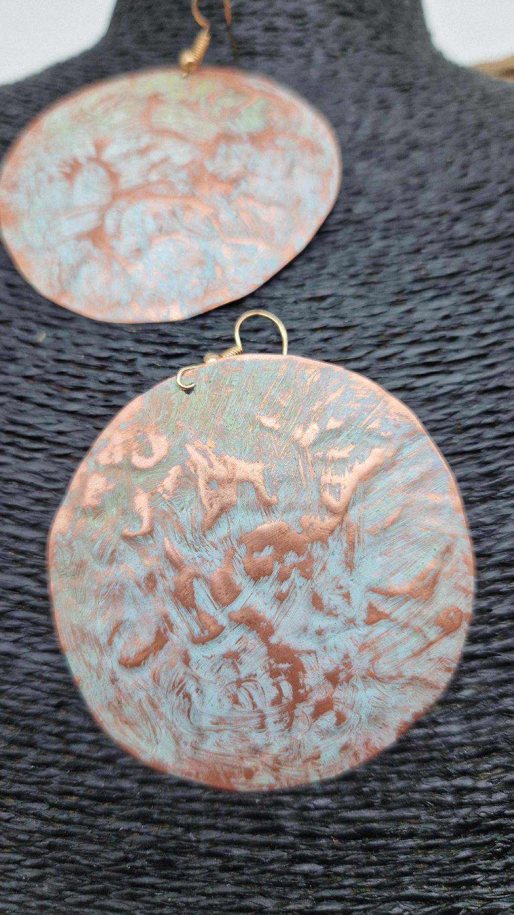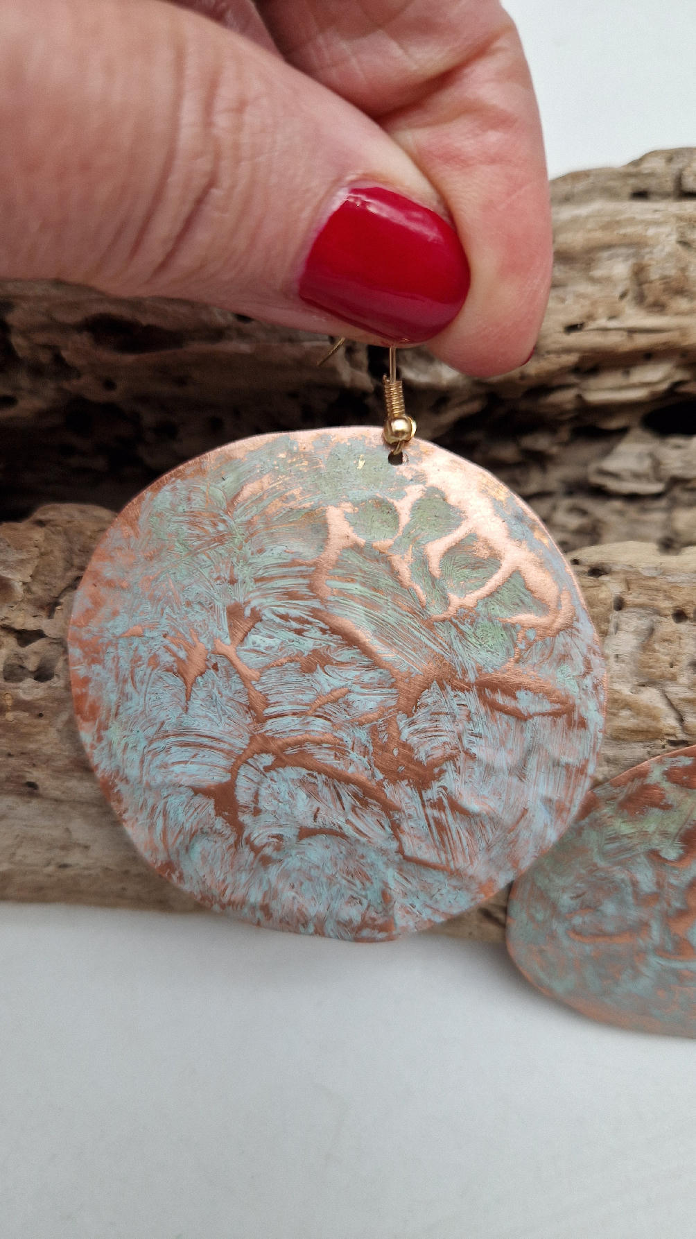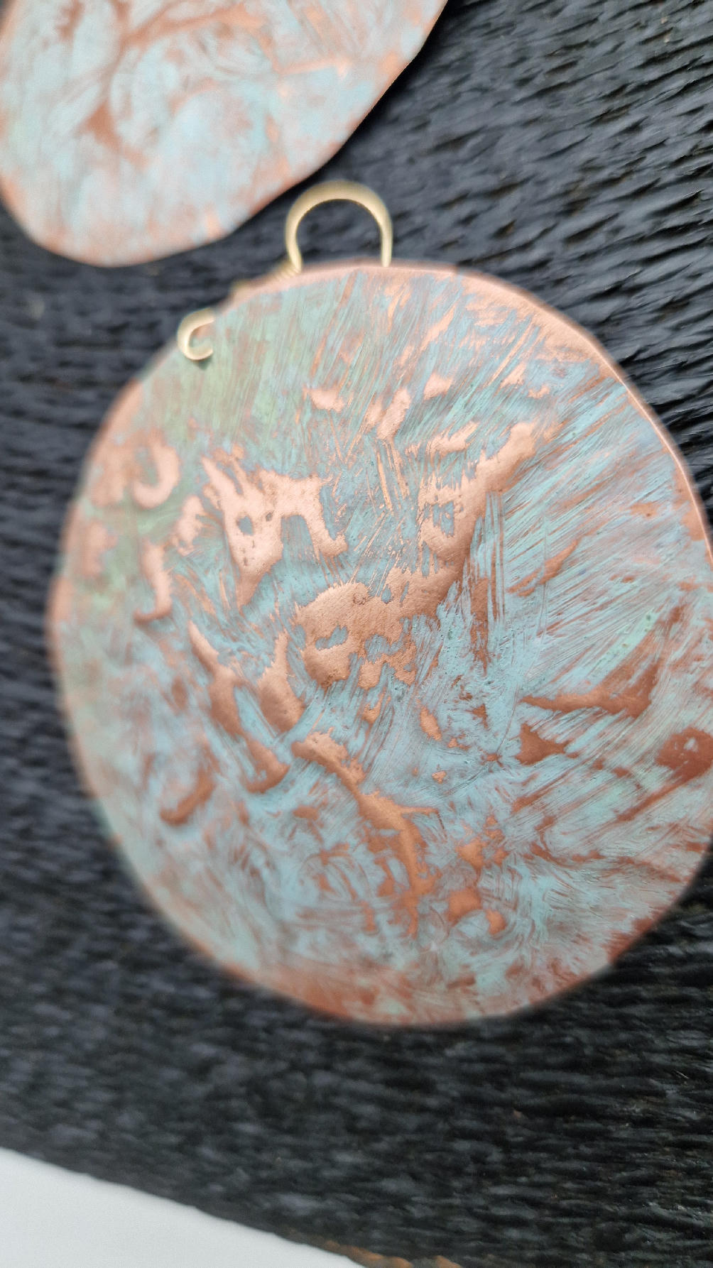 Duże i lekkie okrągłe kolczyki zrobione z miedzi, kute, postarzone, patynowane na biało z odrobiną mszystej , zieleni… z lekkimi prześwitami … przestrzenne, niebanalne, tajemnicze , takie wyjątkowe, ale do wszystkiego, cudne!