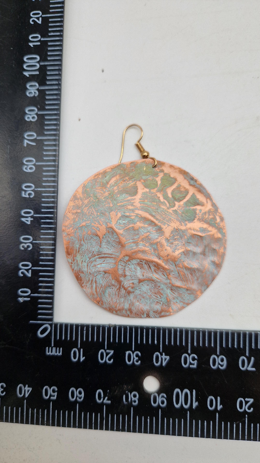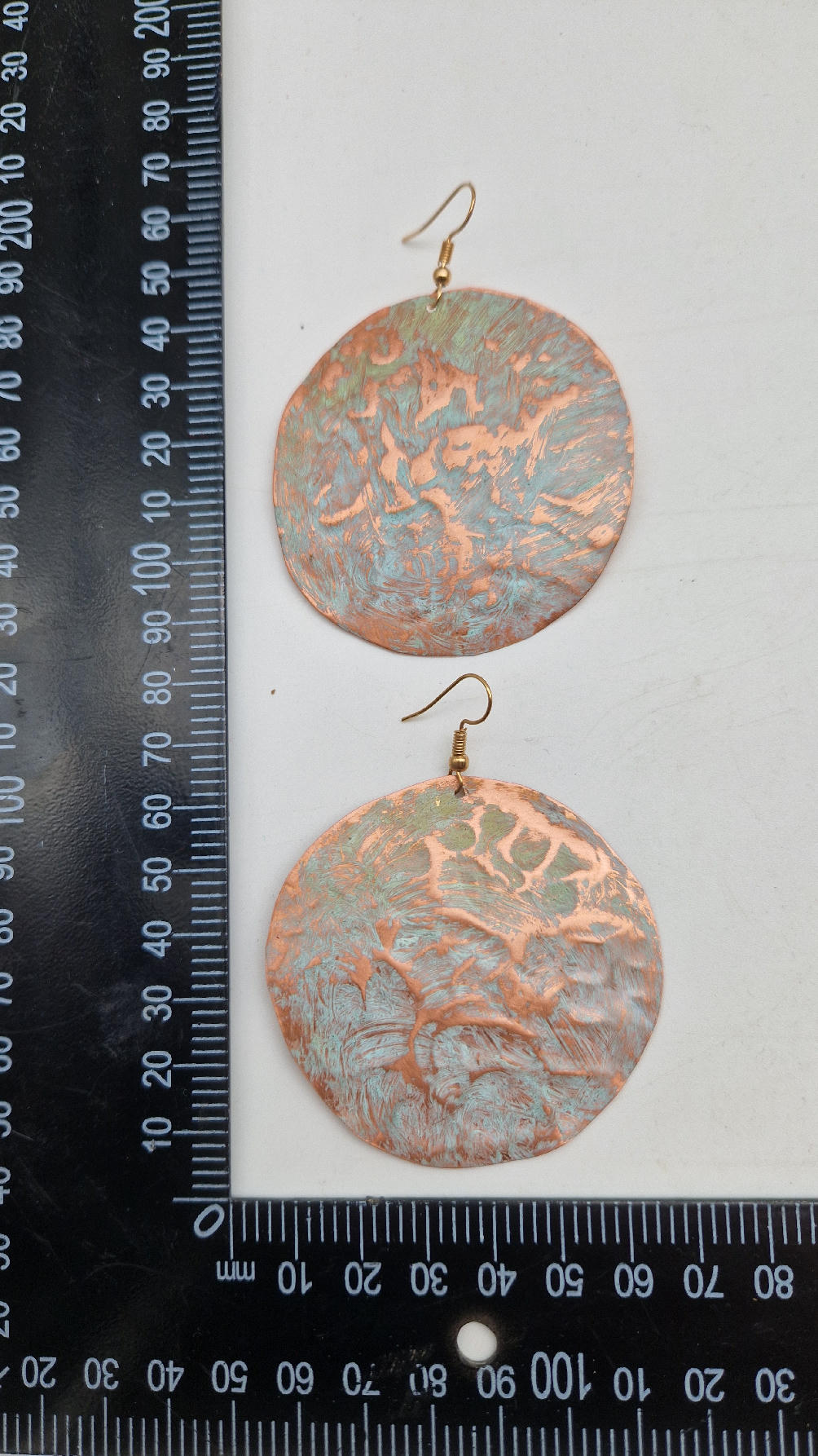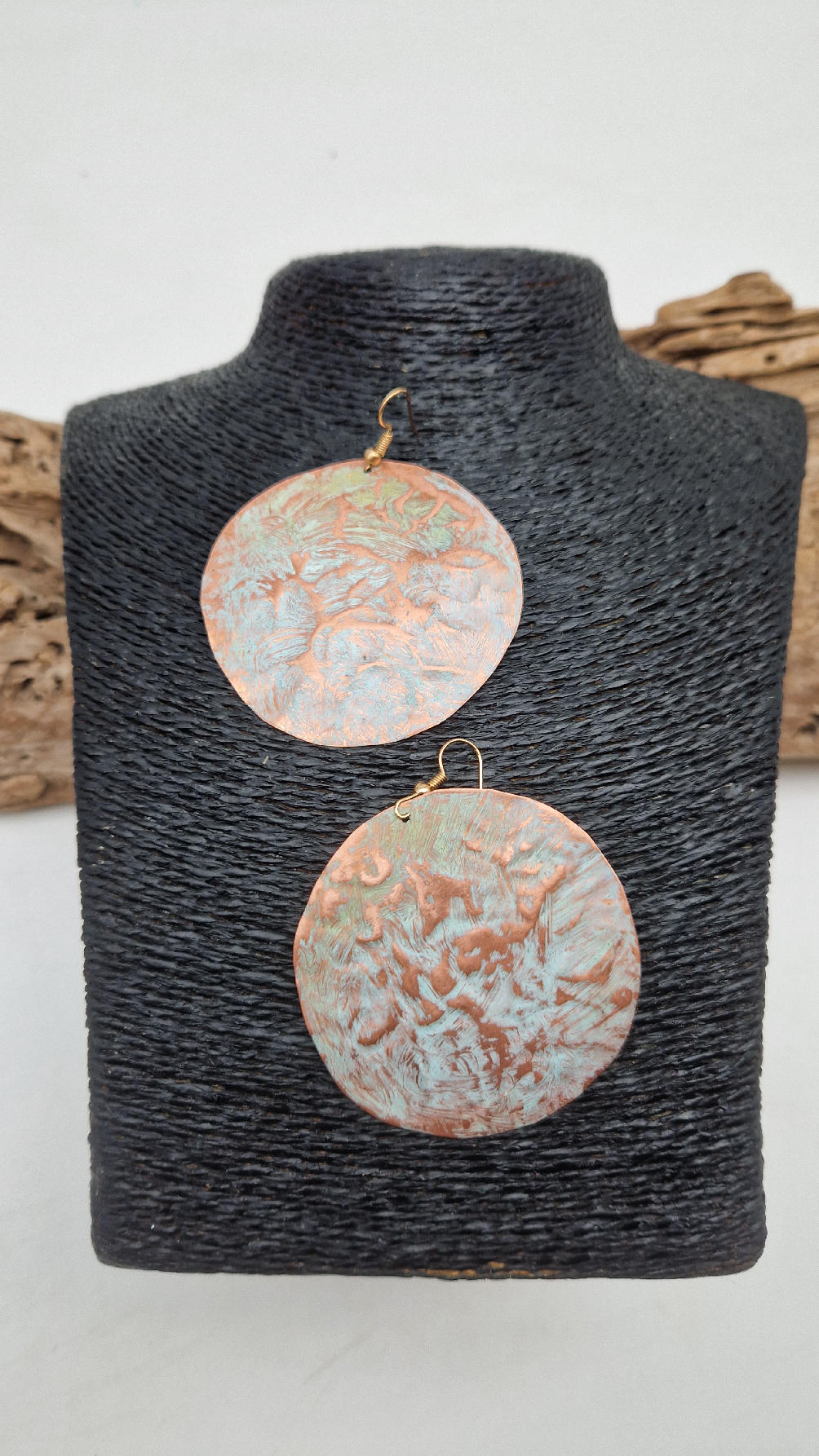 Duże i lekkie okrągłe kolczyki zrobione z miedzi, kute, postarzone, patynowane na biało z odrobiną mszystej , zieleni… z lekkimi prześwitami … przestrzenne, niebanalne, tajemnicze , takie wyjątkowe, ale do wszystkiego, cudne!