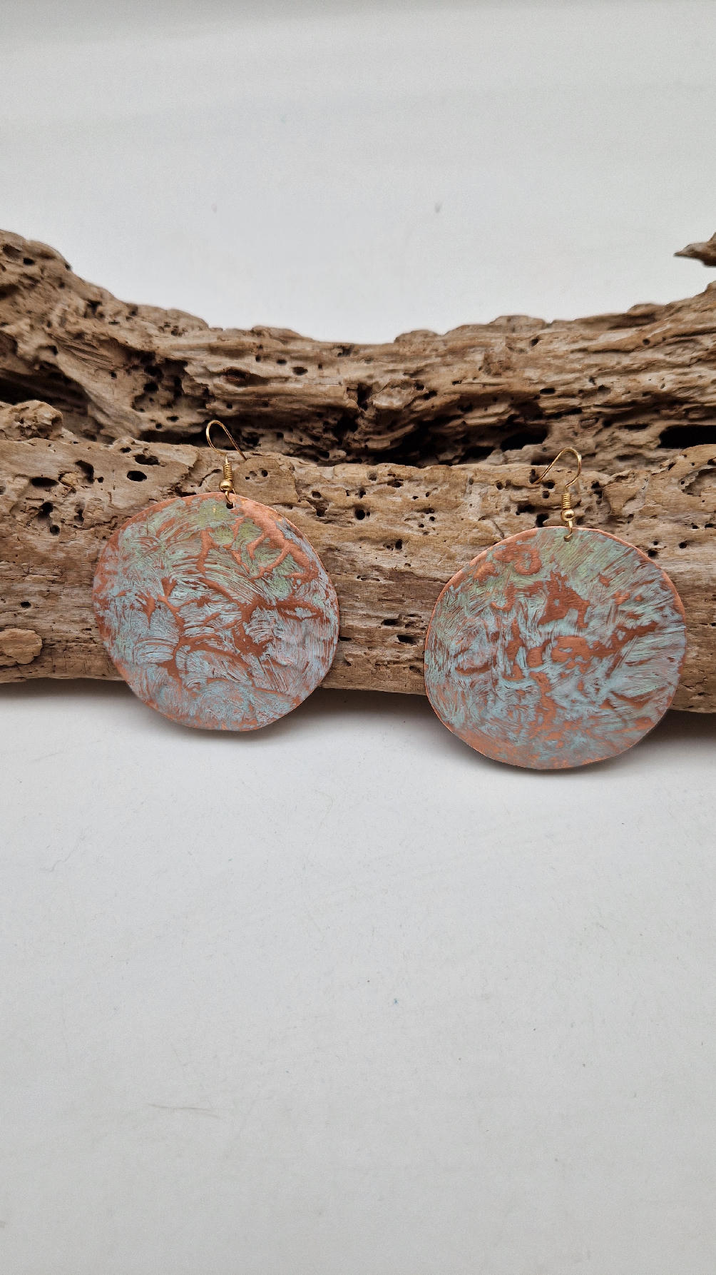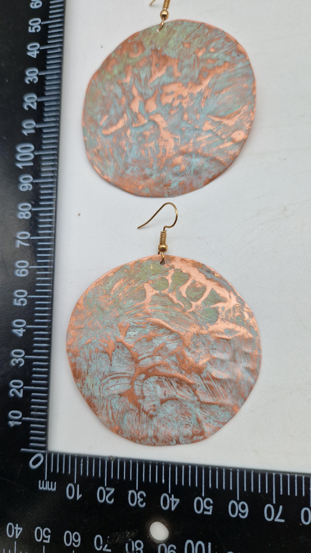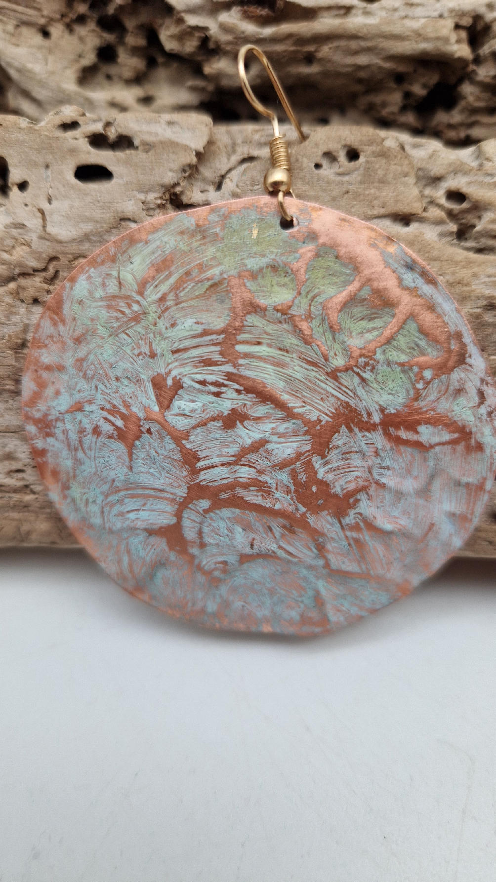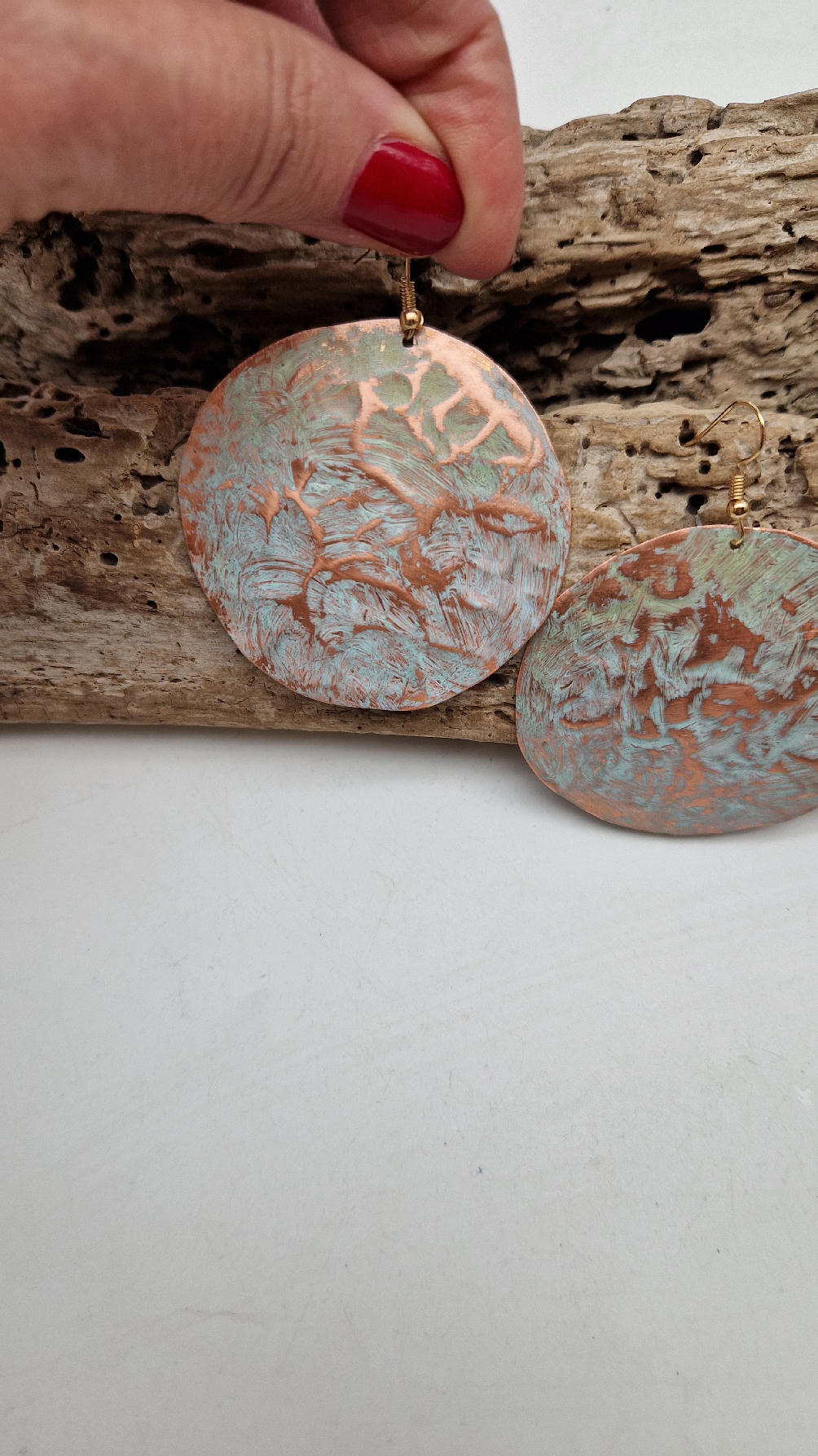 Duże i lekkie okrągłe kolczyki zrobione z miedzi, kute, postarzone, patynowane na biało z odrobiną mszystej , zieleni… z lekkimi prześwitami … przestrzenne, niebanalne, tajemnicze , takie wyjątkowe, ale do wszystkiego, cudne!