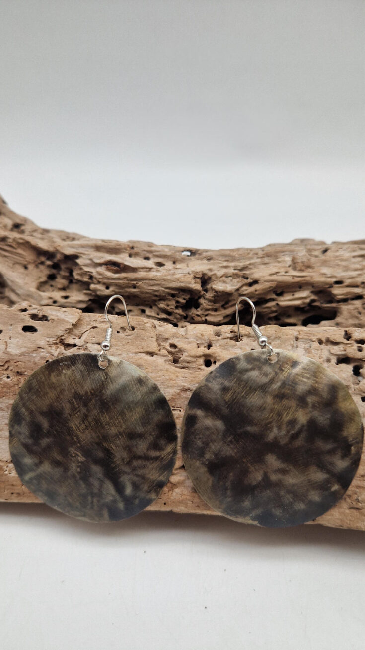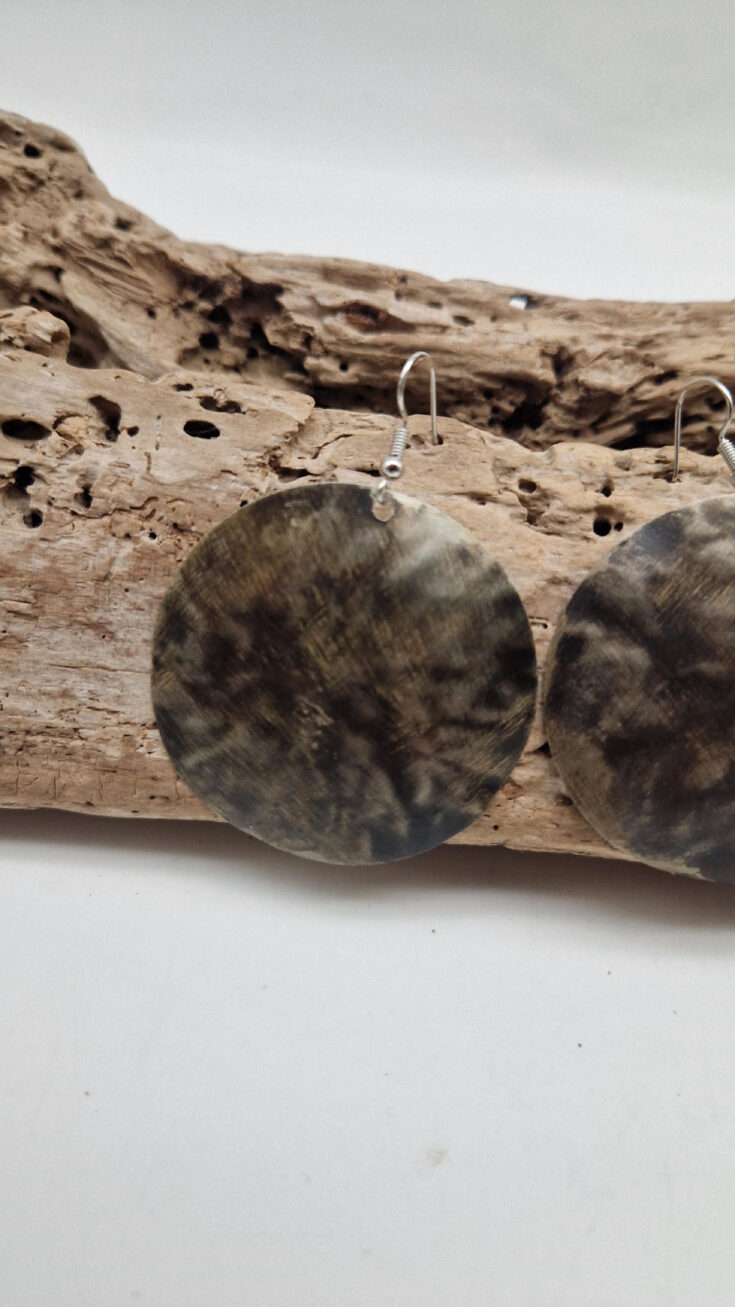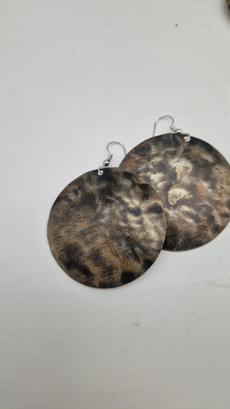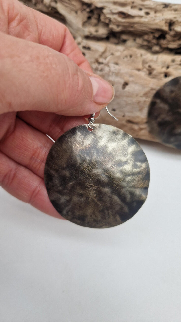 Piękne , uniwersalne kolczyki wykonane z alpaki, kute i patynowane. Czarne, ciut, ciut złote…. niebanalne, duże ale bardzo lekkie. Kolczyki mają średnicę 5,5 cm