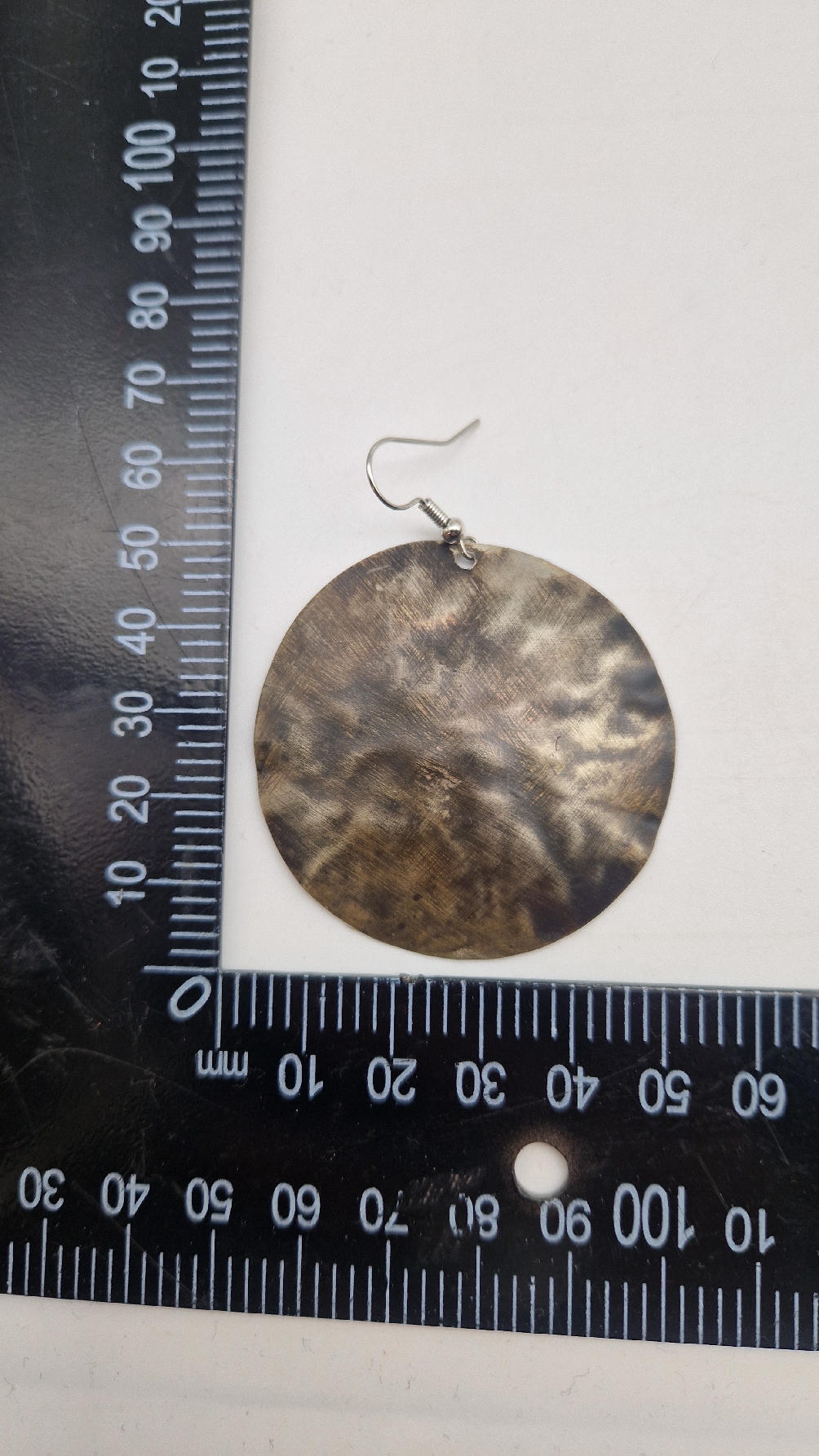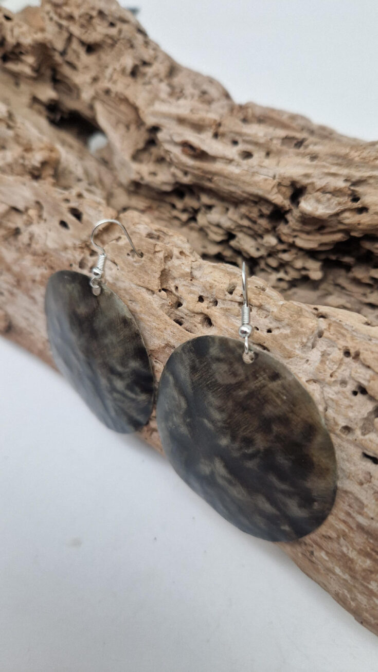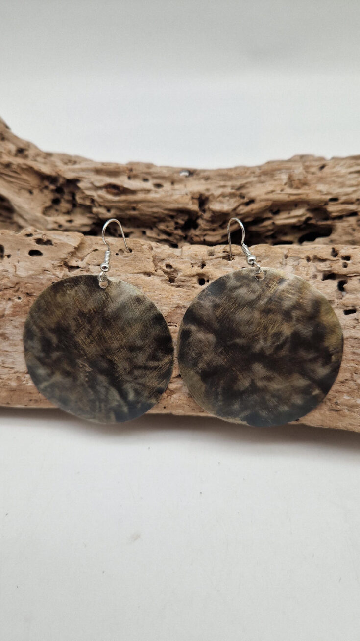 Piękne , uniwersalne kolczyki wykonane z alpaki, kute i patynowane. Czarne, ciut, ciut złote…. niebanalne, duże ale bardzo lekkie. Kolczyki mają średnicę 5,5 cm