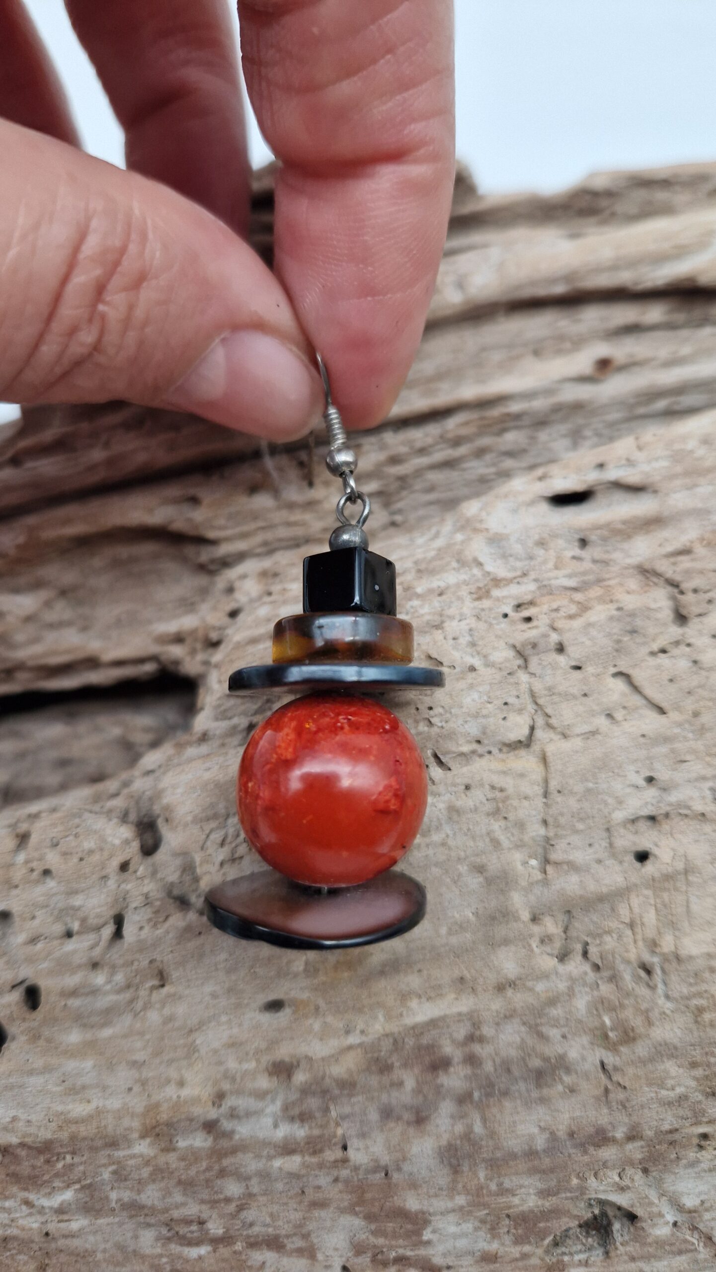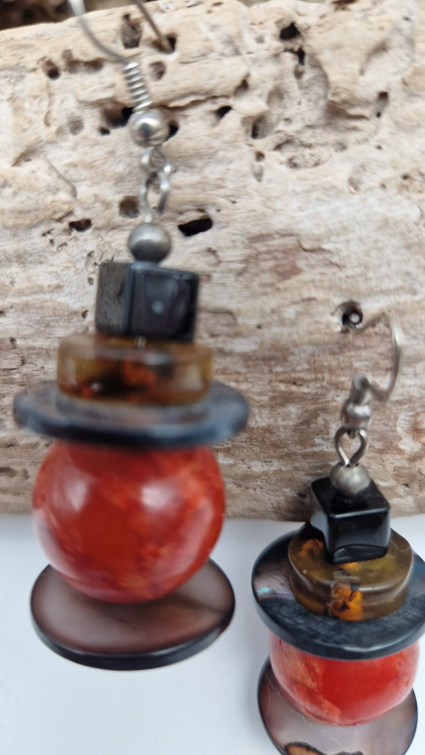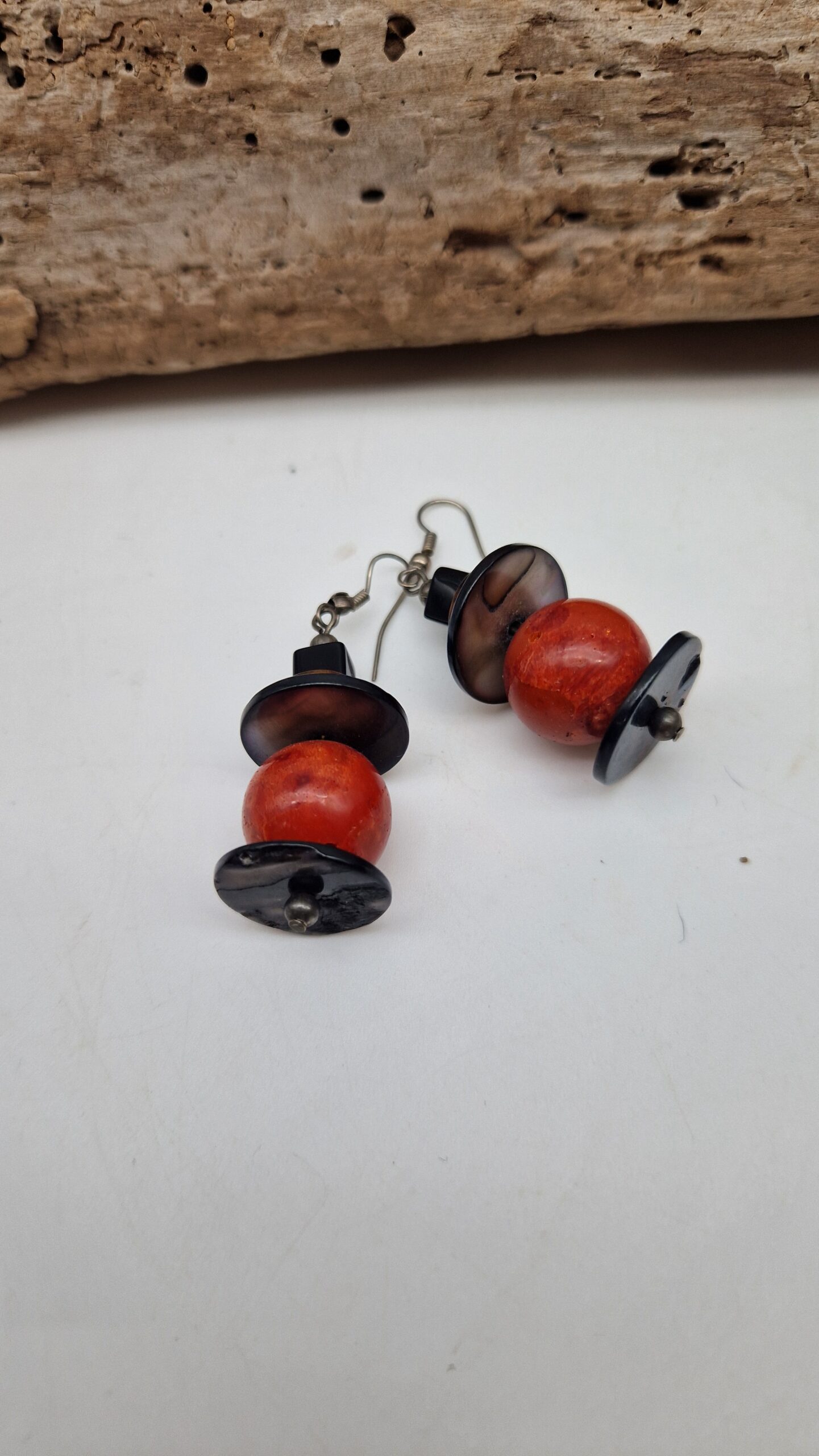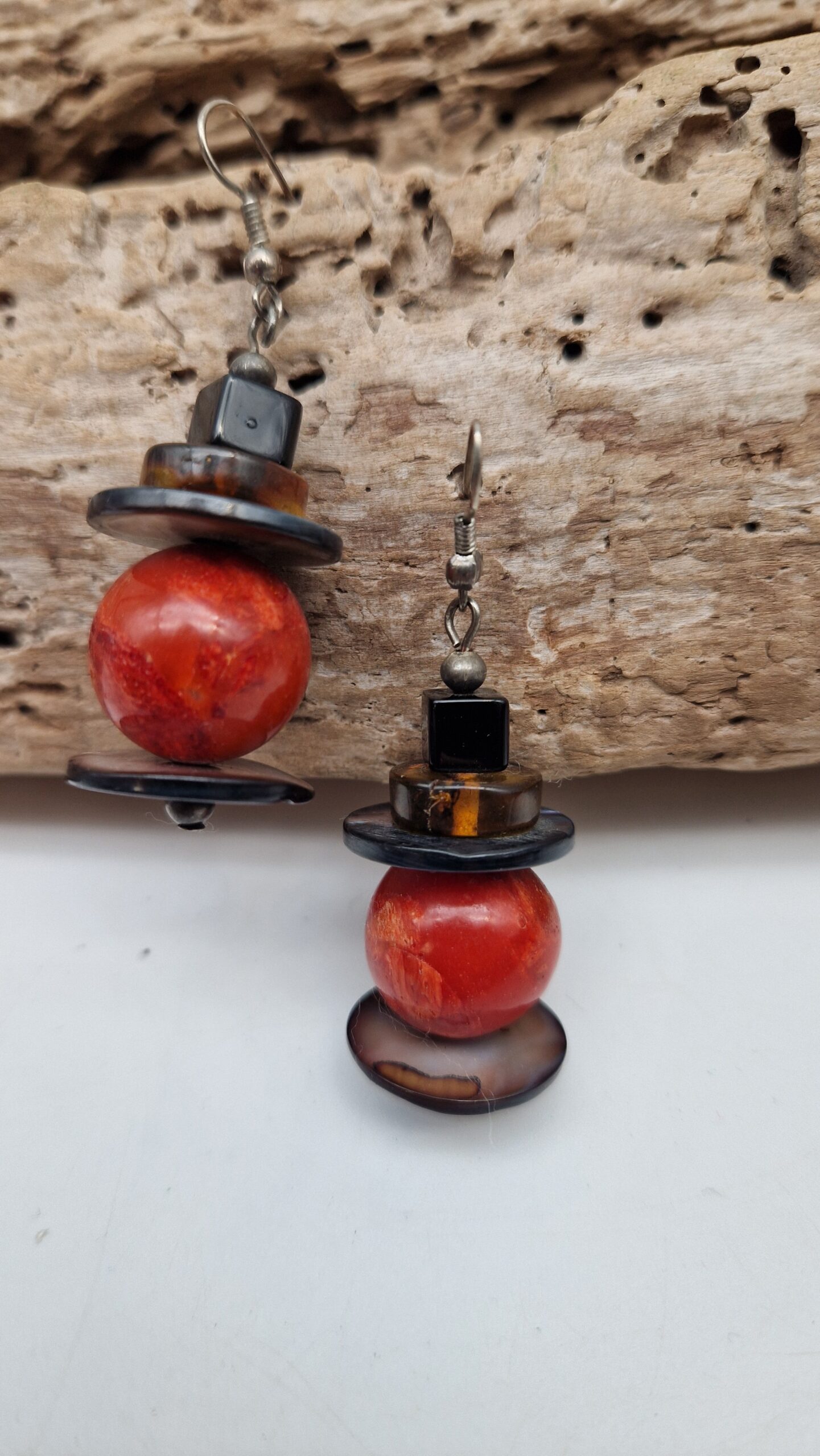 Niewielkie kolczyki wykonane z korala, bursztynu, muszli i lawy. Śliczne, oryginalne, niebanalne, mogą być pięknym uzupełnieniem bransolety z korala…