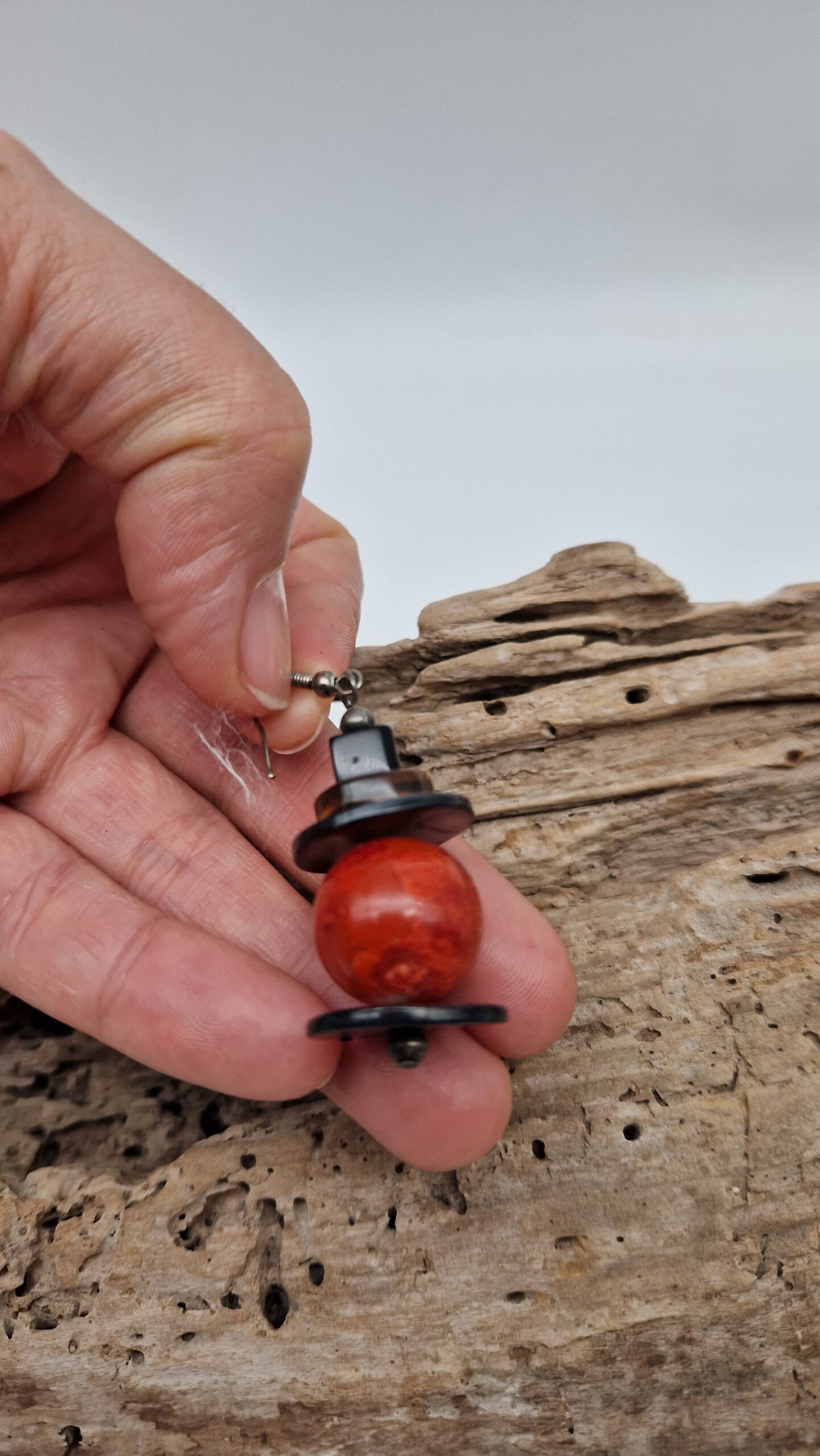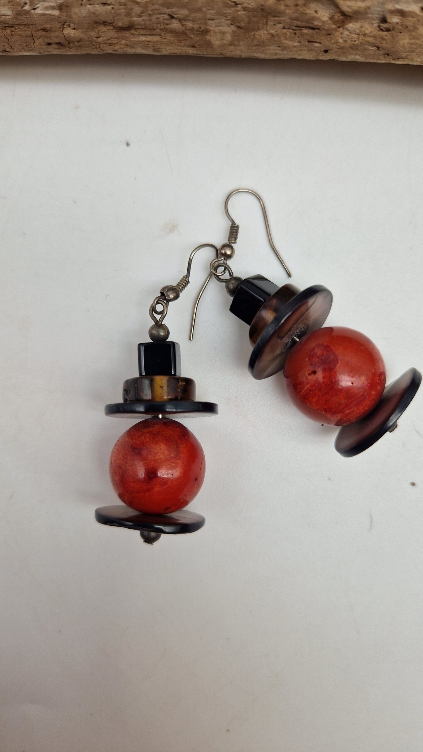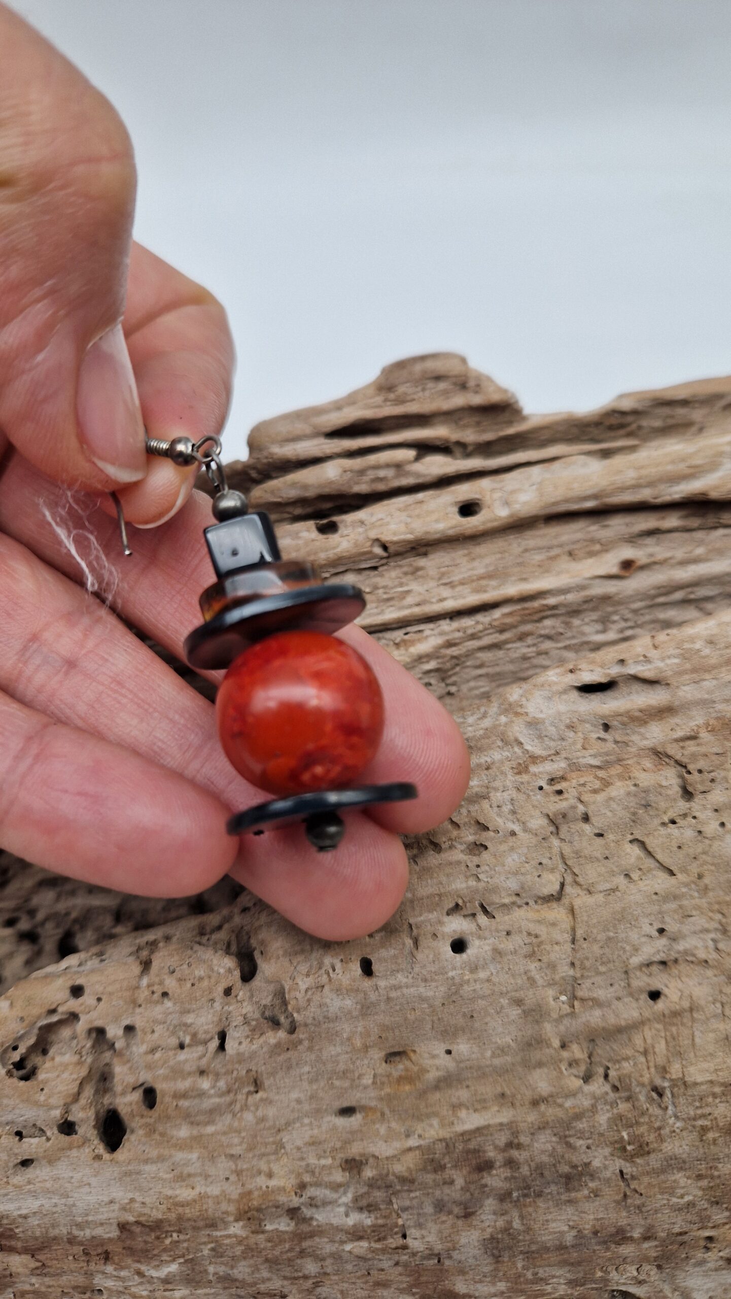 Niewielkie kolczyki wykonane z korala, bursztynu, muszli i lawy. Śliczne, oryginalne, niebanalne, mogą być pięknym uzupełnieniem bransolety z korala…