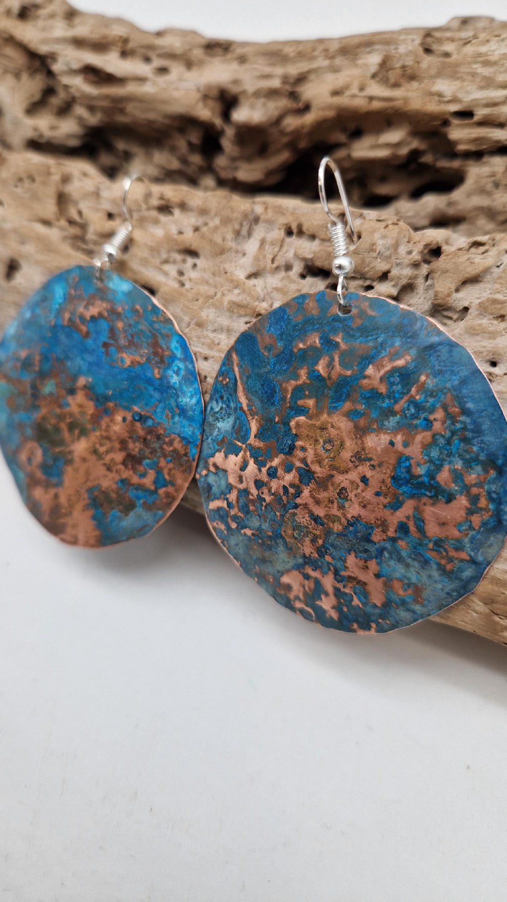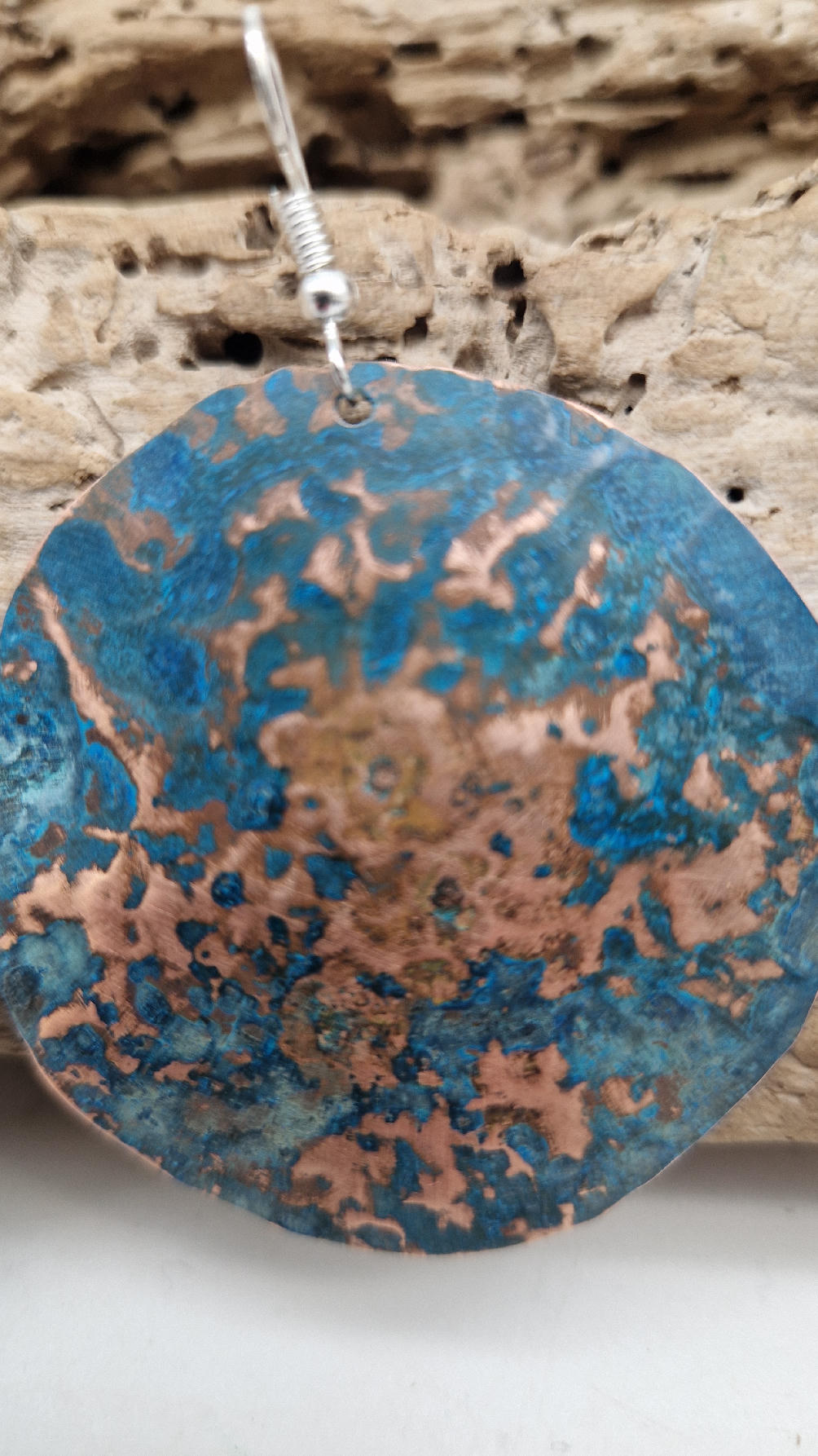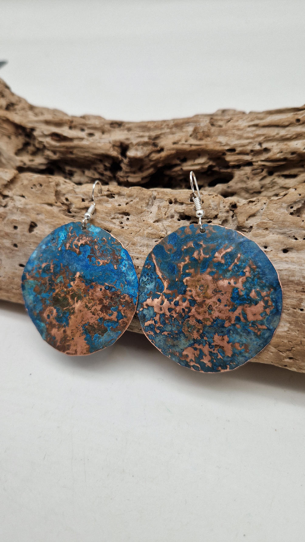 Wyglądają jak Ziemia widziana z kosmosu…Duże i lekkie kolczyki zrobione z miedzi,kute, postarzone, patynowane na niebiesko, a może to kobalt z ociupiną zieleni… z lekkimi prześwitami … przestrzenne, niebanalne, tajemnicze , takie wyjątkowe, ale do wszystkiego, cudne!
