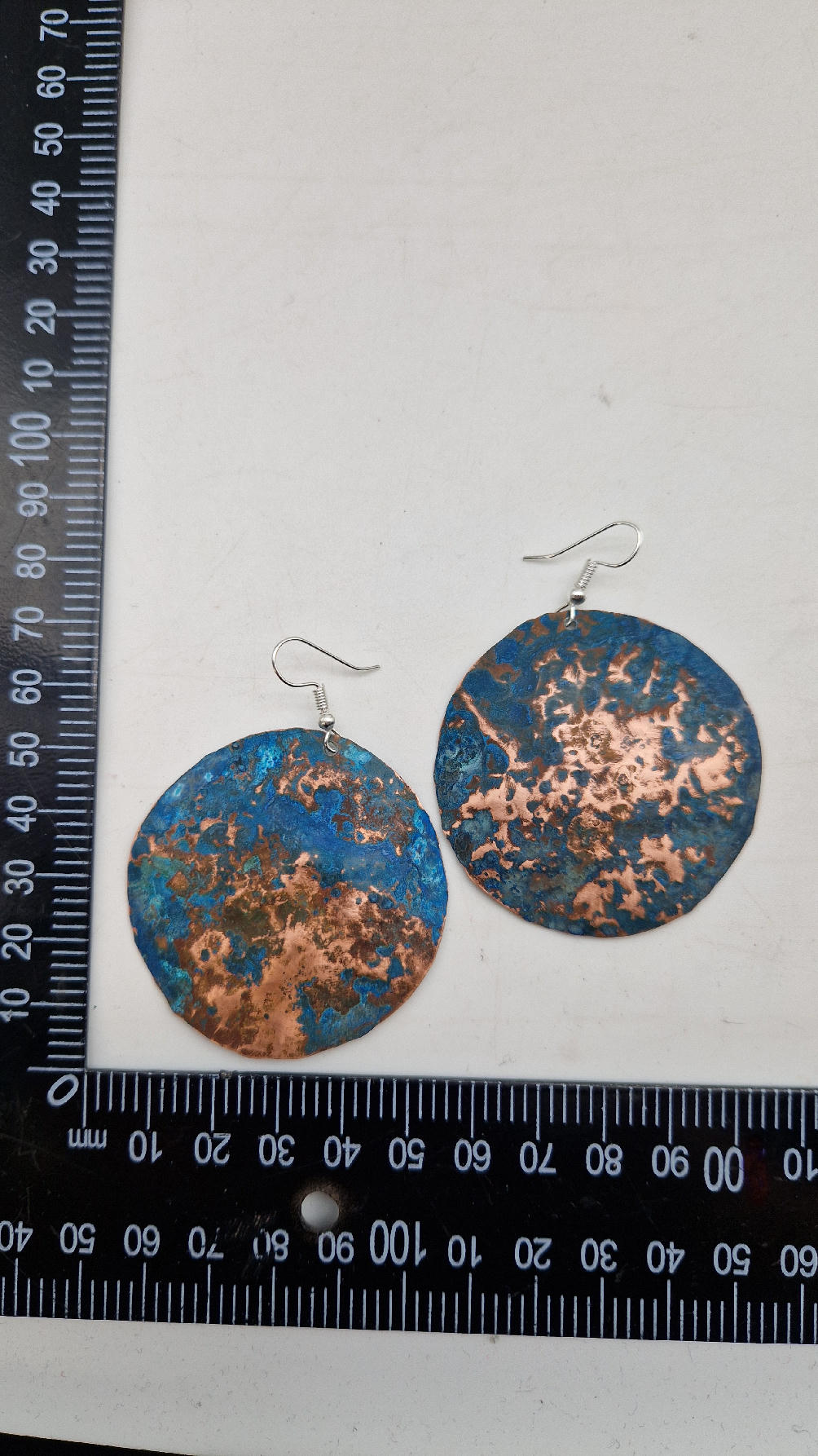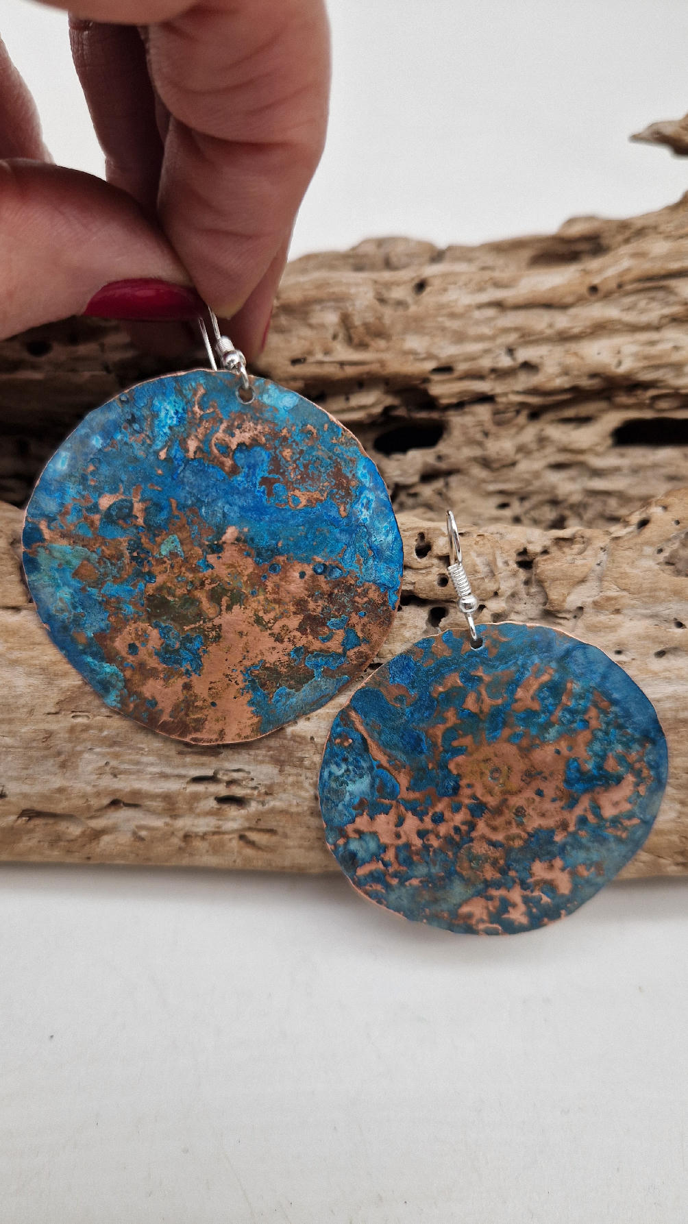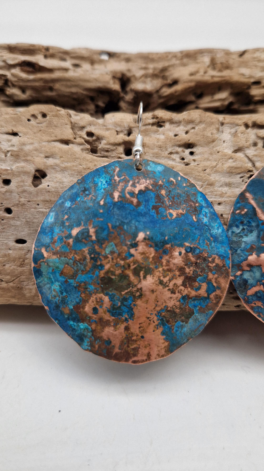 Wyglądają jak Ziemia widziana z kosmosu…Duże i lekkie kolczyki zrobione z miedzi,kute, postarzone, patynowane na niebiesko, a może to kobalt z ociupiną zieleni… z lekkimi prześwitami … przestrzenne, niebanalne, tajemnicze , takie wyjątkowe, ale do wszystkiego, cudne!