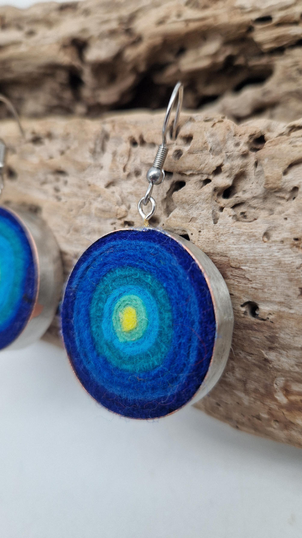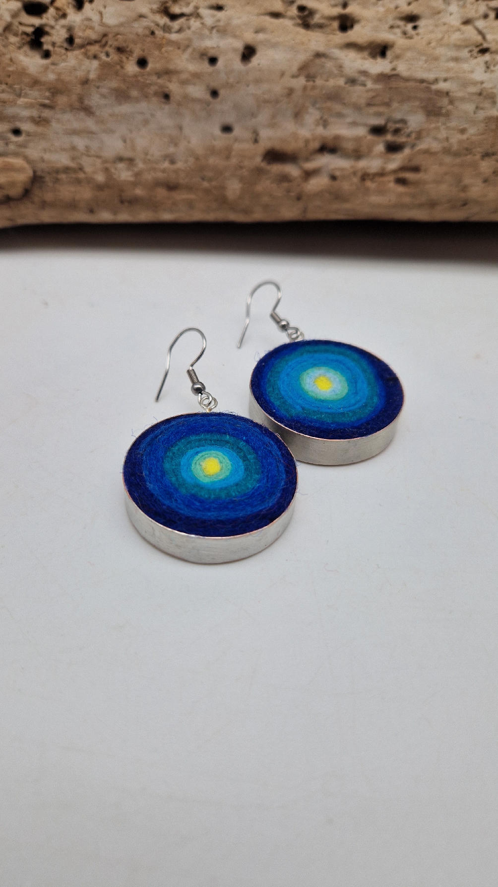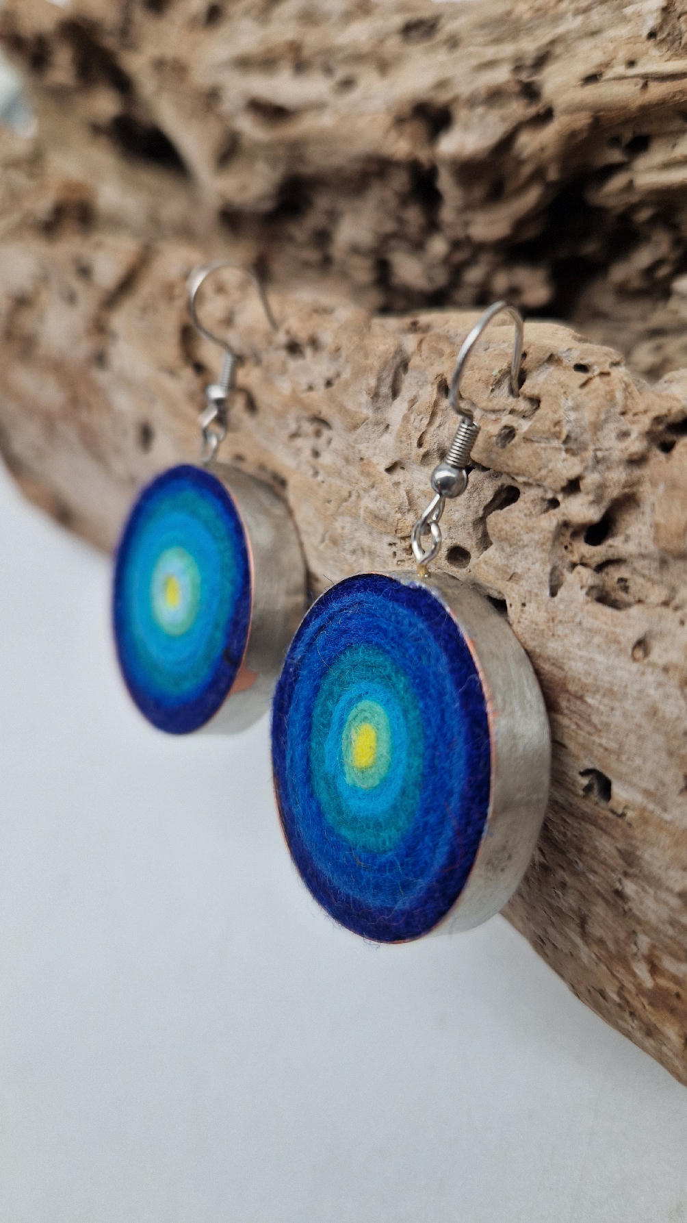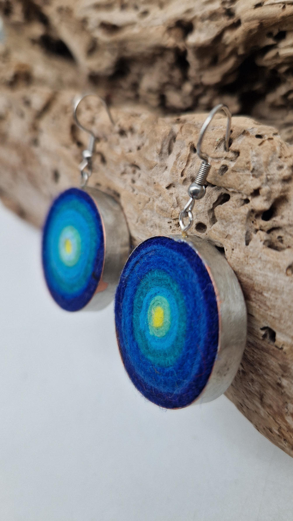 Niewielkie kolczyki w odcieniach blue z jasnym jak słońce środkiem, zakręcone z filcu, osadzone w niewielkiej metalowej puszeczce…cudne, urocze, radosne…