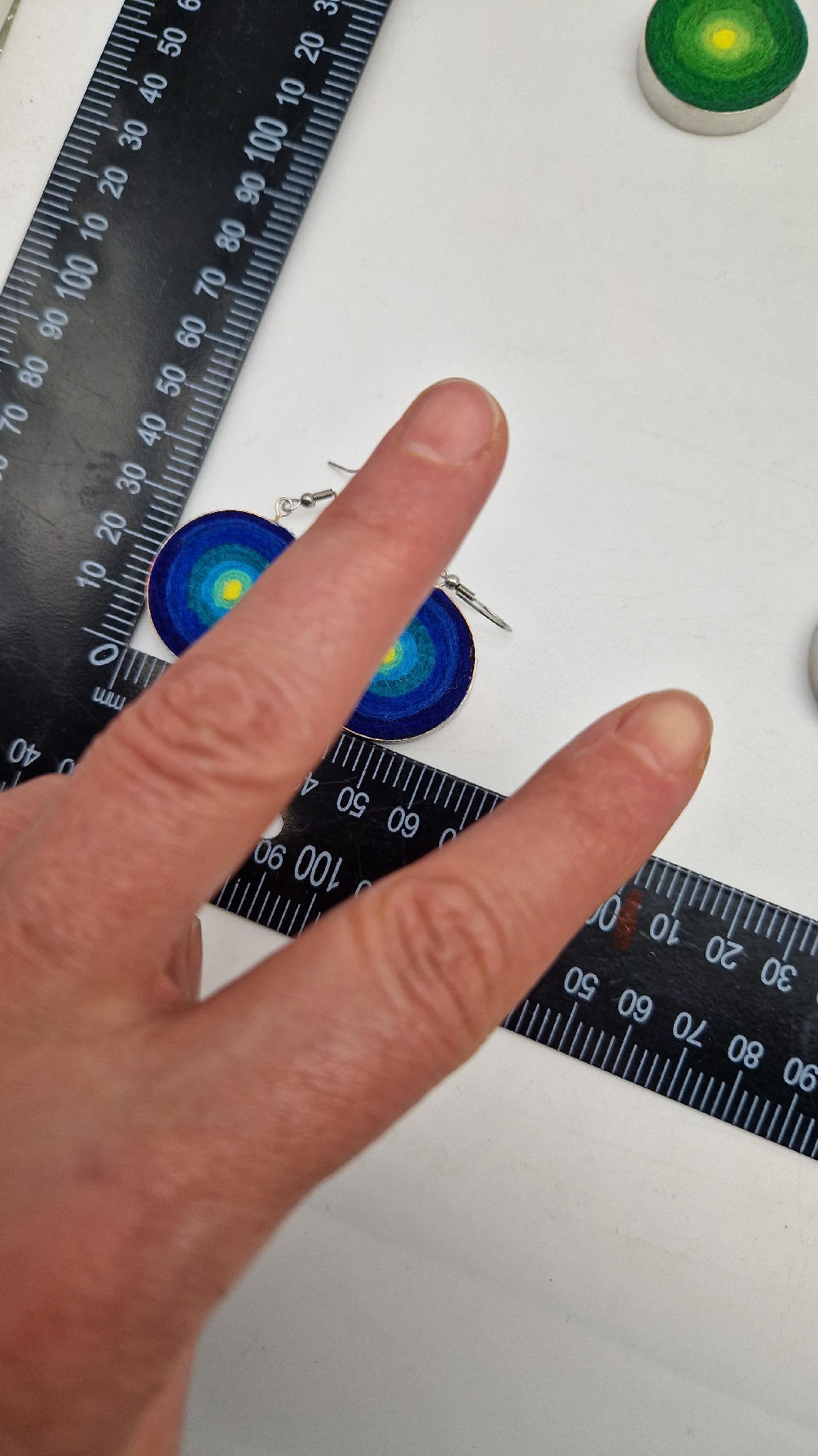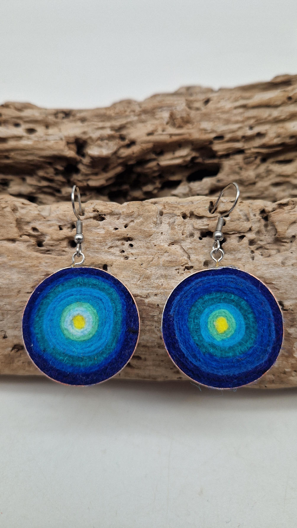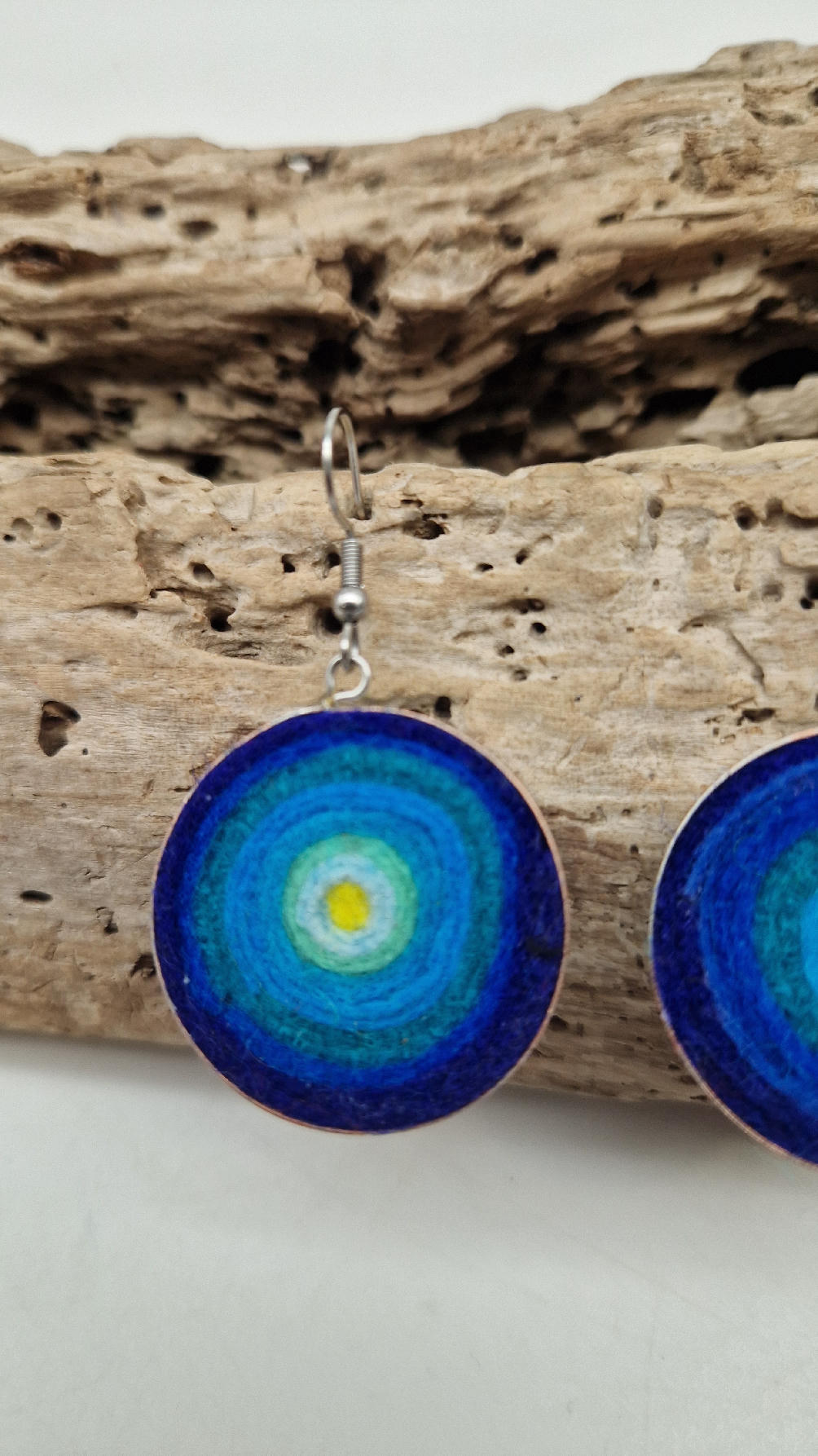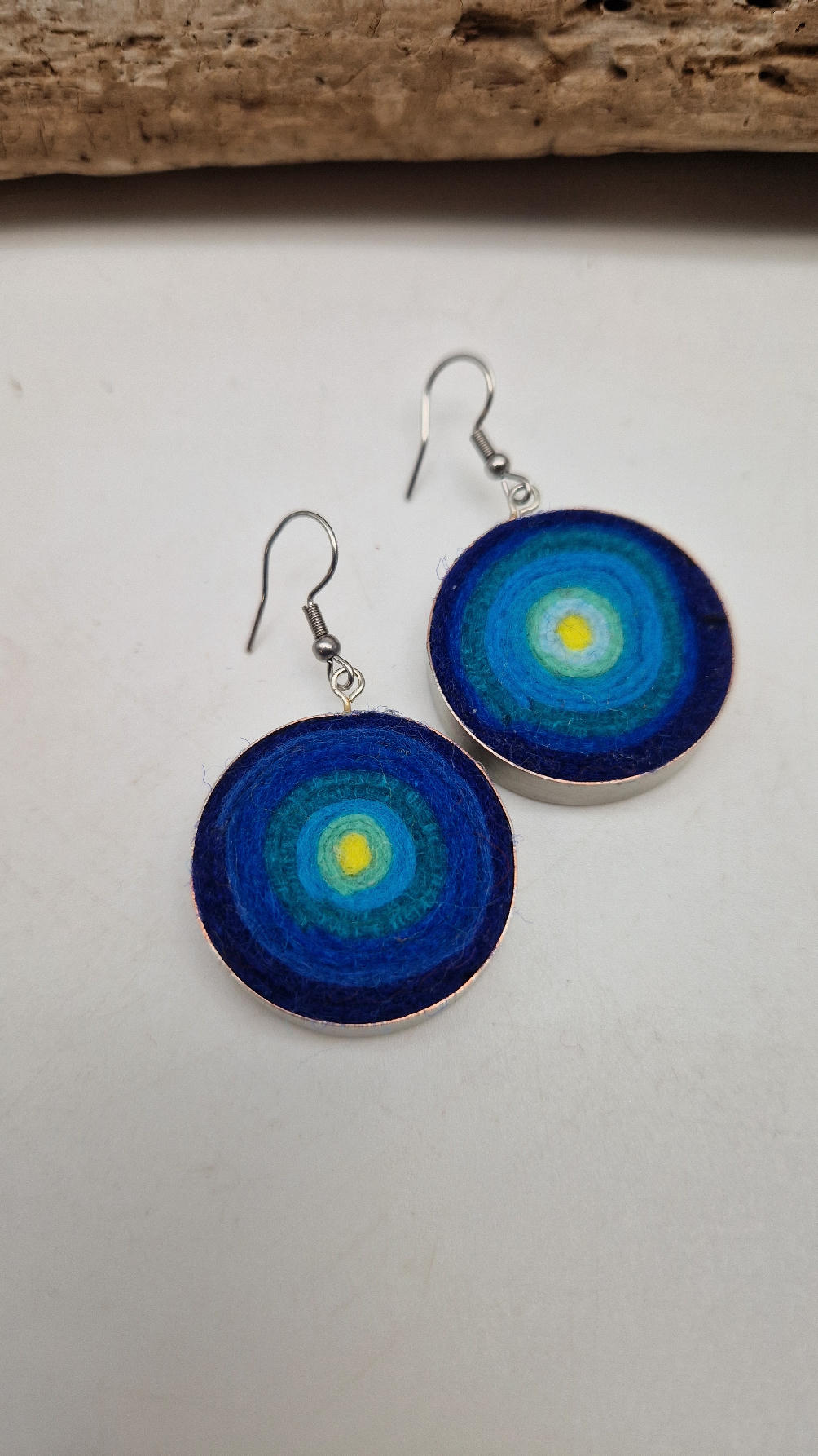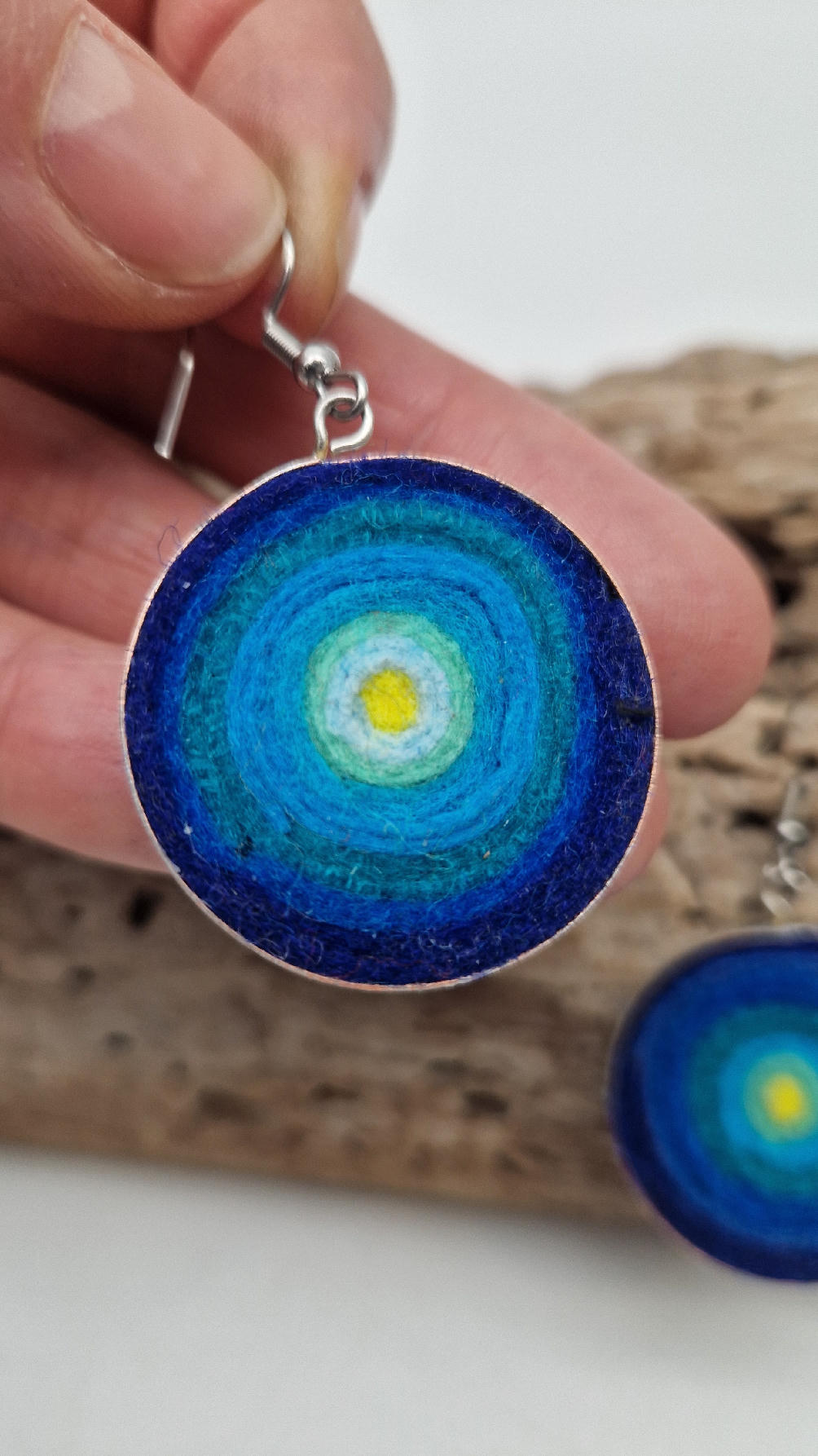 Niewielkie kolczyki w odcieniach blue z jasnym jak słońce środkiem, zakręcone z filcu, osadzone w niewielkiej metalowej puszeczce…cudne, urocze, radosne…