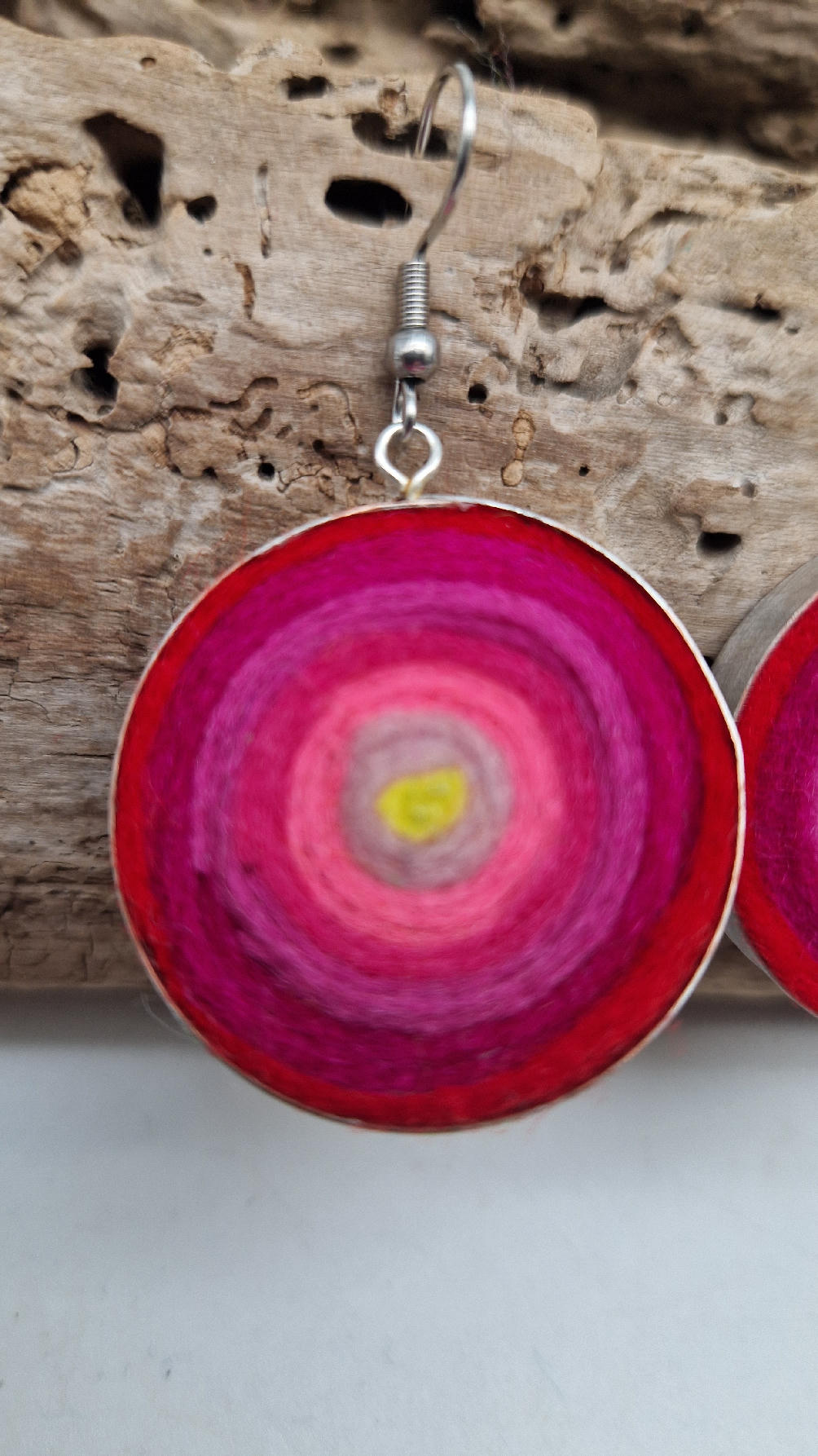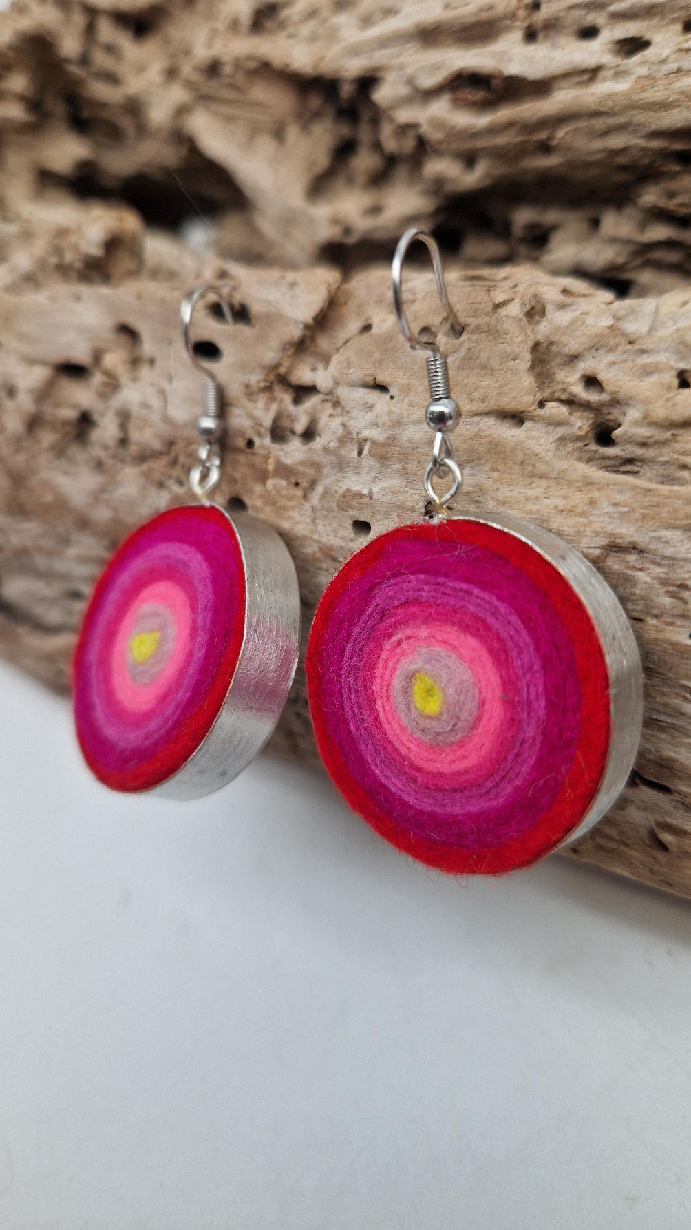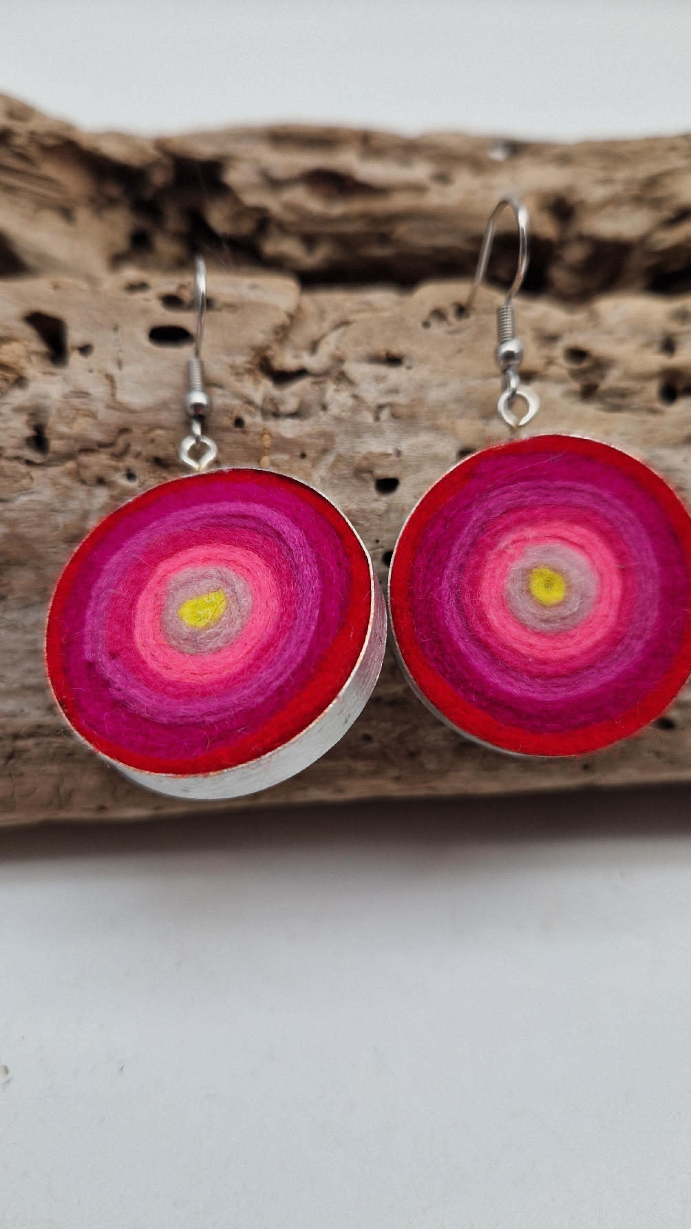 Niewielkie kolczyki w odcieniach madżenty z jasnym jak słońce środkiem, zakręcone z filcu, osadzone w niewielkiej metalowej puszeczce…cudne, urocze, radosne…