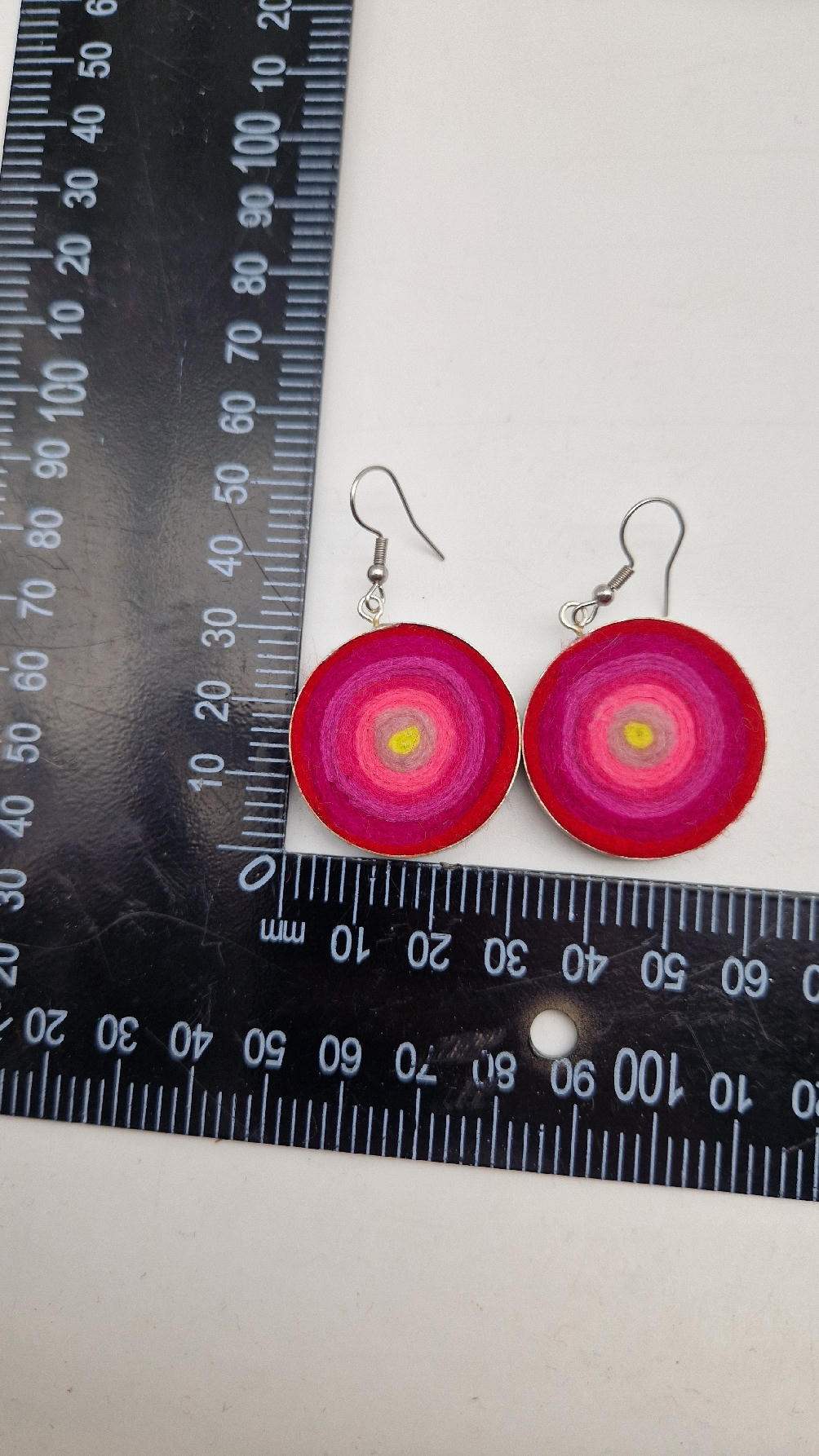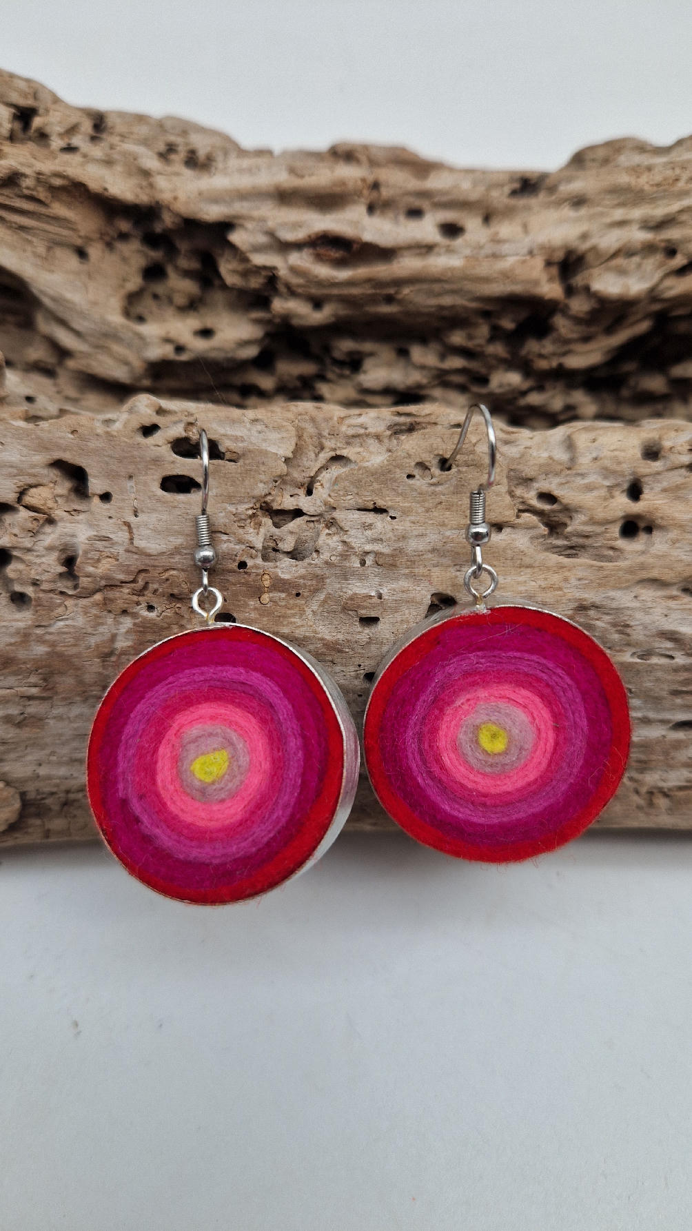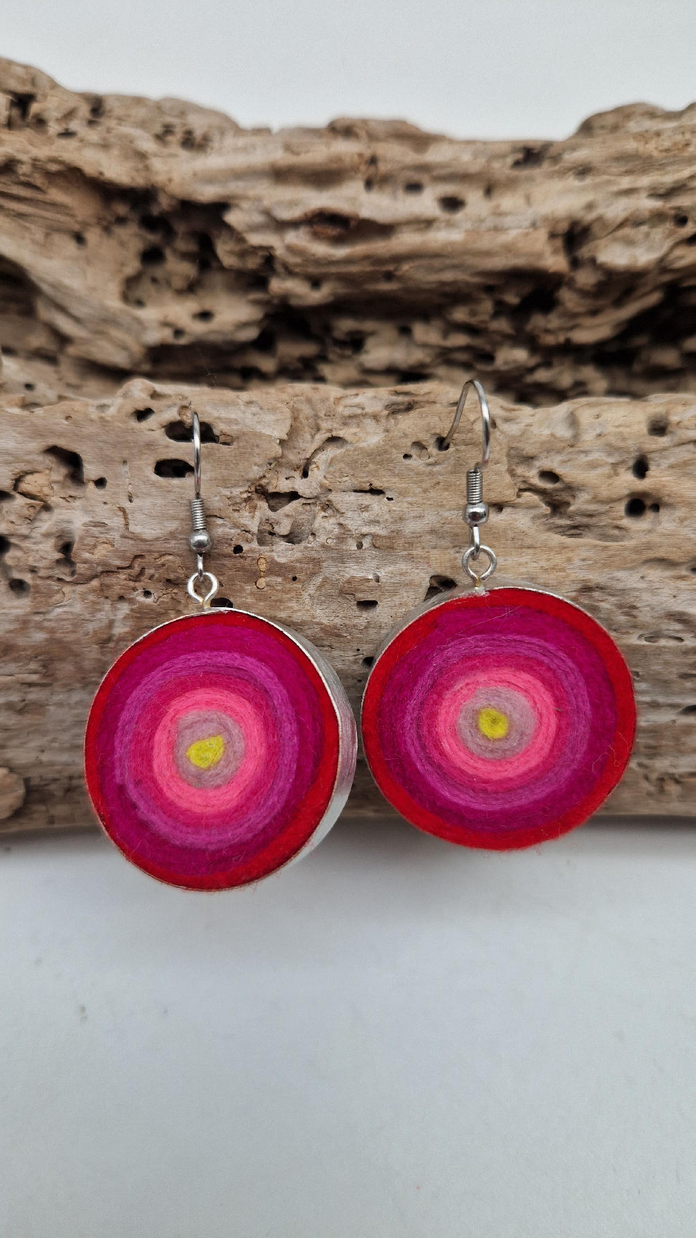Niewielkie kolczyki w odcieniach madżenty z jasnym jak słońce środkiem, zakręcone z filcu, osadzone w niewielkiej metalowej puszeczce…cudne, urocze, radosne…