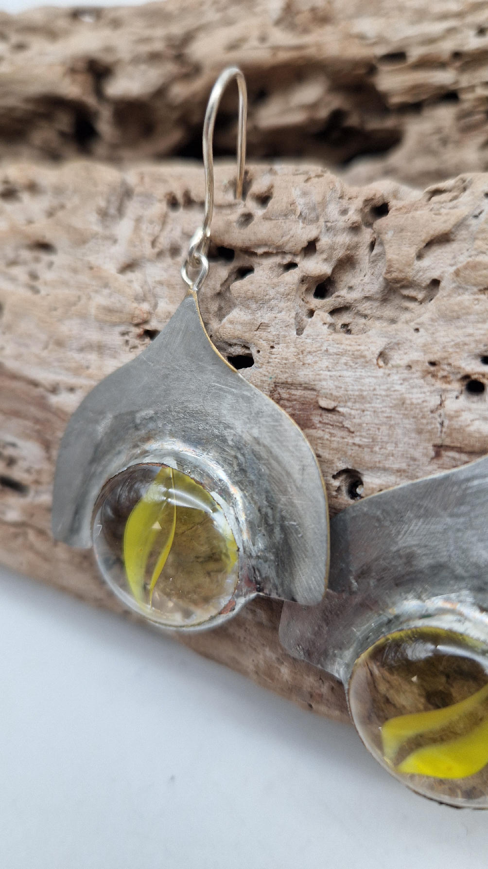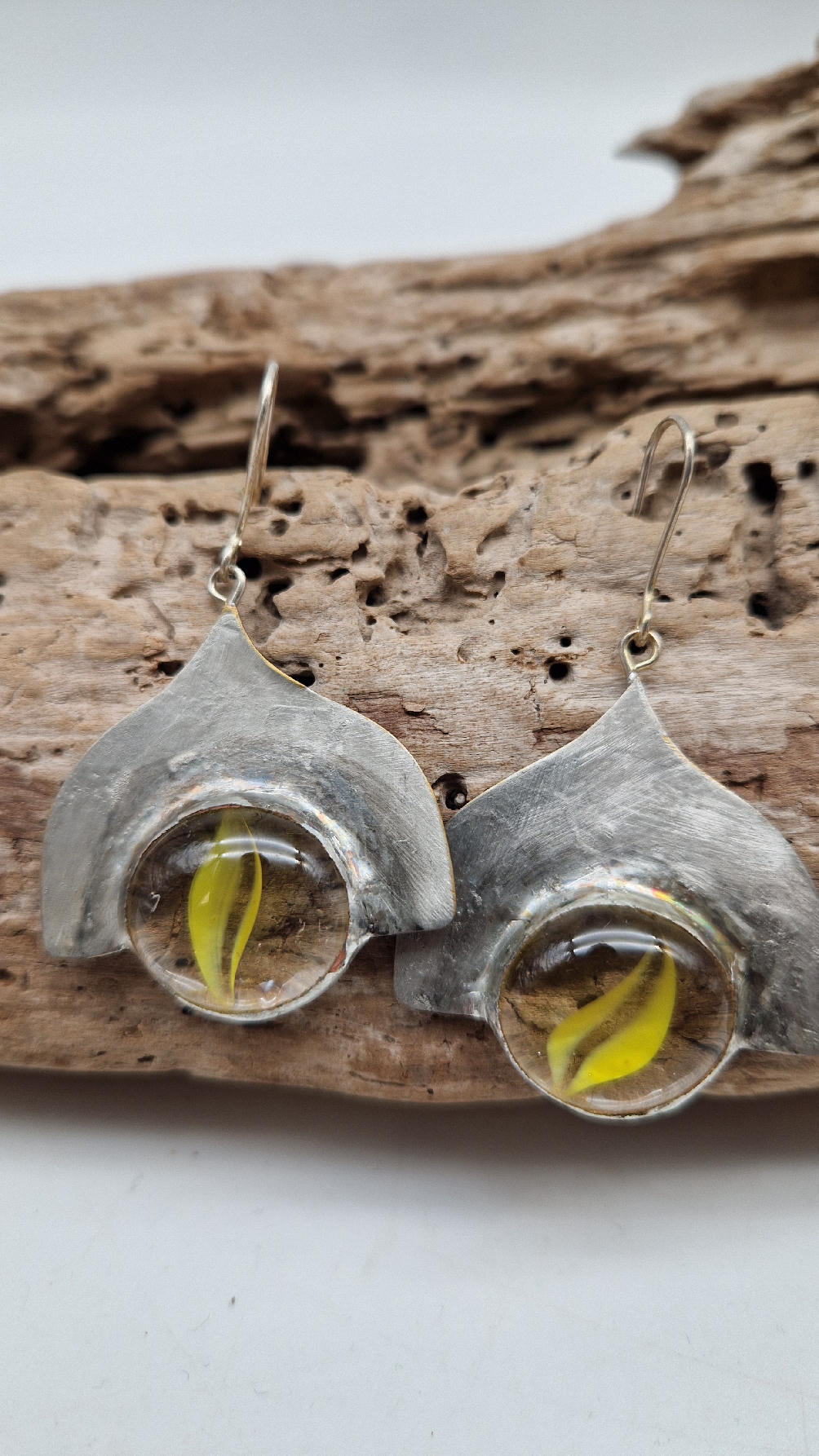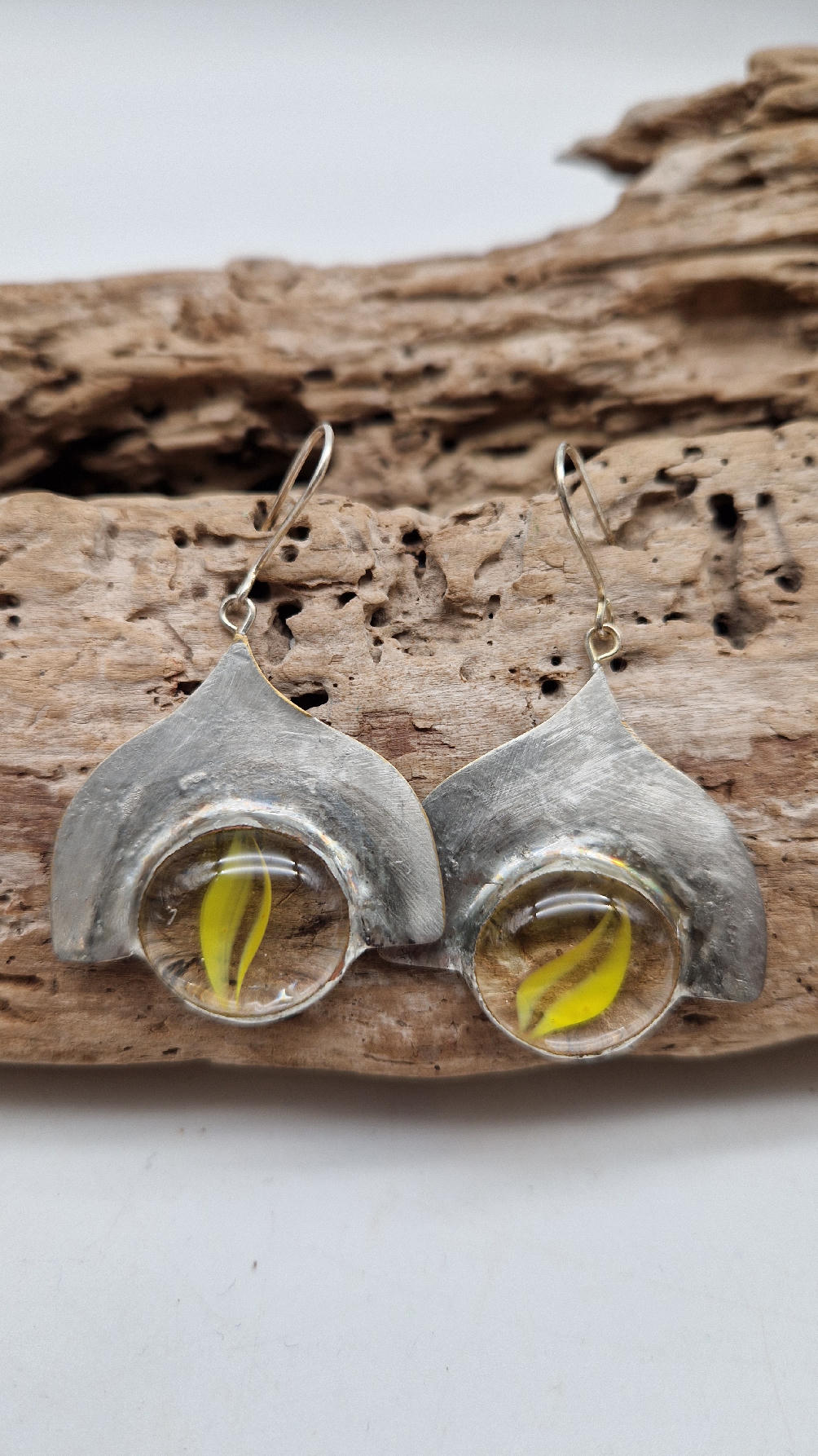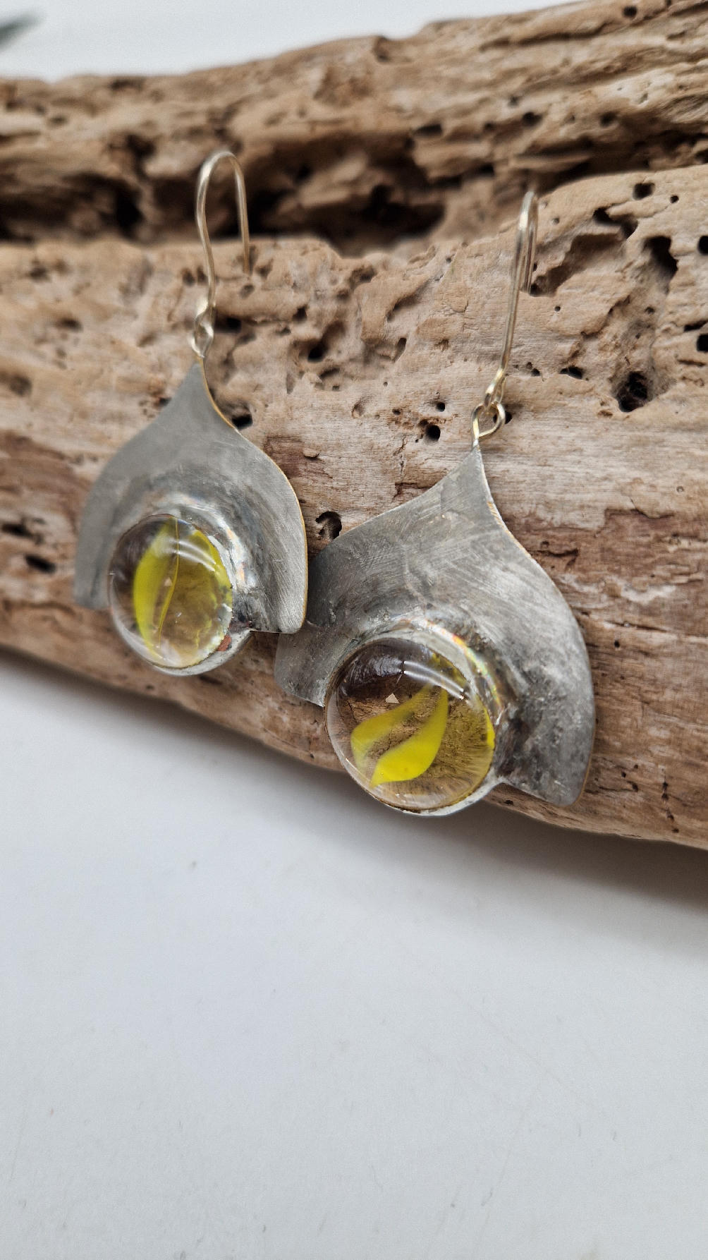 Cudne , niewielkie kolczyki zrobione z miedzi, srebrzone i patynowane z przezroczystym oczkiem ze szkła weneckiego z promieniem słońca wewnątrz…