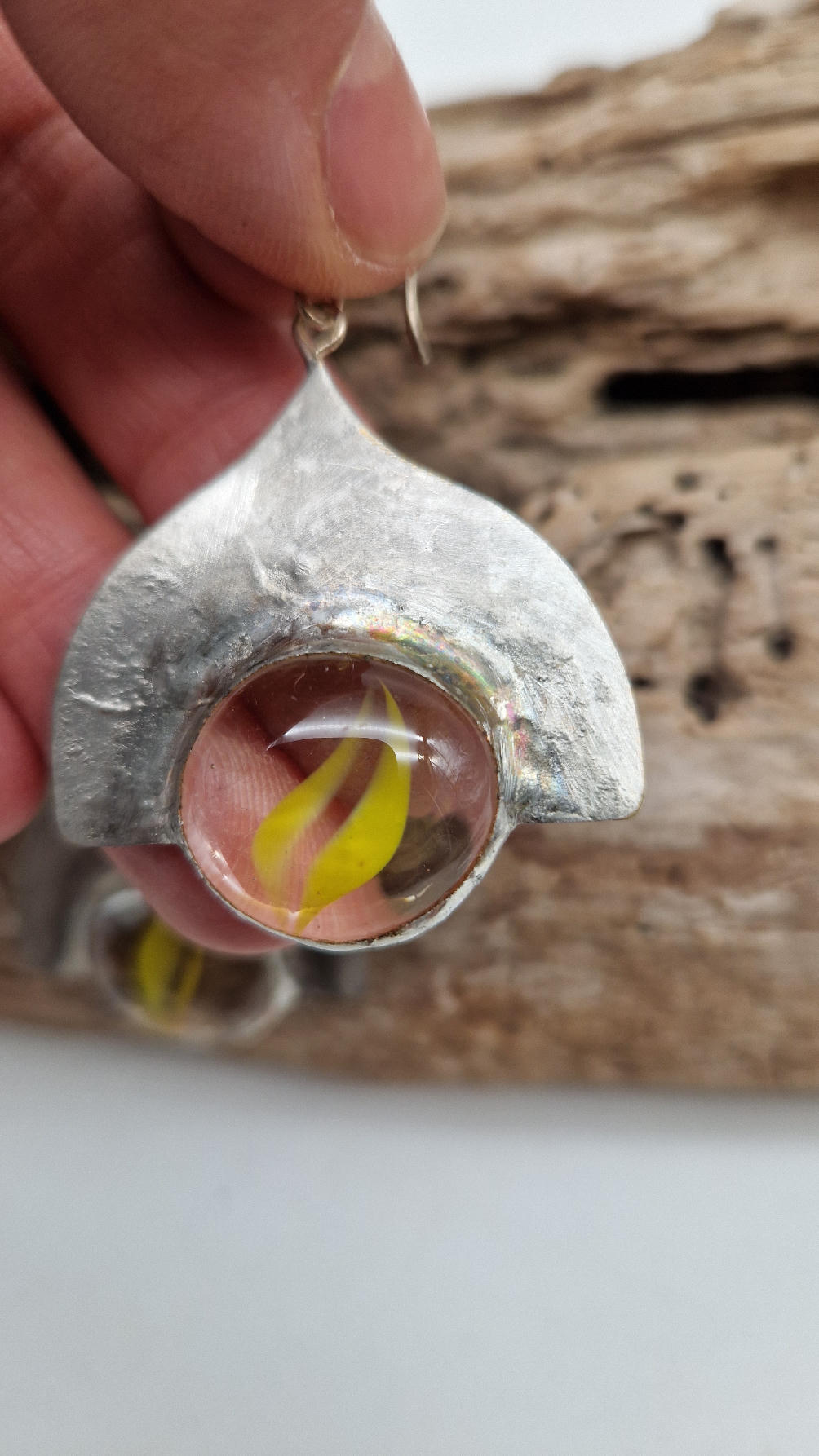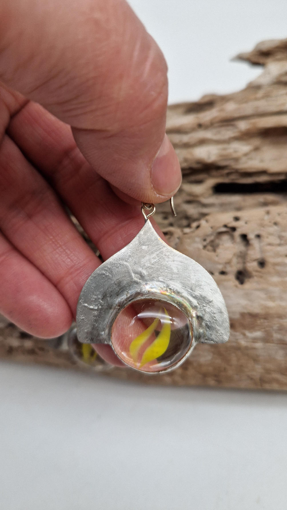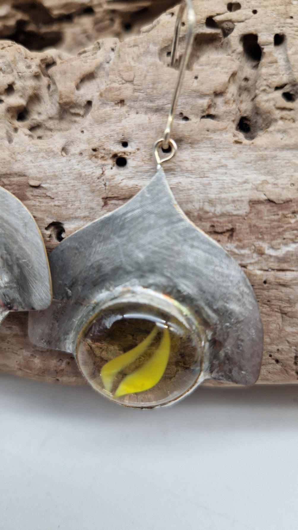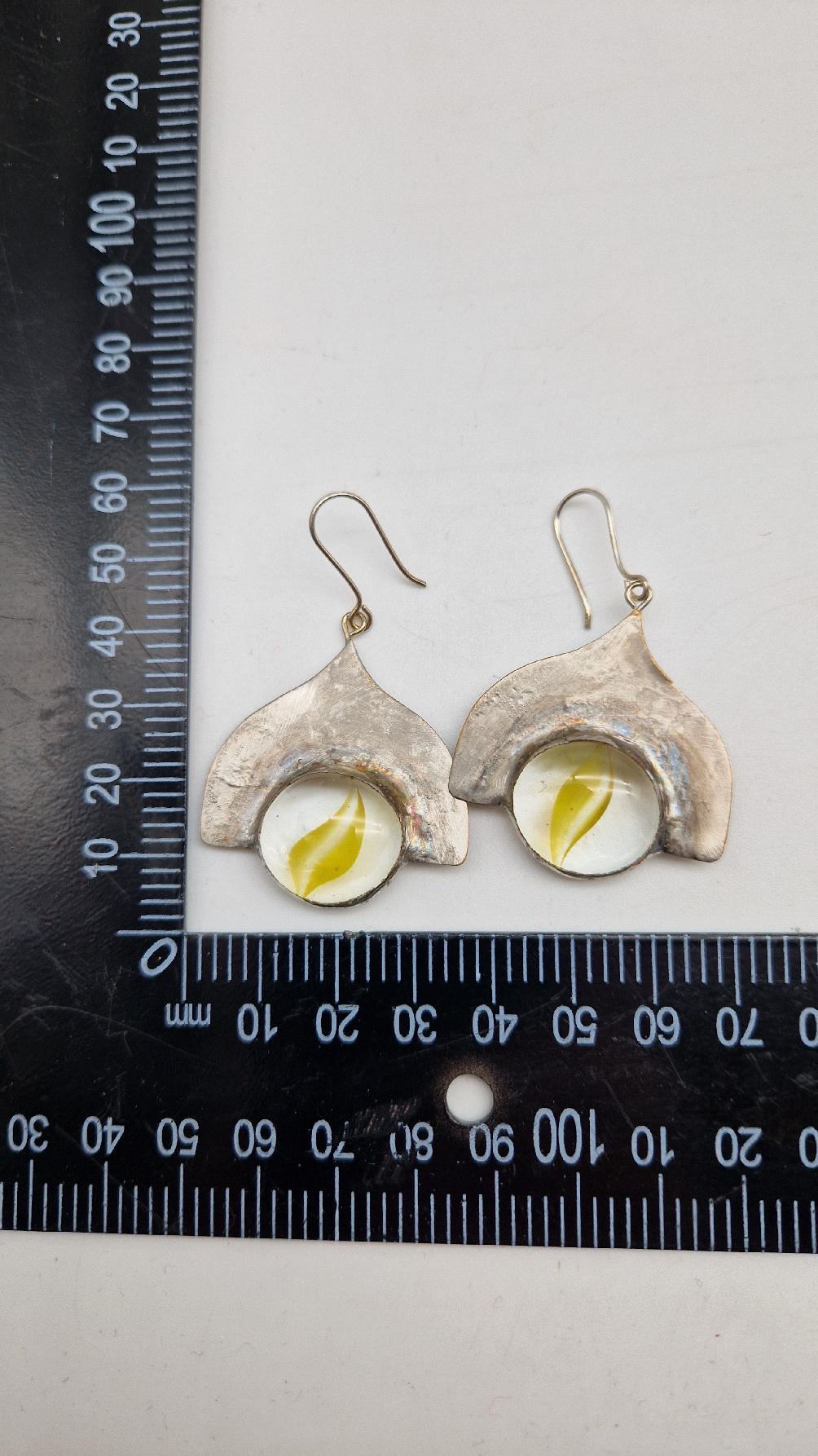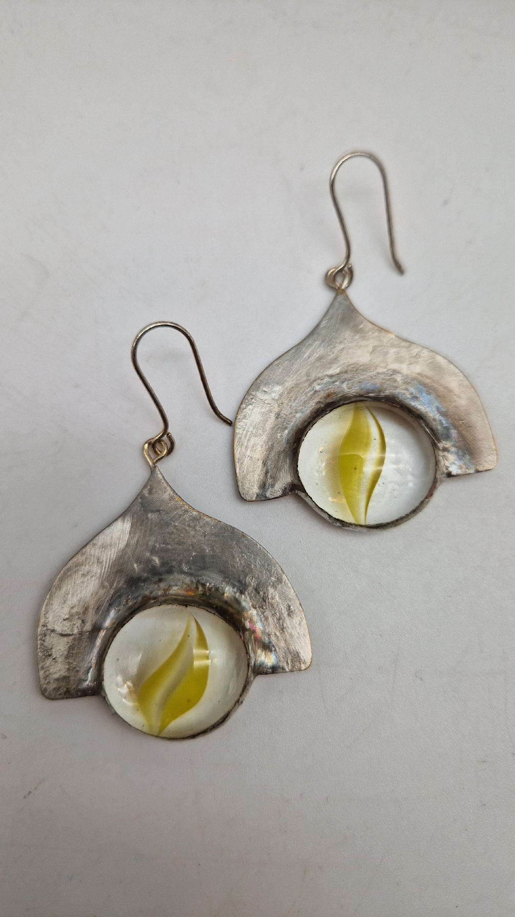 Cudne , niewielkie kolczyki zrobione z miedzi, srebrzone i patynowane z przezroczystym oczkiem ze szkła weneckiego z promieniem słońca wewnątrz…