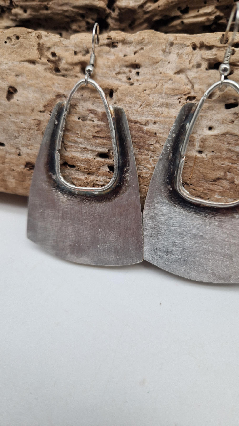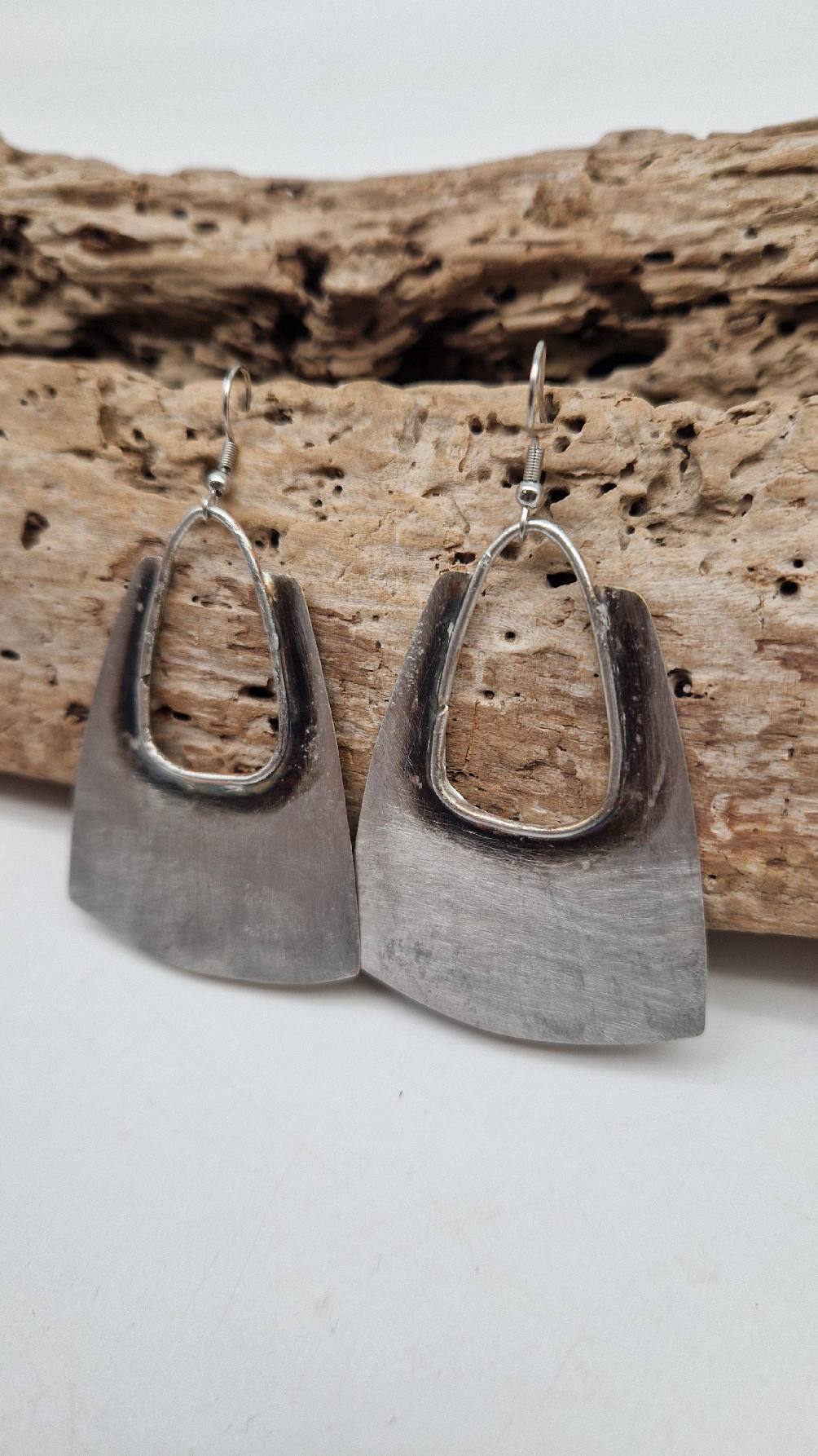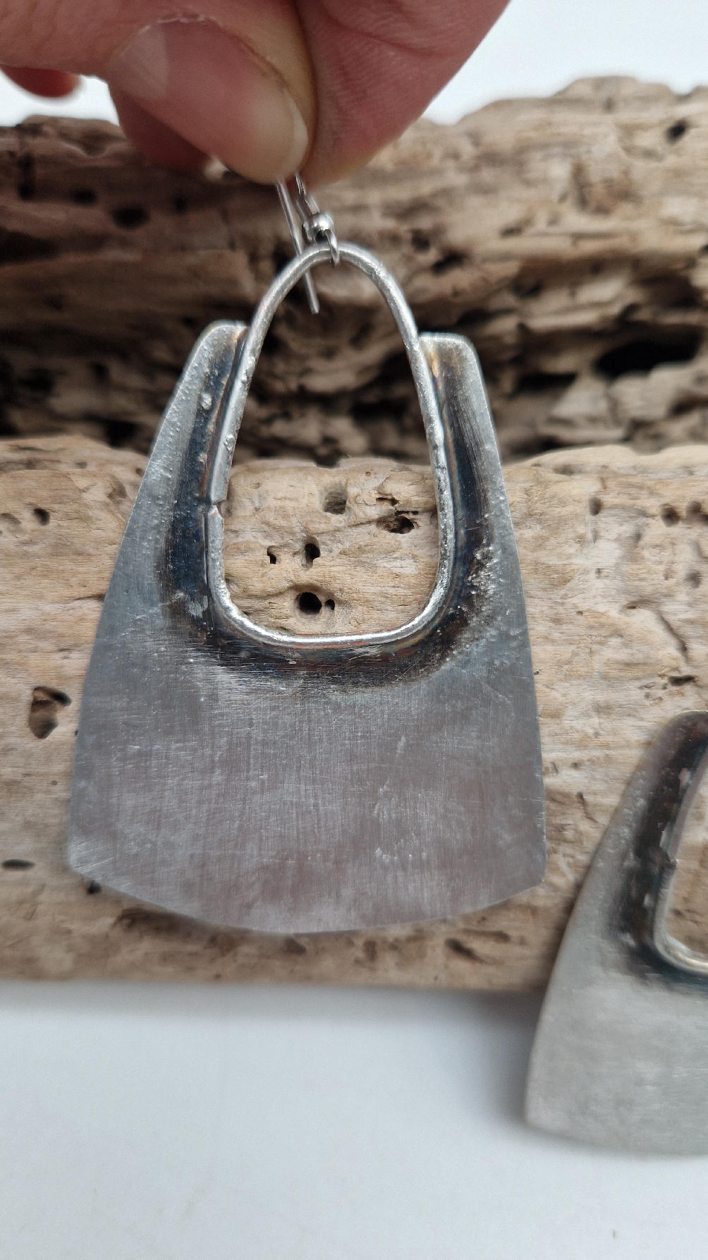 Duże i lekkie kolczyki  w nieoczywistym kształcie, zrobione z miedzi, srebrzone i patynowane lekko na czarno,  są naprawdę urocze, eleganckie, przestrzenne, niebanalne,  tajemnicze , takie wyjątkowe, ale do wszystkiego, cudne!