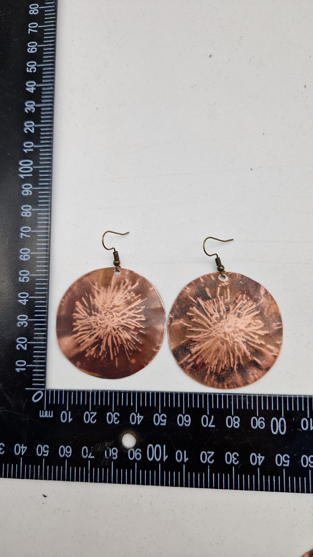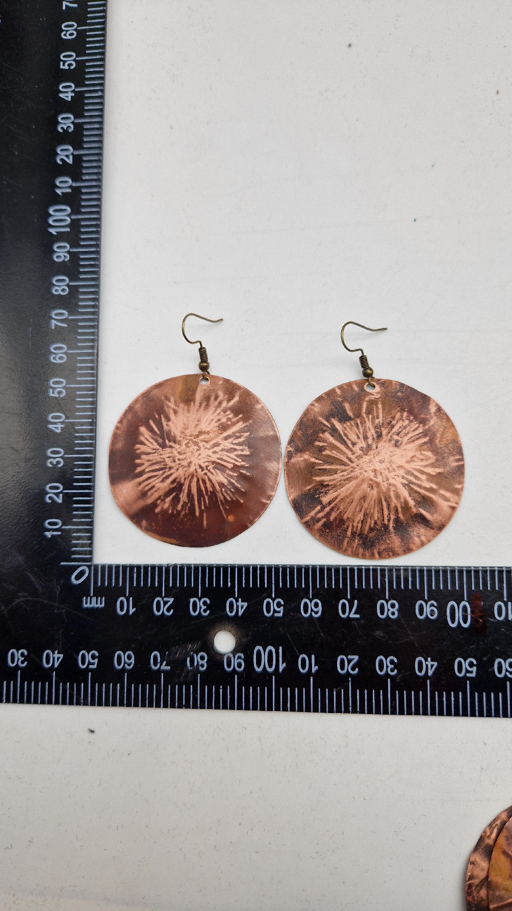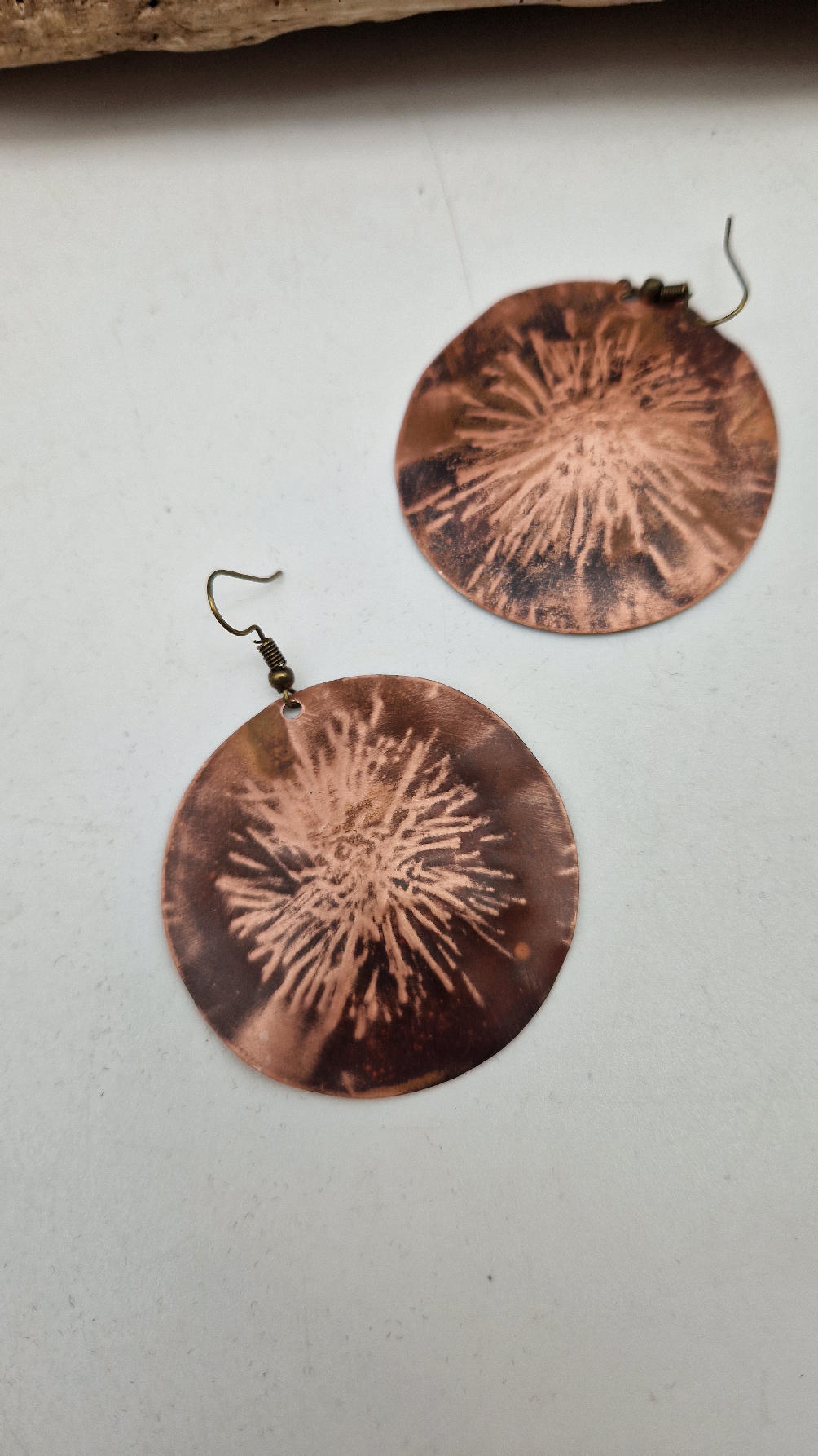 Świetne, megaoryginalne , niby gładkie i okrągłe, ale wypukłe , duże i lekkie kolczyki zrobione z miedzi ,kute, patynowane lekko na czarno, niebanalne,  takie wyjątkowe, ale do wszystkiego, cudne!