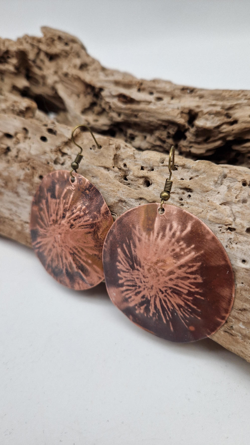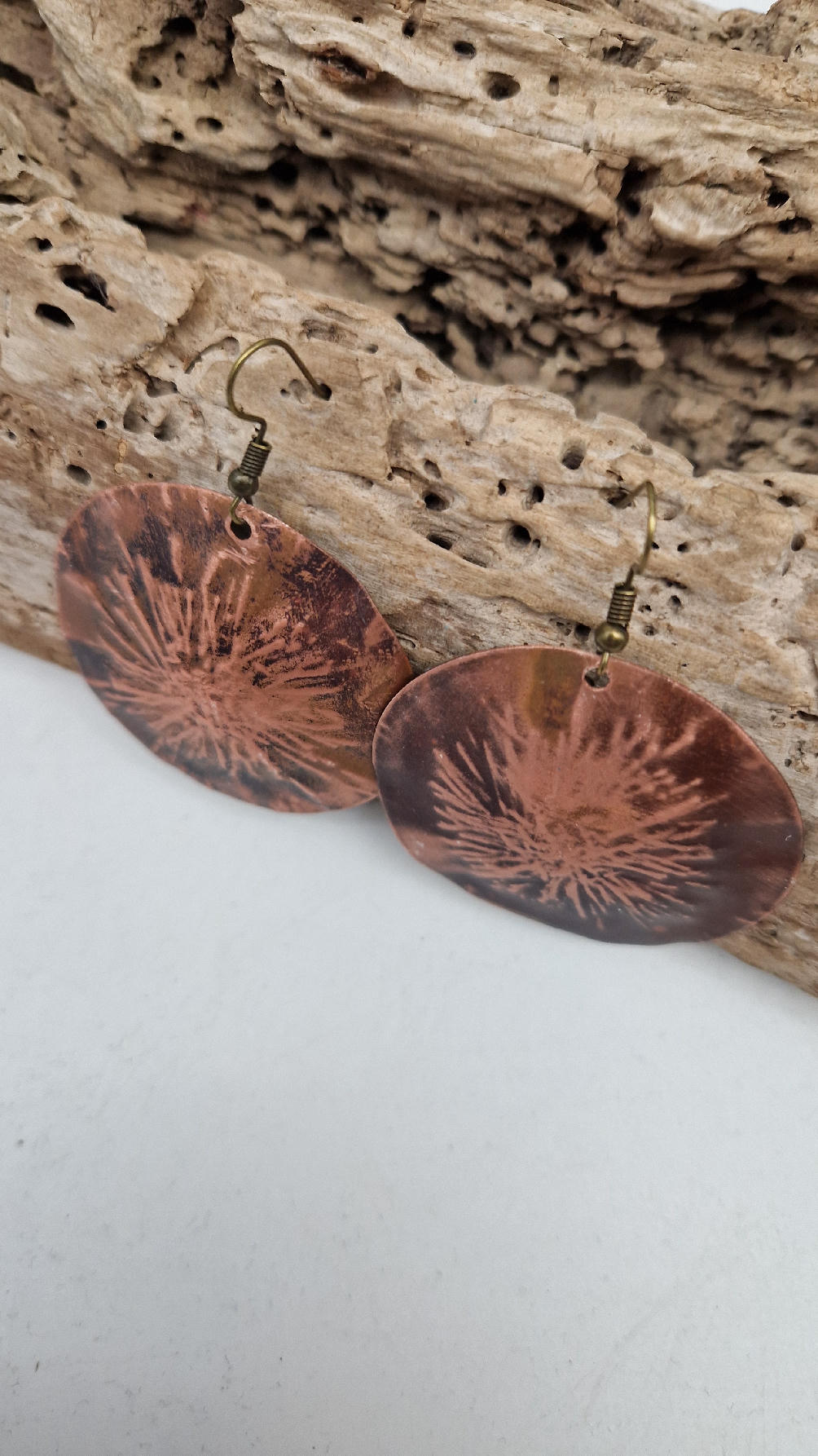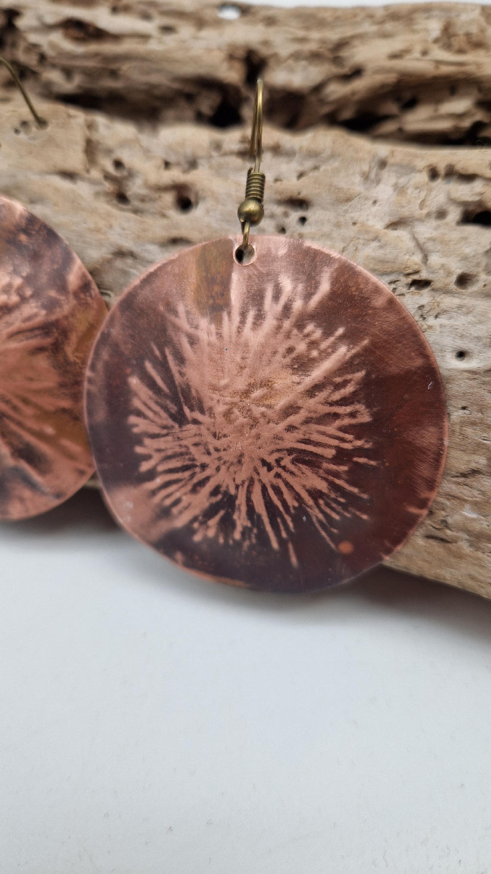 Świetne, megaoryginalne , niby gładkie i okrągłe, ale wypukłe , duże i lekkie kolczyki zrobione z miedzi ,kute, patynowane lekko na czarno, niebanalne,  takie wyjątkowe, ale do wszystkiego, cudne!