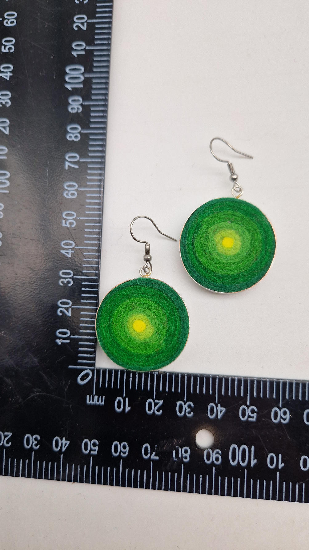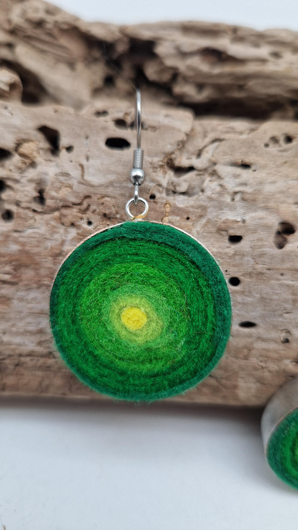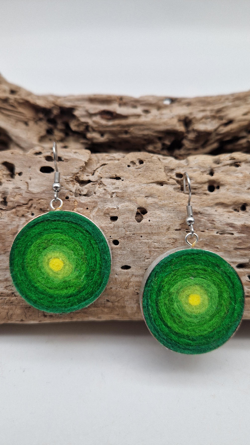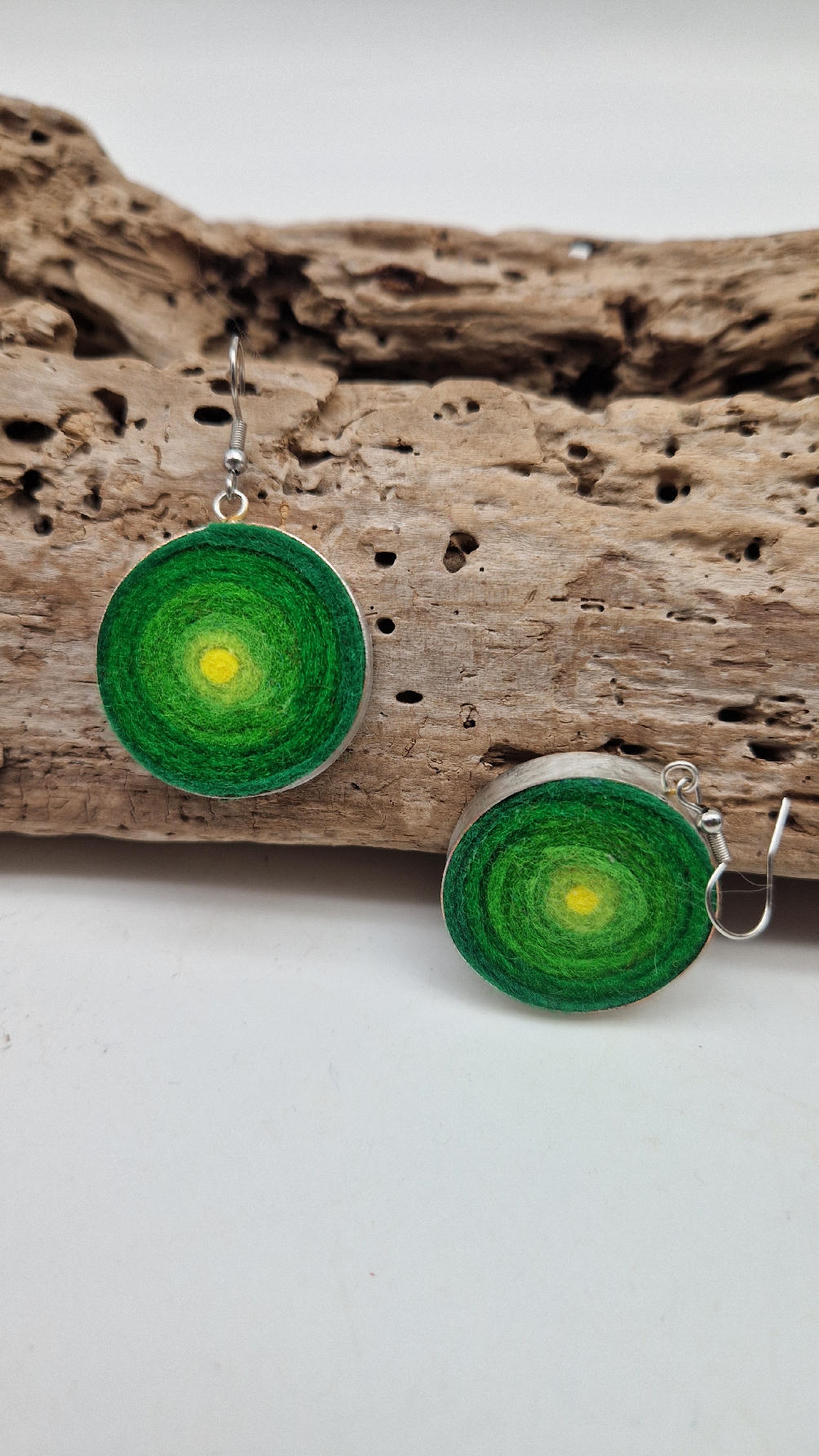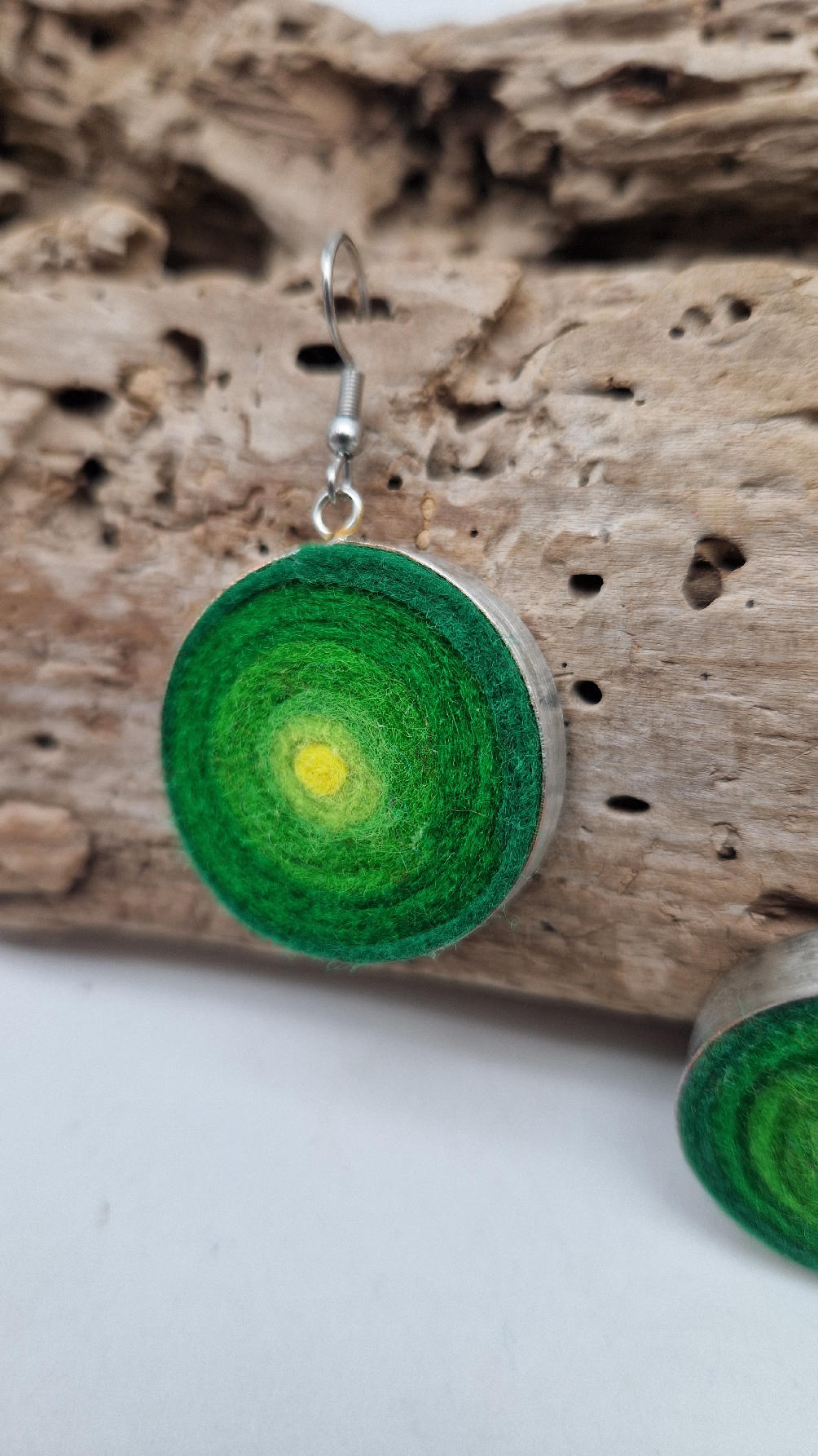 Niewielkie kolczyki w odcieniach soczystej zieleni z jasnym jak słońce środkiem, zakręcone z filcu, osadzone w niewielkiej metalowej puszeczce…cudne, urocze, radosne…