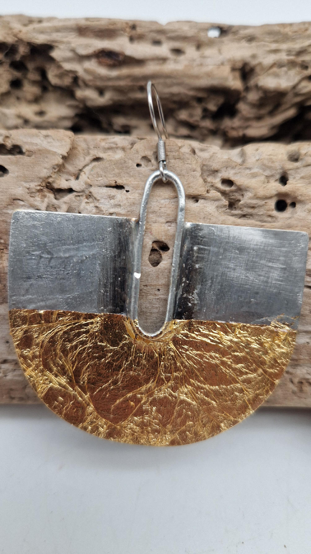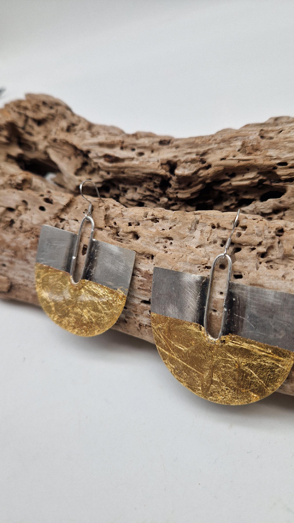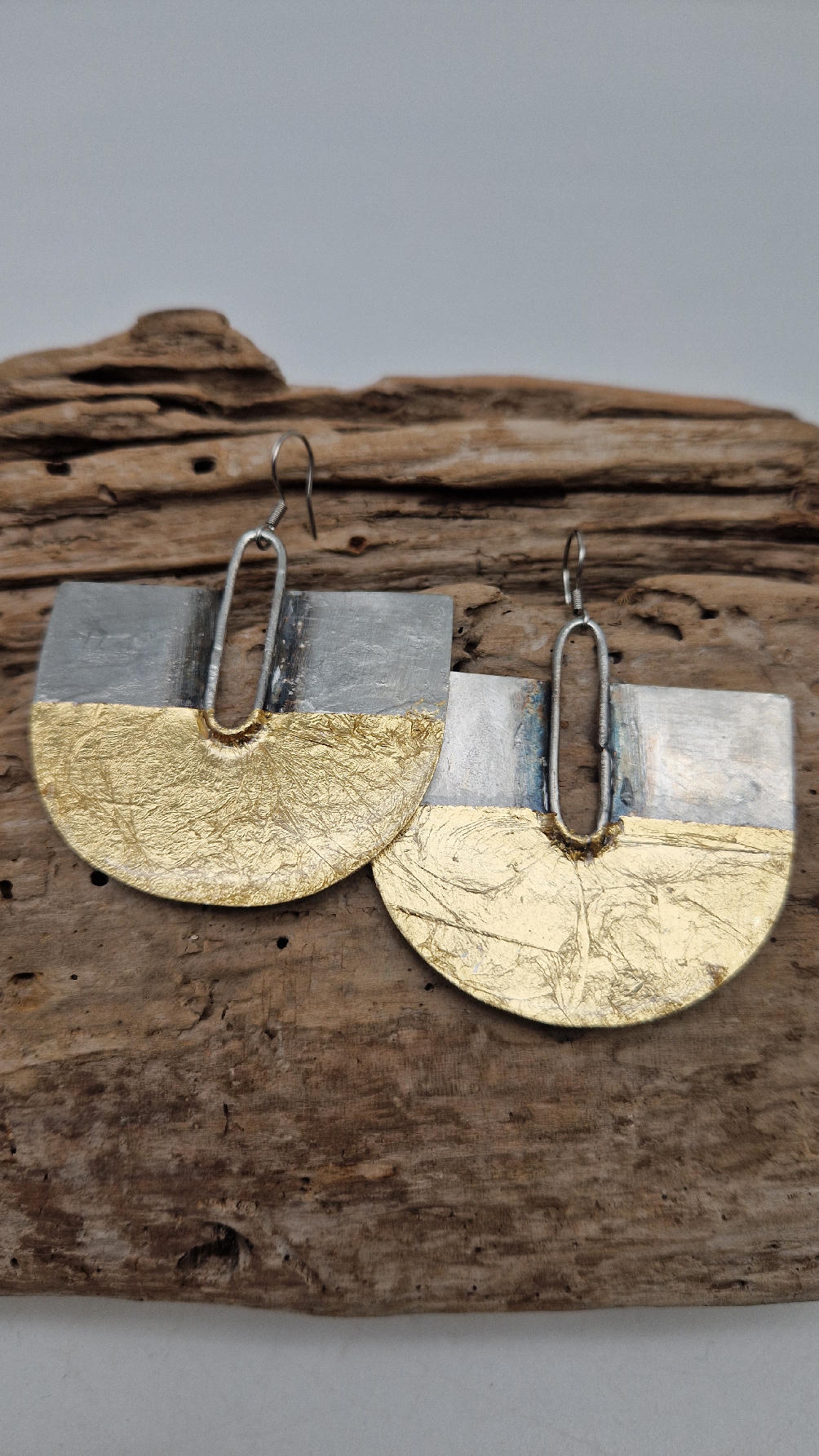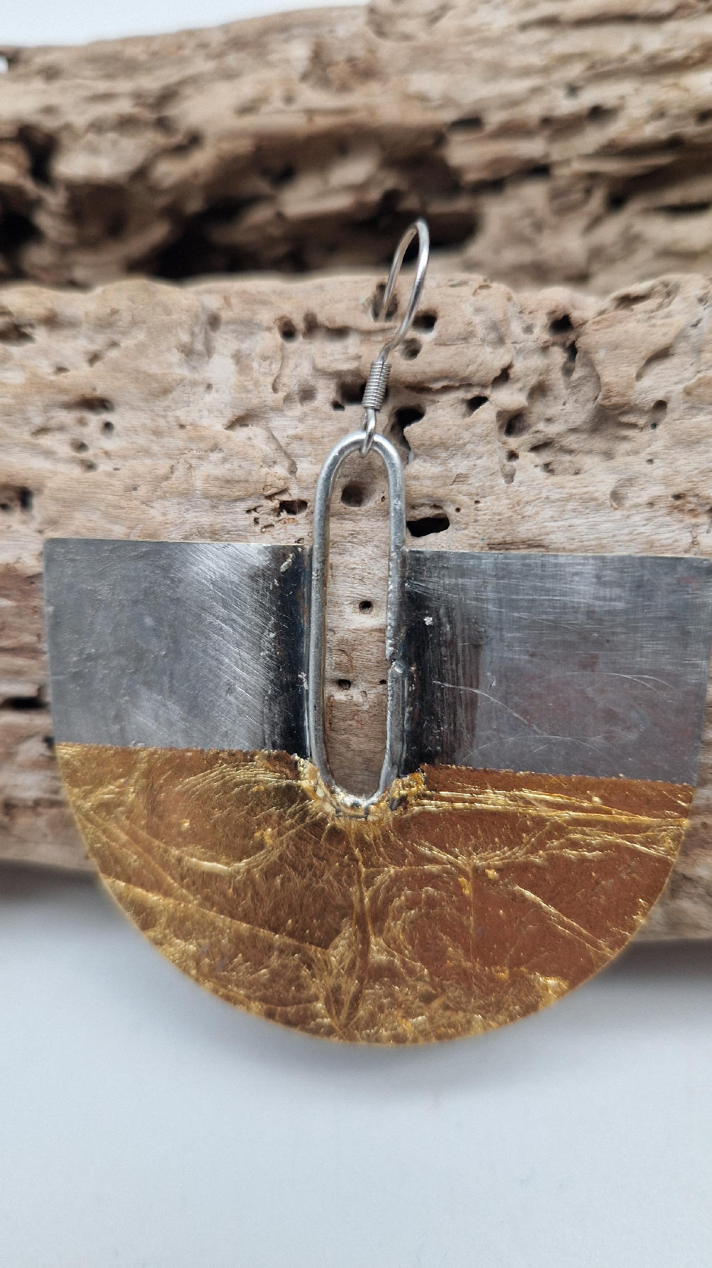 Duże i lekkie kolczyki w nieoczywistym kształcie, zrobione z miedzi, srebrzone i patynowane lekko na czarno, z ociupiną szlag metalu, czyli złota w płatkach, są naprawdę urocze, eleganckie… kolczyki są przestrzenne, niebanalne, tajemnicze , takie wyjątkowe, ale do wszystkiego, cudne!