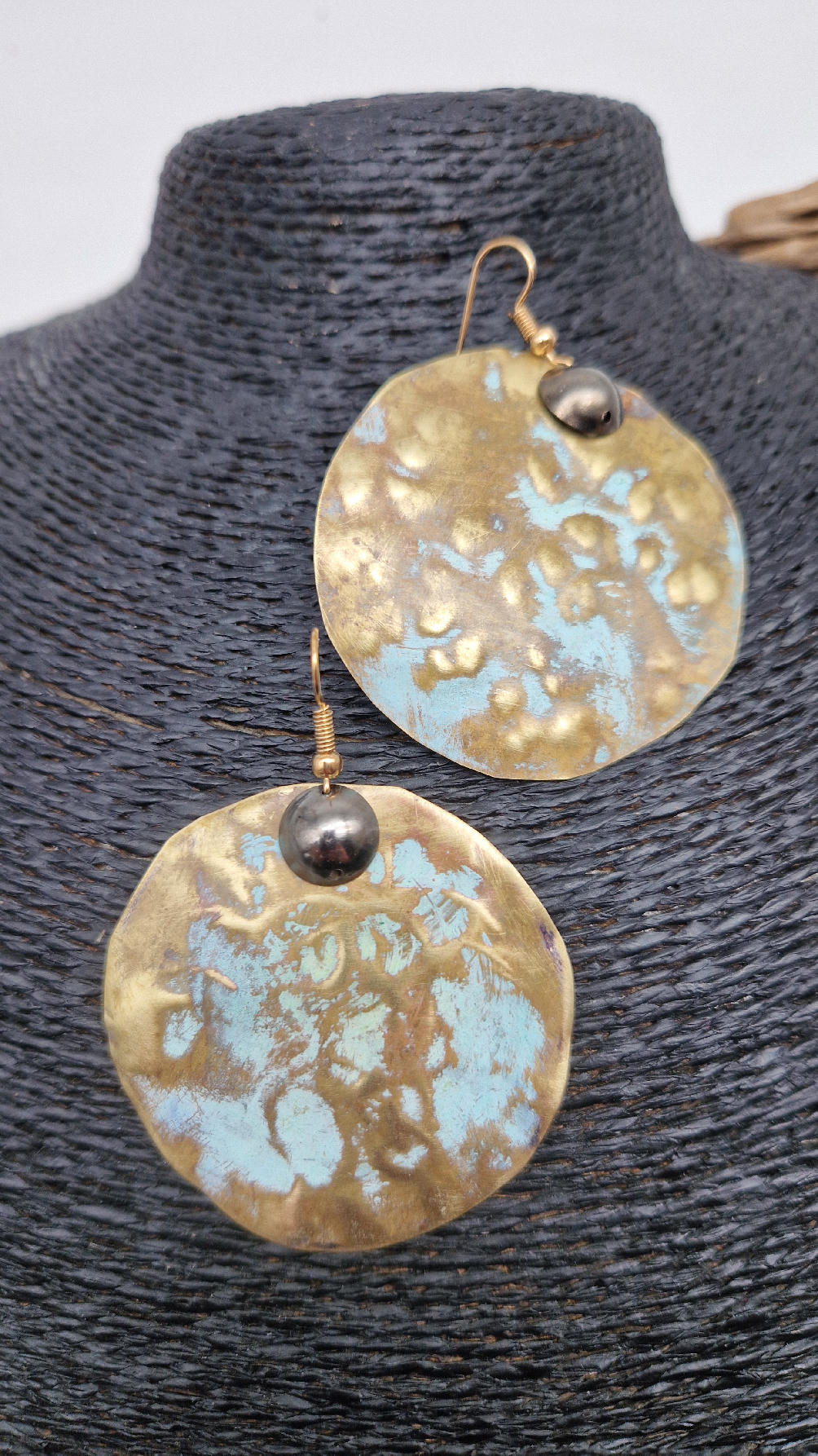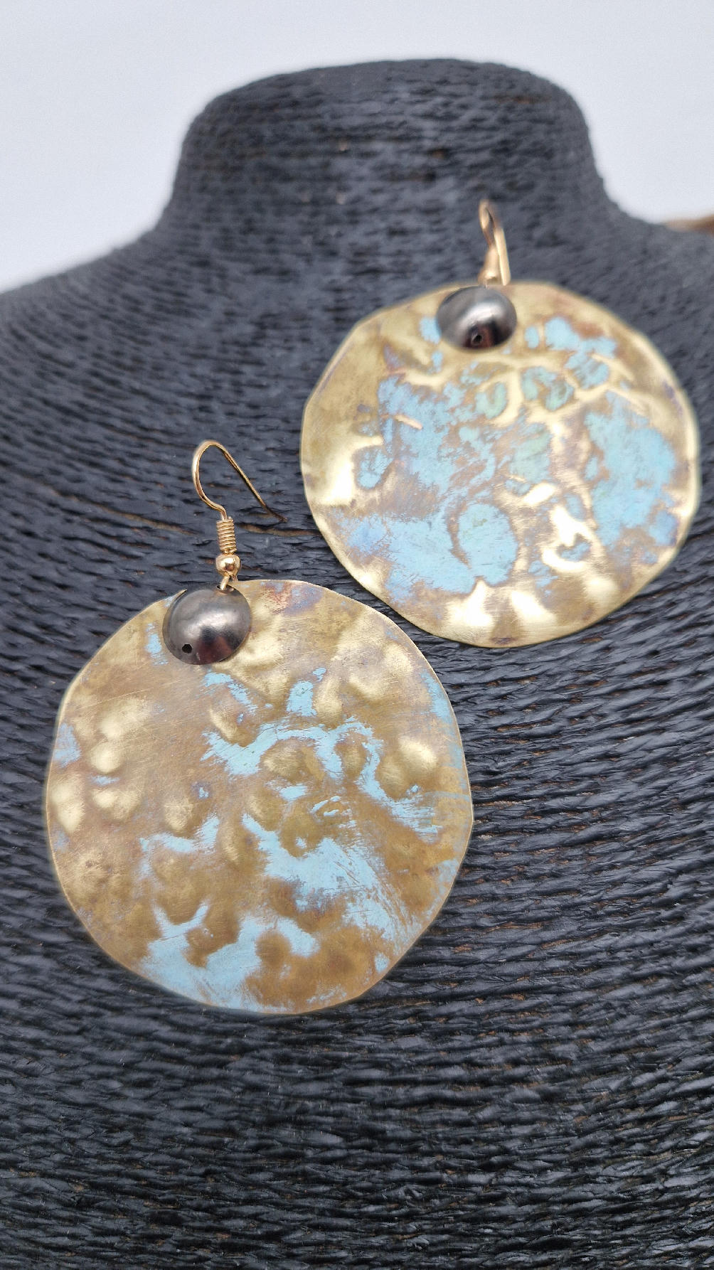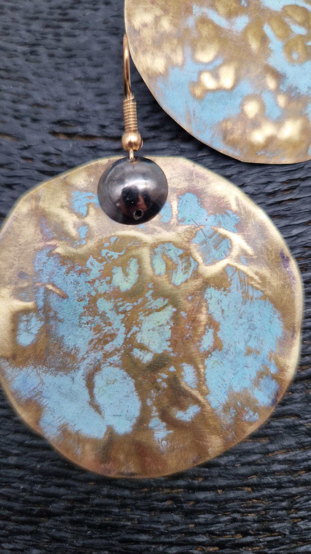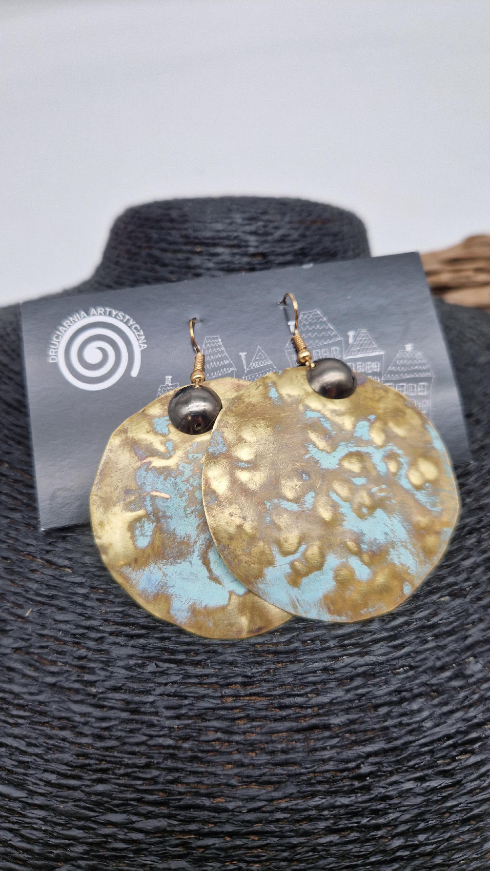 Duże i niebanalne mosiężne kolczyki z niewielkim grafitowym oczkiem, kute i patynowane na zielono, wycinane ręcznie …. piękne jak księżyc w pełni …cudne, niebłyszczące, eleganckie i zawadiackie, świetne jako ,,komplet” do wisiorów .