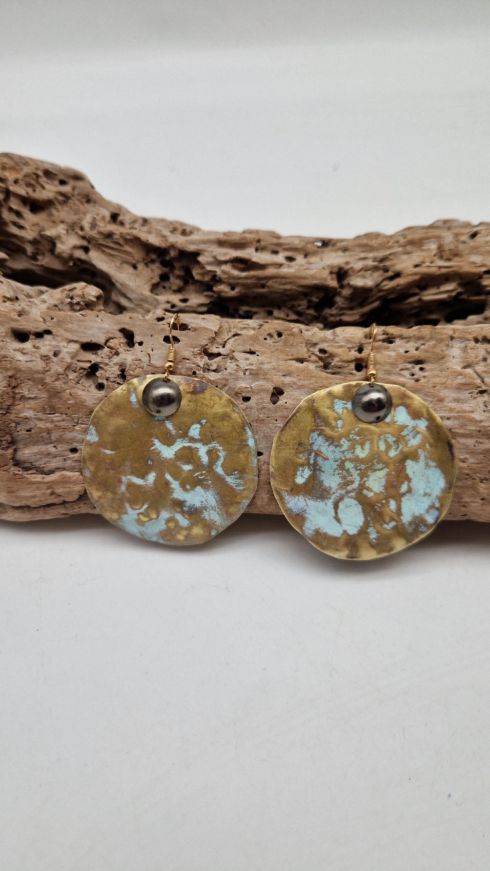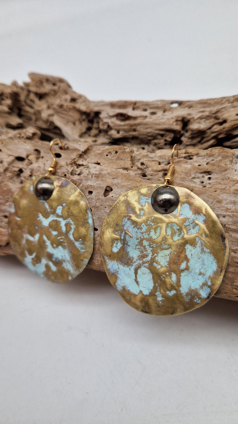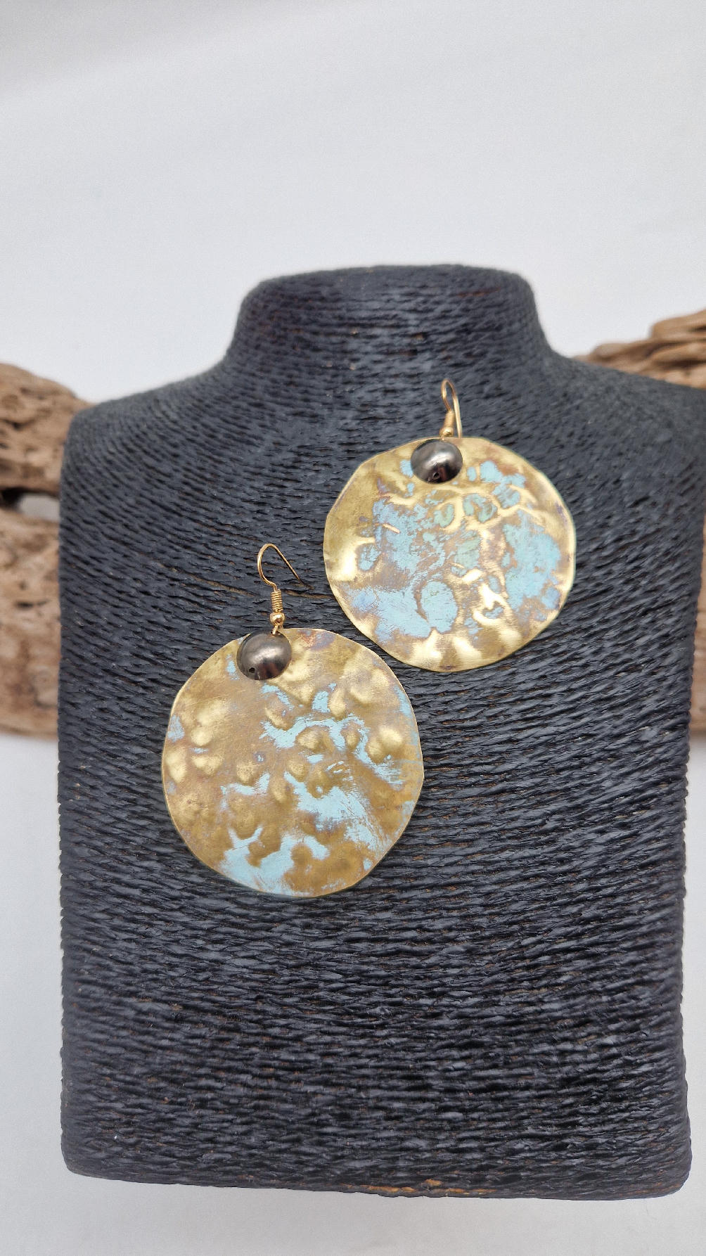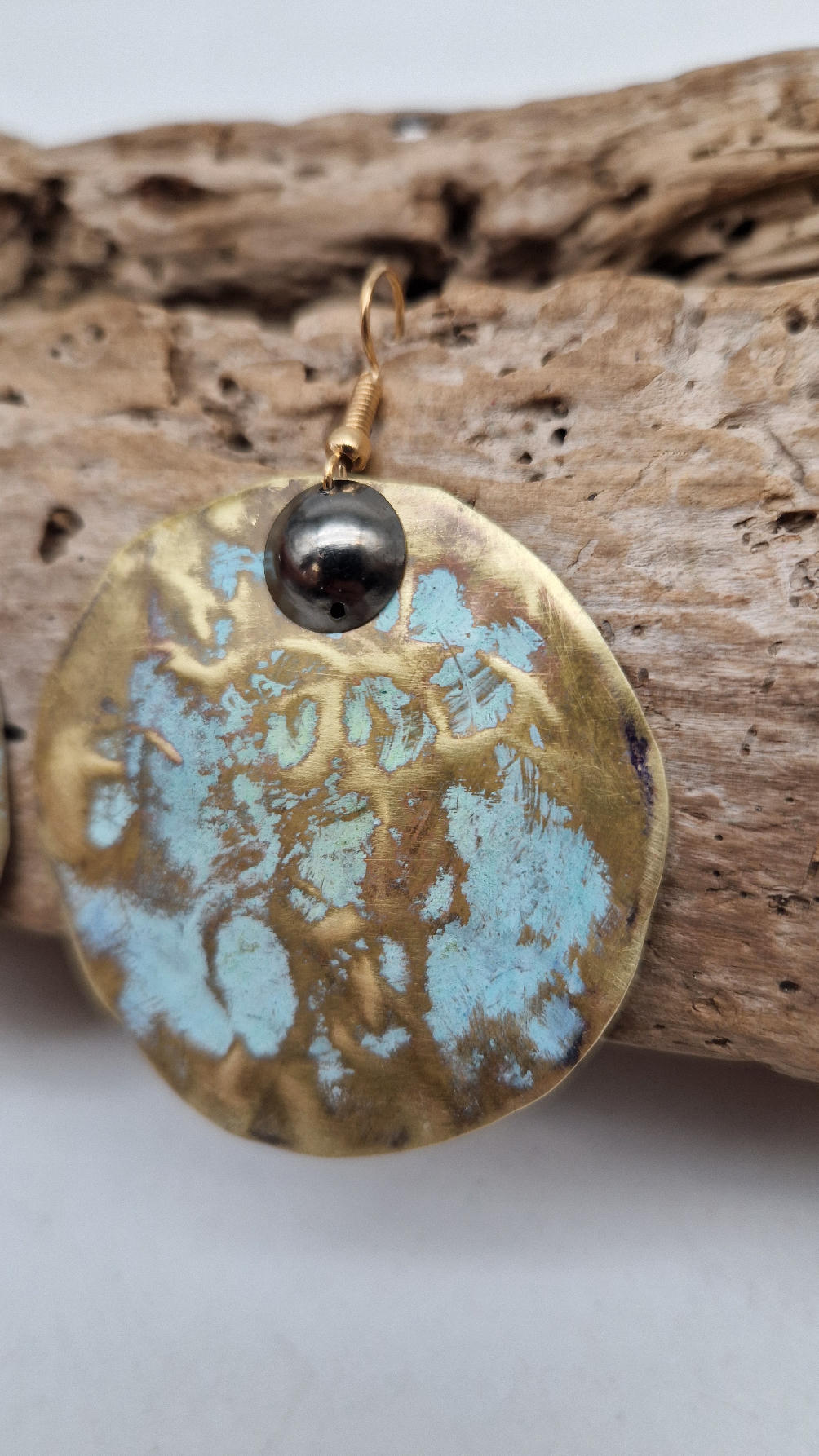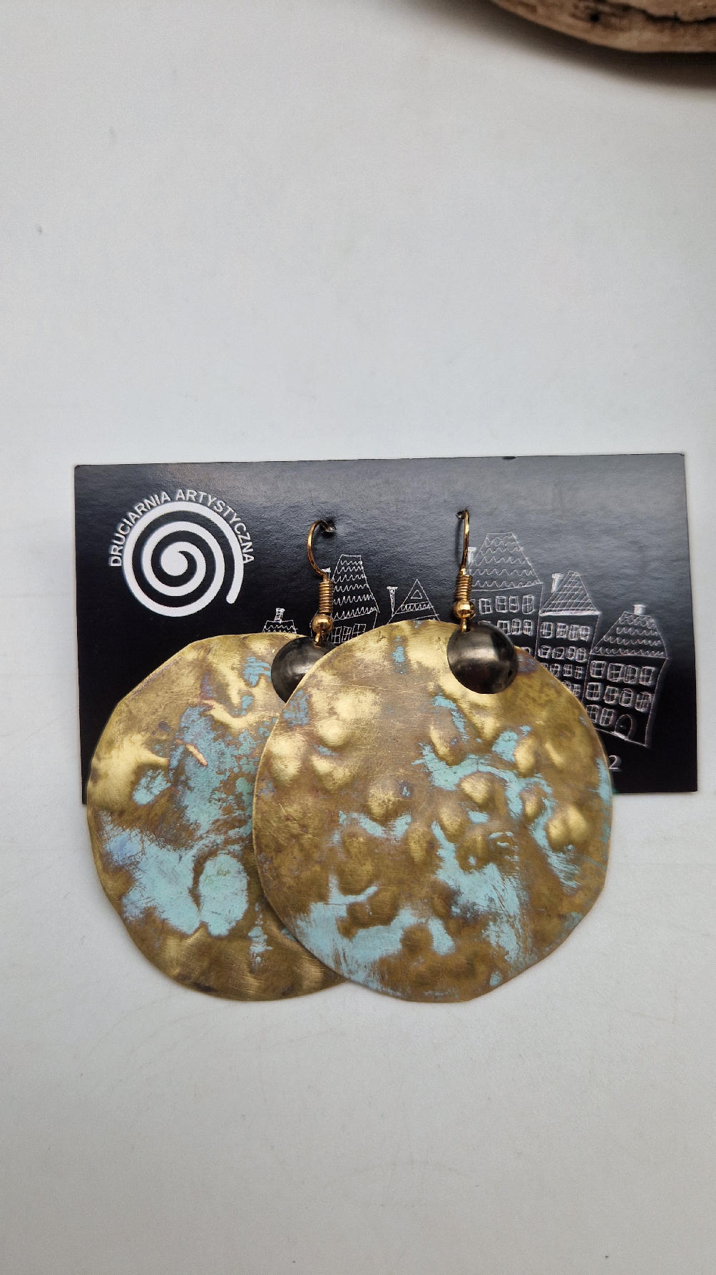 Duże i niebanalne mosiężne kolczyki z niewielkim grafitowym oczkiem, kute i patynowane na zielono, wycinane ręcznie …. piękne jak księżyc w pełni …cudne, niebłyszczące, eleganckie i zawadiackie, świetne jako ,,komplet” do wisiorów .